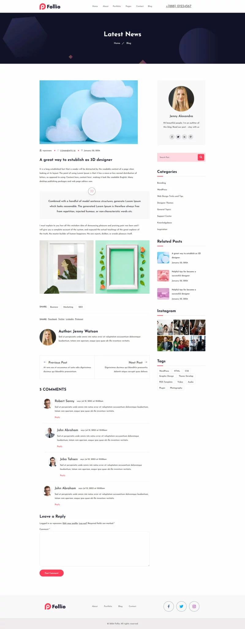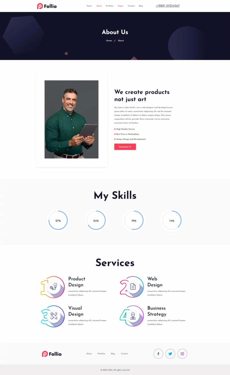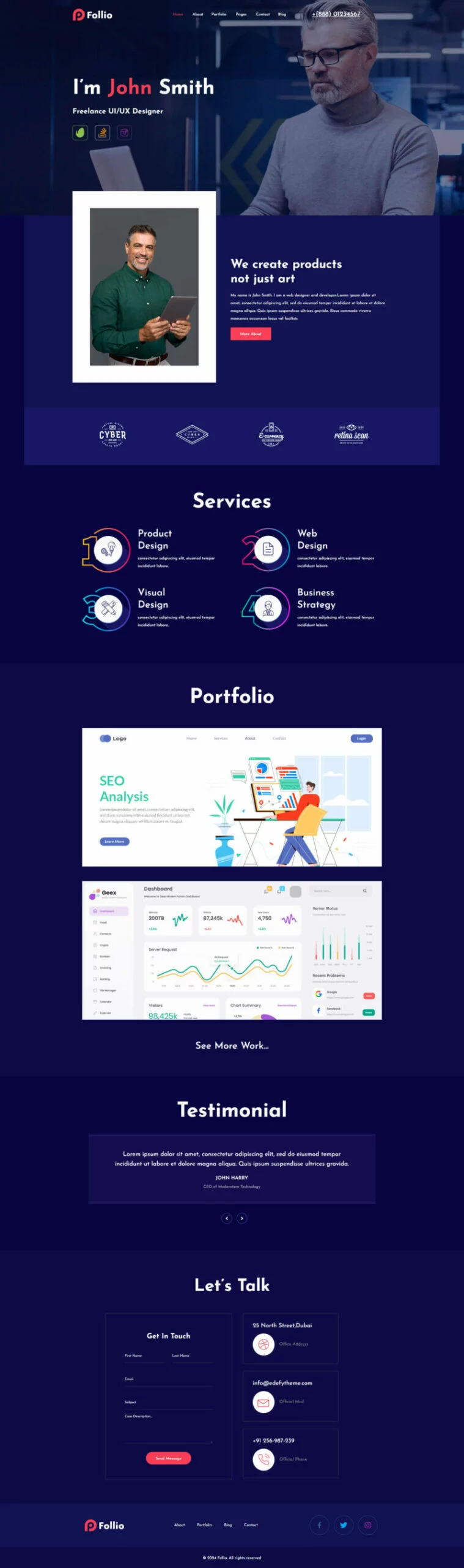 Follio یک راهحل ایدهآل برای کسانی است که میخواهند رزومه و نمونه کارهای خود را با طراحی حرفهای و کاربرپسند به نمایش بگذارند. با Follio میتوانید بهسرعت و بهآسانی وبسایت خود را راهاندازی کنید و با استفاده از طرحبندیهای مختلف، مهارتها و پروژههای خود را به نمایش بگذارید. این قالب مناسب برای فریلنسرها، طراحان و هر کسی است که به دنبال یک حضور آنلاین قوی است.