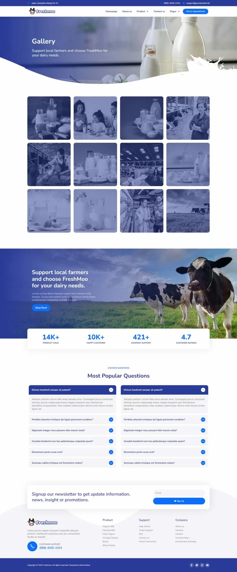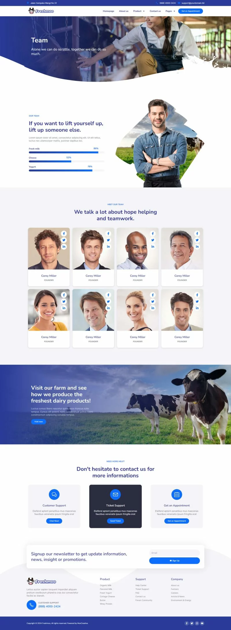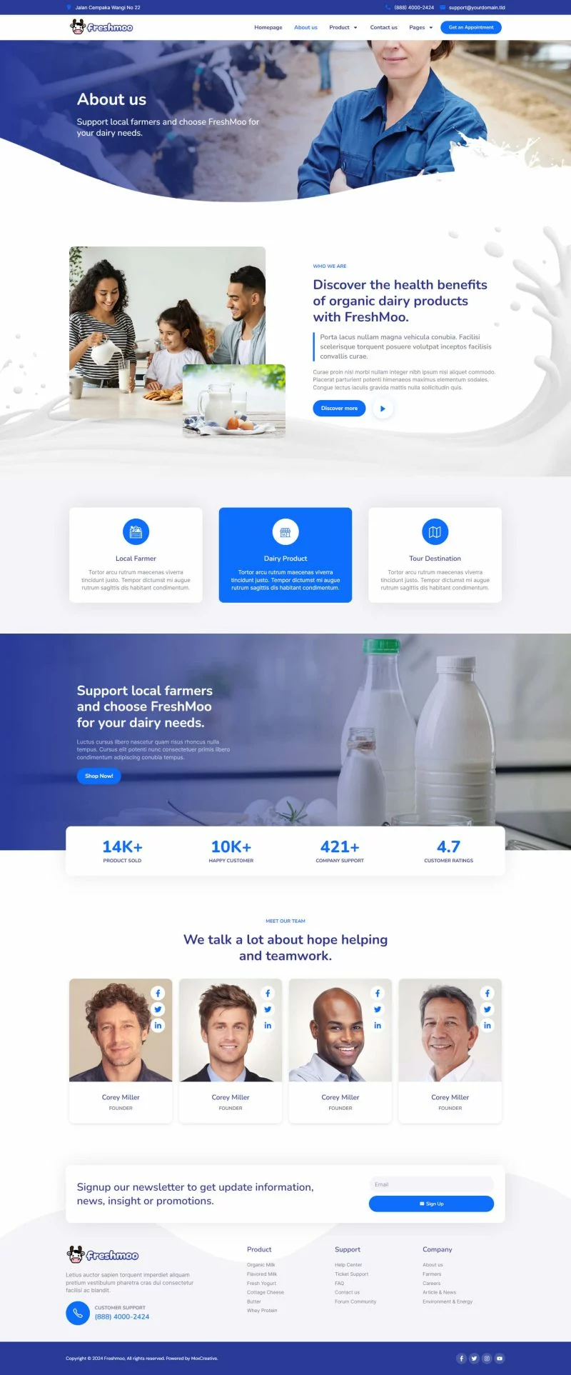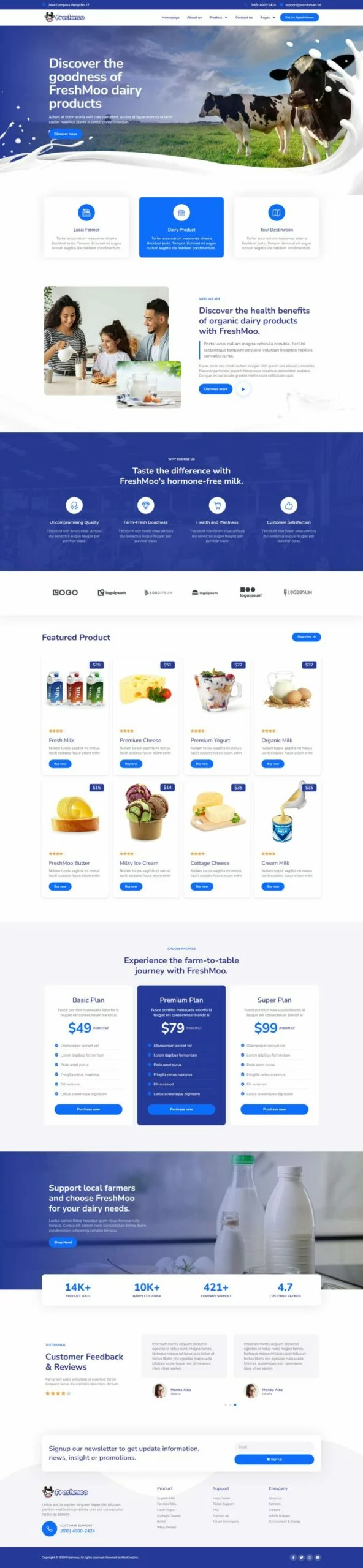 کیت قالب المنتور مزرعه لبنی FreshMoo برای وبسایتهای مرتبط با مزارع لبنی و محصولات تولیدی است. این کیت شامل بیش از 12 قالب از پیشساخته شده با طراحی تمیز و مدرن است. شما میتوانید از کیت قالب المنتور مزرعه لبنی FreshMoo برای ساخت هر نوع وبسایت مرتبط با مزارع لبنی، مانند مزرعه شیر، شرکت تولید شیر، تولید پنیر، بازار لبنیات و غیره استفاده کنید.