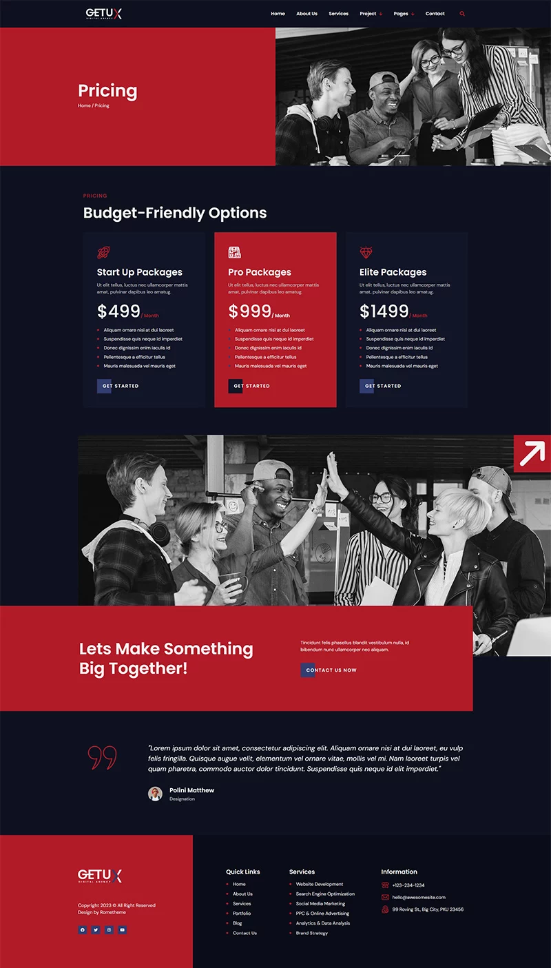 صفحه اصلی، درباره ما، خدمات، پروژه، جزئیات پروژه، قیمتگذاری، تیم، سوالات متداول (FAQ)، نظرات مشتریان، وبلاگ، خطای 404، تماس با ما، هدر، فوتر