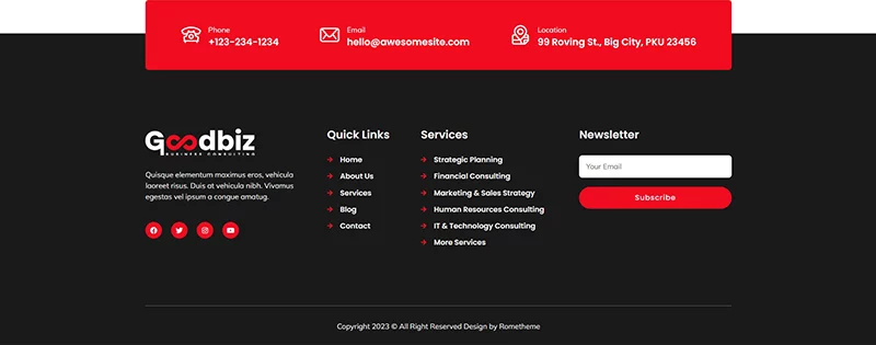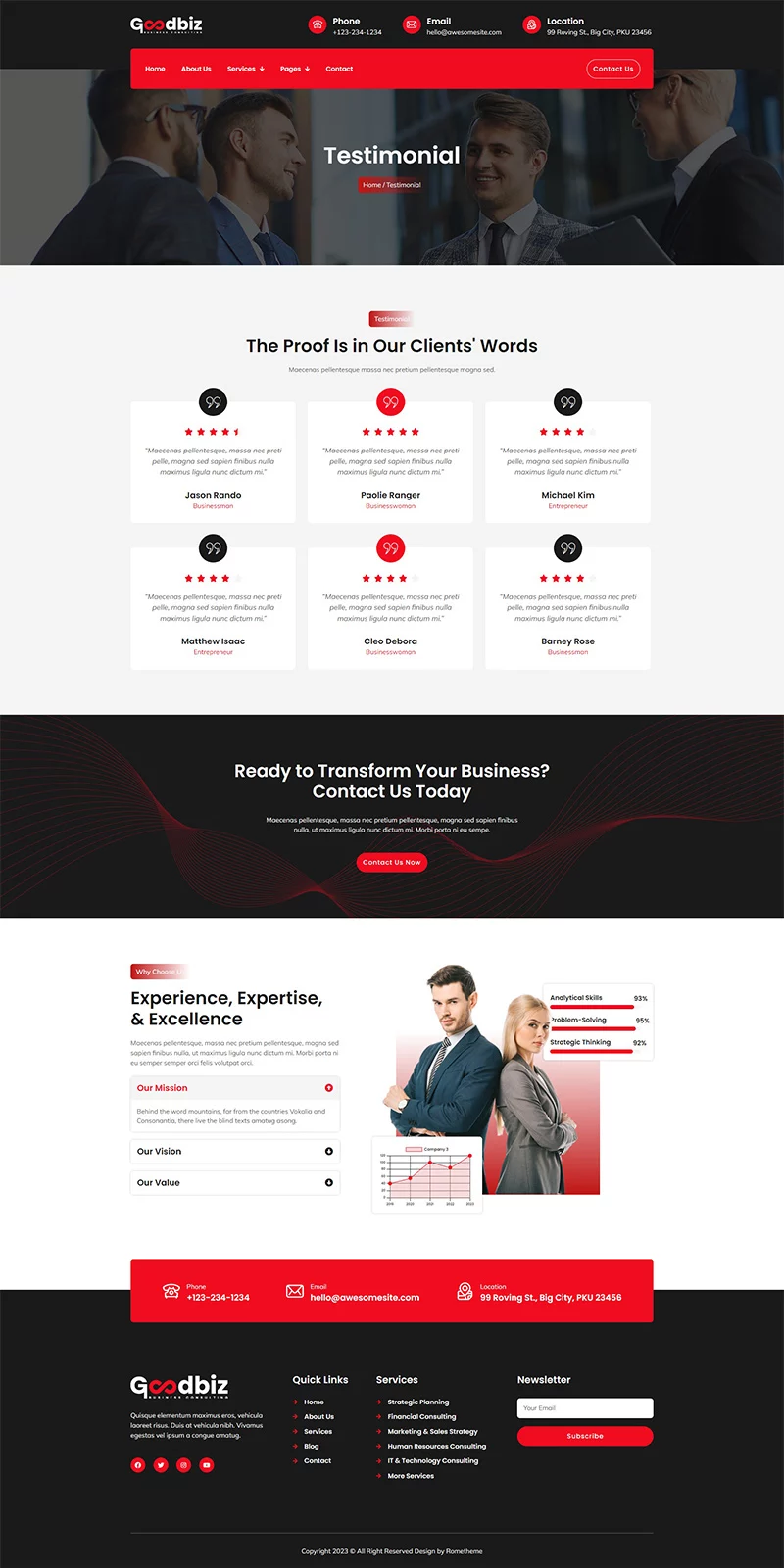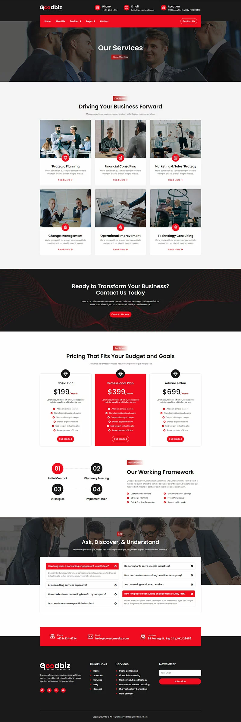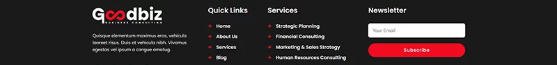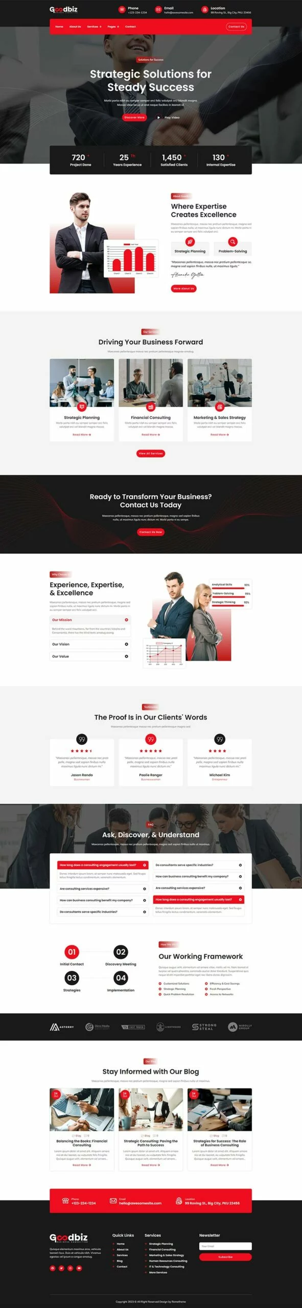 کیت قالب المنتور مشاوره کسب و کار Goodbiz با انتخابی ایدهآل از قالبها برای کسب و کار، خدمات مشاوره، مشاور، مالی، شرکتی، مشاوران مالی، حسابداران، بروکرهای بیمه، آژانس دیجیتال و هر چیزی که به کسب و کارهای دیگر مربوط میشود، ارائه شده است.