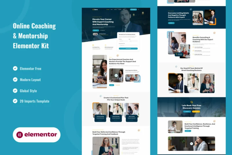 کیت قالب المنتور Goro برای مشاوره آنلاین و منتورینگ، یک مجموعه از چیدمانهای طراحی شده برای افزونه صفحه ساز المنتور وردپرس است. این کیت برای استفاده با نسخه رایگان المنتور به منظور داشتن یک طراحی تمیز و کارآمد ایجاد شده است. این کیت با اکثر قالبها سازگار است و برای استفاده با قالب رایگان Hello Elementor بهینه شده است.