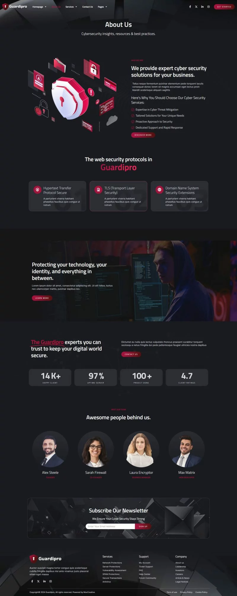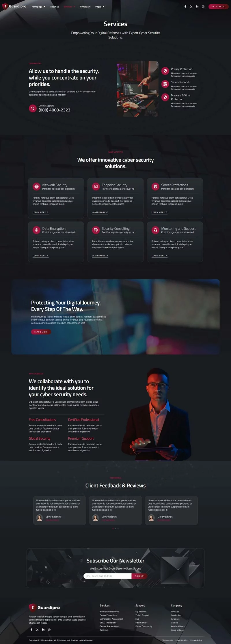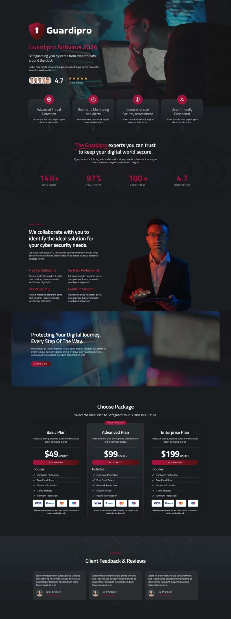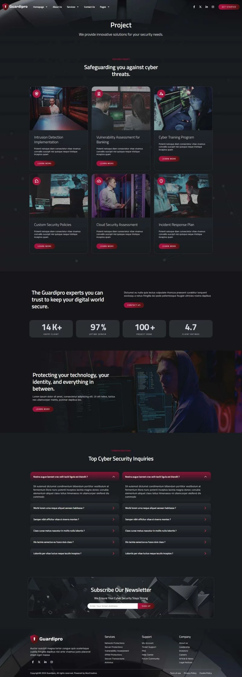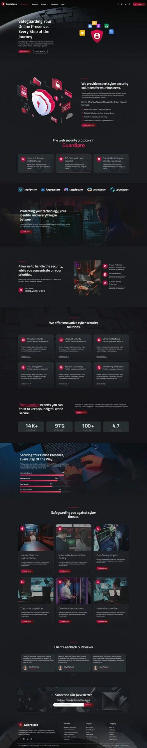 کیت قالب المنتور خدمات امنیت سایبری GuardianPro با طراحی مدرن و سبک منحصربهفرد، مناسب برای هر کسبوکاری است که در زمینه فناوری سایبری و خدمات امنیتی فعالیت میکند. با استفاده از این کیت قالب، میتوانید به راحتی و بدون نیاز به کدنویسی، وبسایتی حرفهای برای شرکتهای ارائهدهنده خدمات امنیت سایبری ایجاد کنید.