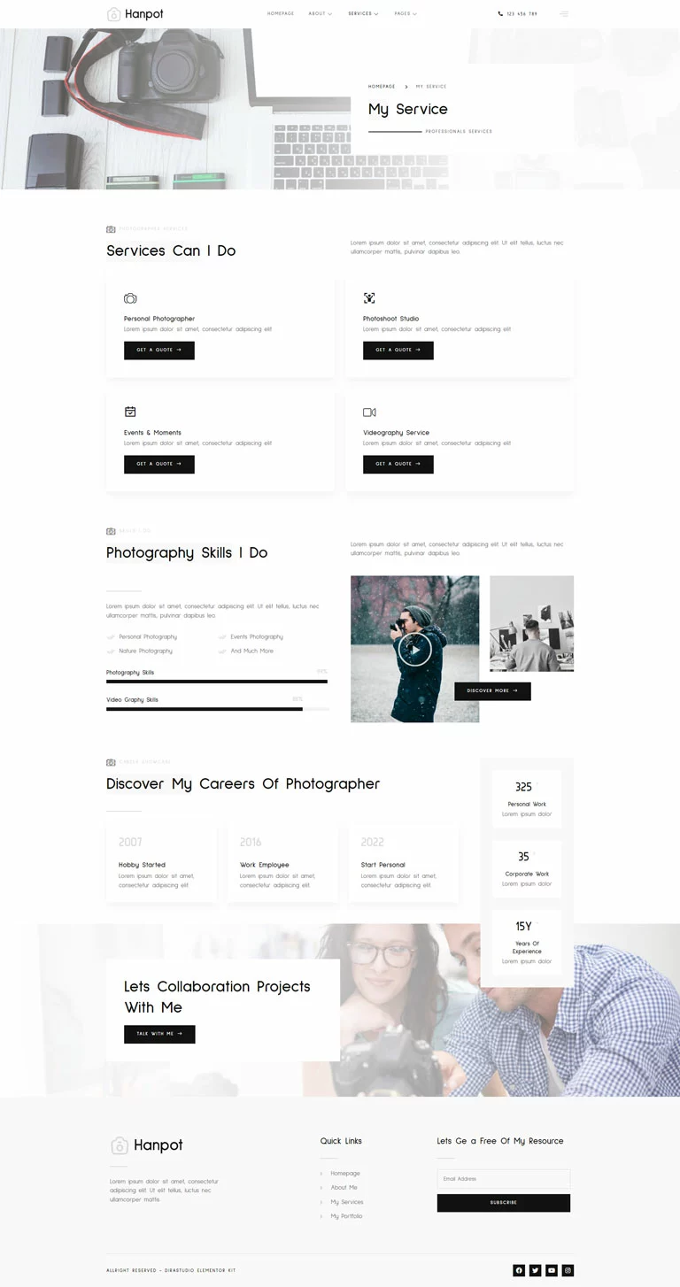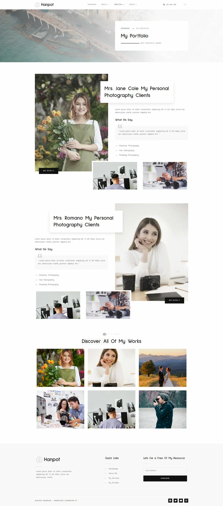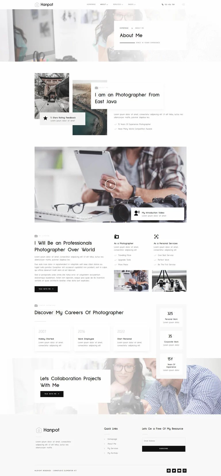 کیت قالب المنتور عکاسی و نمایشگاه نمونه کار Hanpot، مجموعهای از طرحها برای افزونه Elementor Page Builder در وردپرس است که برای استفاده با نسخه رایگان Elementor برای طراحی تمیز طراحی شده است. این کیت با بیشتر تمها کار میکند و برای استفاده با تم رایگان Hello Elementor بهینهسازی شده است.
