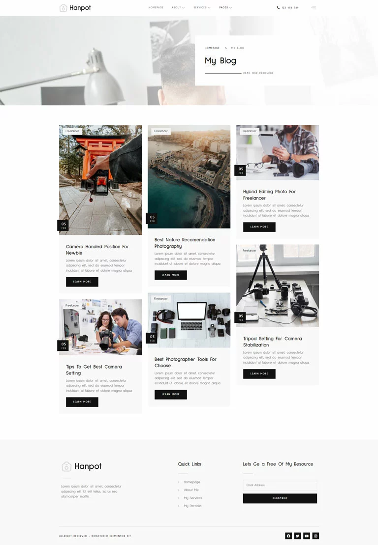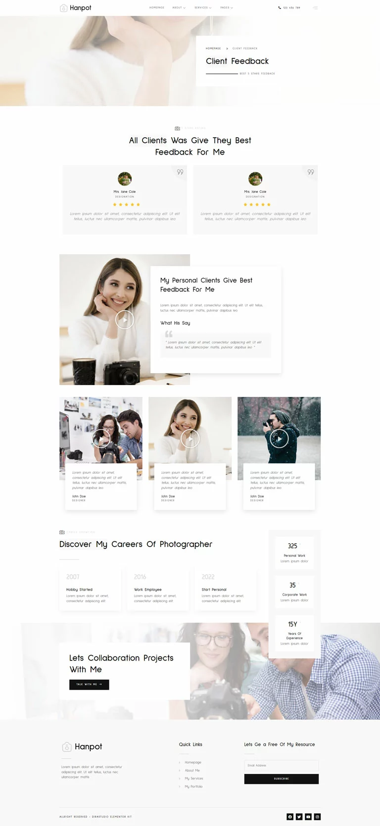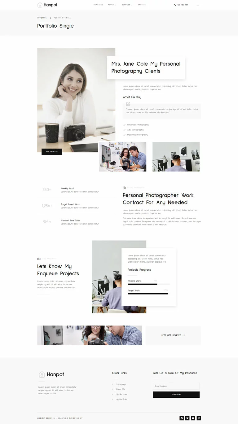کیت قالب المنتور عکاسی و نمایشگاه نمونه کار Hanpot، مجموعهای از طرحها برای افزونه Elementor Page Builder در وردپرس است که برای استفاده با نسخه رایگان Elementor برای طراحی تمیز طراحی شده است. این کیت با بیشتر تمها کار میکند و برای استفاده با تم رایگان Hello Elementor بهینهسازی شده است.
