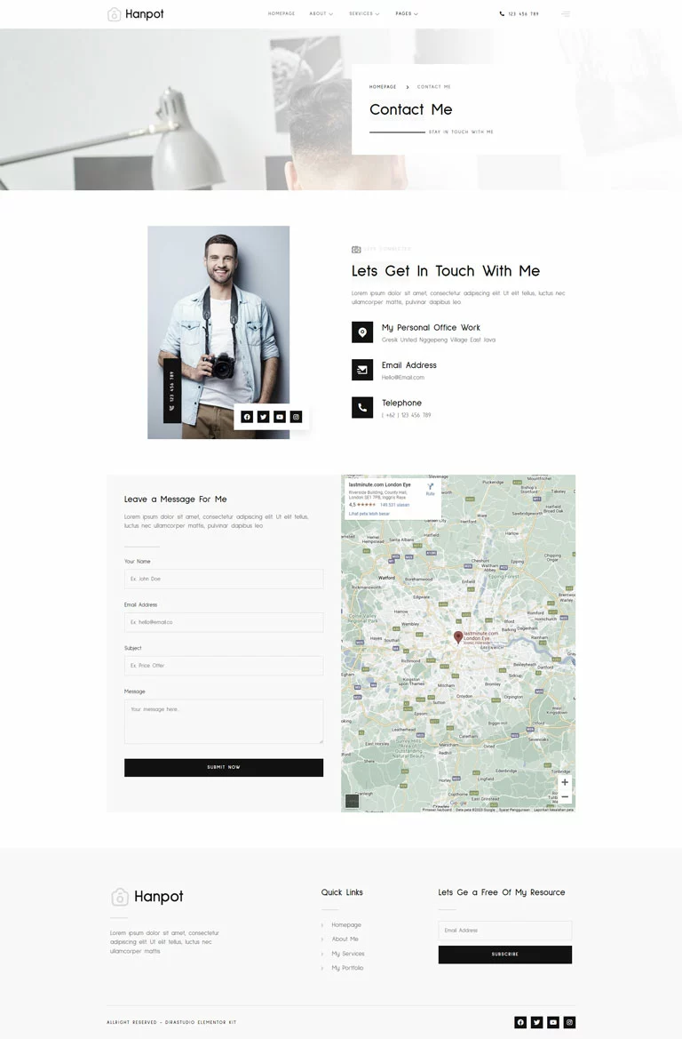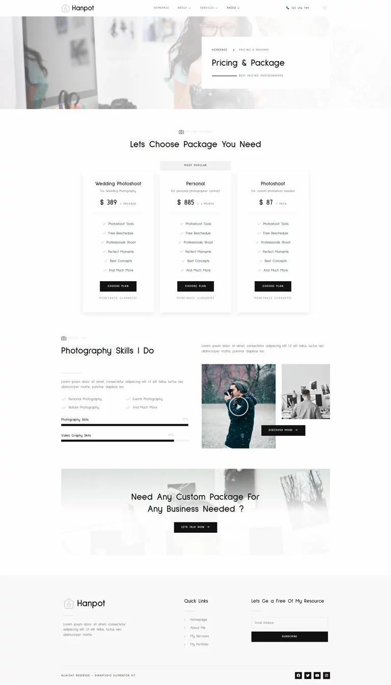 همچنین، این کیت با افزونههای Elements Kit Lite، WP Forms و Exclusive Addons For elementor همراه است که به شما امکان میدهند تا فرمها و ویژگیهای پیشرفتهتری را به وبسایت خود اضافه کنید. با قابلیت سفارشیسازی آسان و بدون نیاز به کدنویسی، کیت قالب المنتور عکاسی و نمایشگاه نمونه کار Hanpot ابزار مناسبی برای عکاسان حرفهای است که میخواهند نمونه کارهای خود را به بهترین شکل ممکن نمایش دهند.