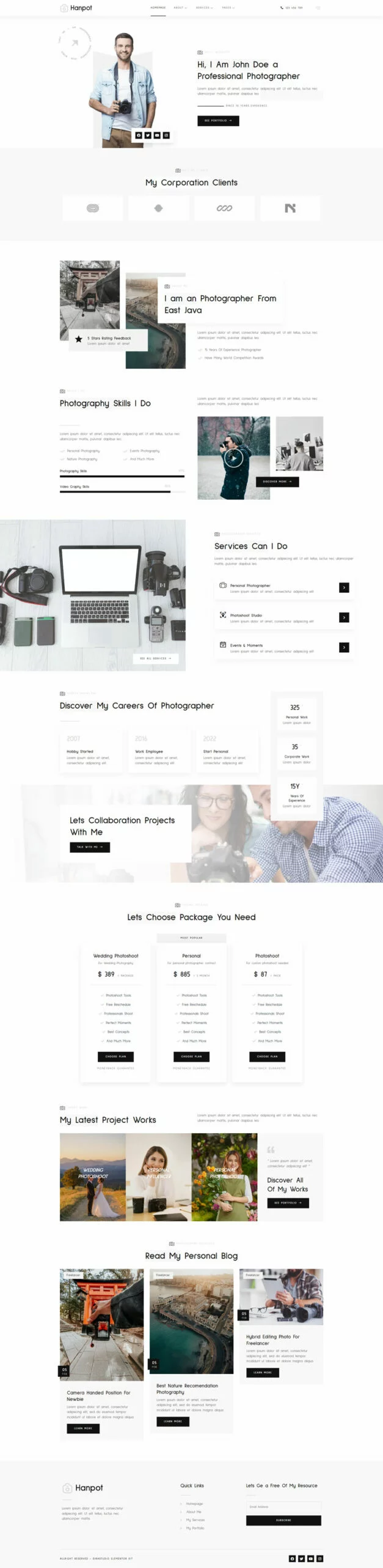 کیت قالب المنتور عکاسی و نمایشگاه نمونه کار Hanpot یک راهکار جامع برای ایجاد وبسایت عکاس شخصی و نمایشگاه نمونه کارها است. با استفاده از طراحی تمیز و مدرن، این کیت به شما اجازه میدهد تا به سرعت یک وبسایت حرفهای و زیبا برای نمایش نمونه کارهای عکاسی خود ایجاد کنید. قالبهای آماده موجود در این کیت شامل صفحه اصلی، درباره من، خدمات، نمونه کارها، بازخورد مشتریان، قیمت و پکیجها، تماس با من، پرسش و پاسخ و صفحات وبلاگ میباشند.