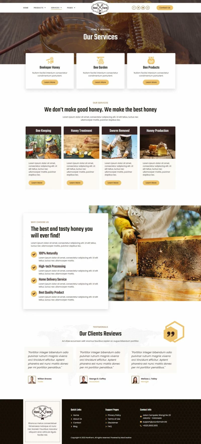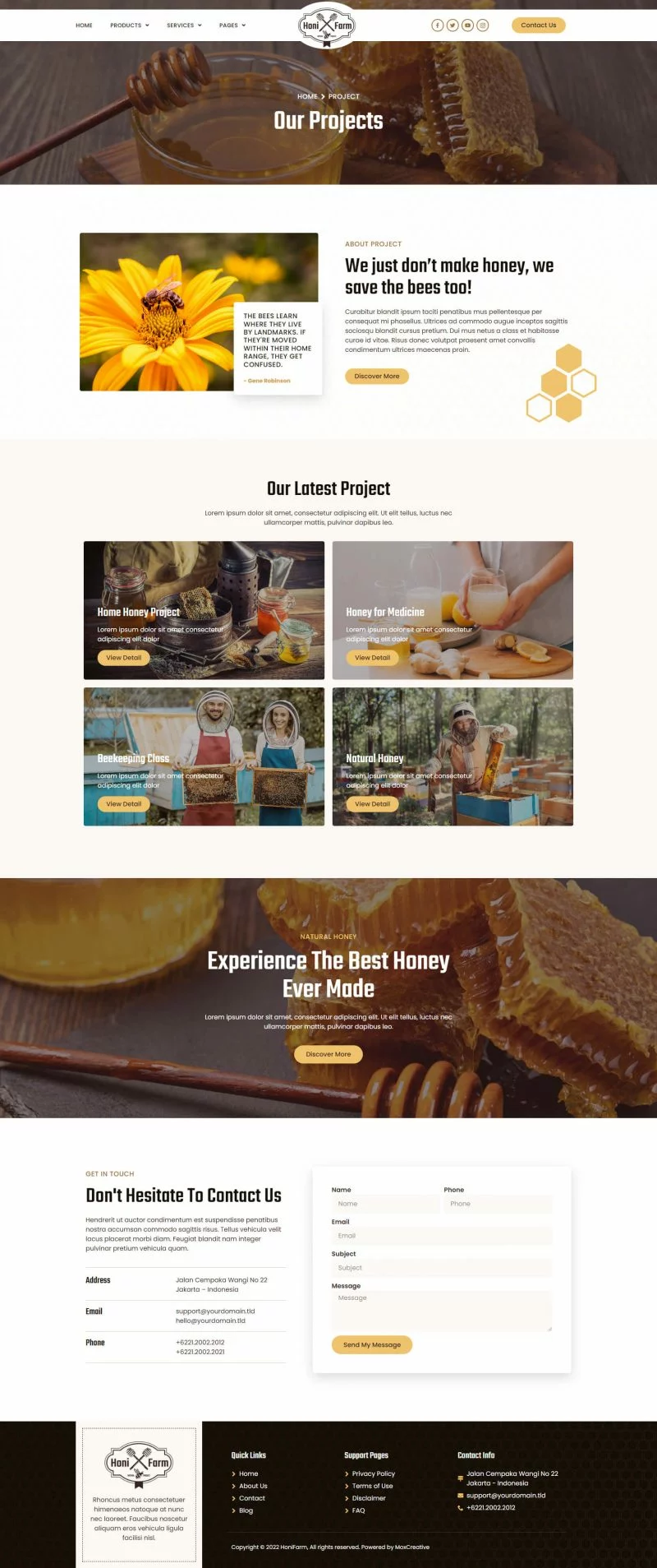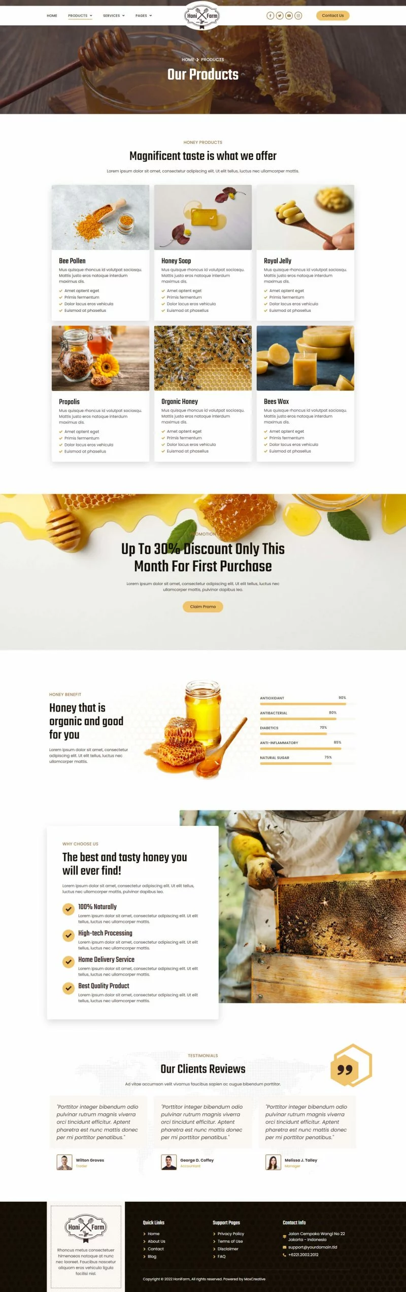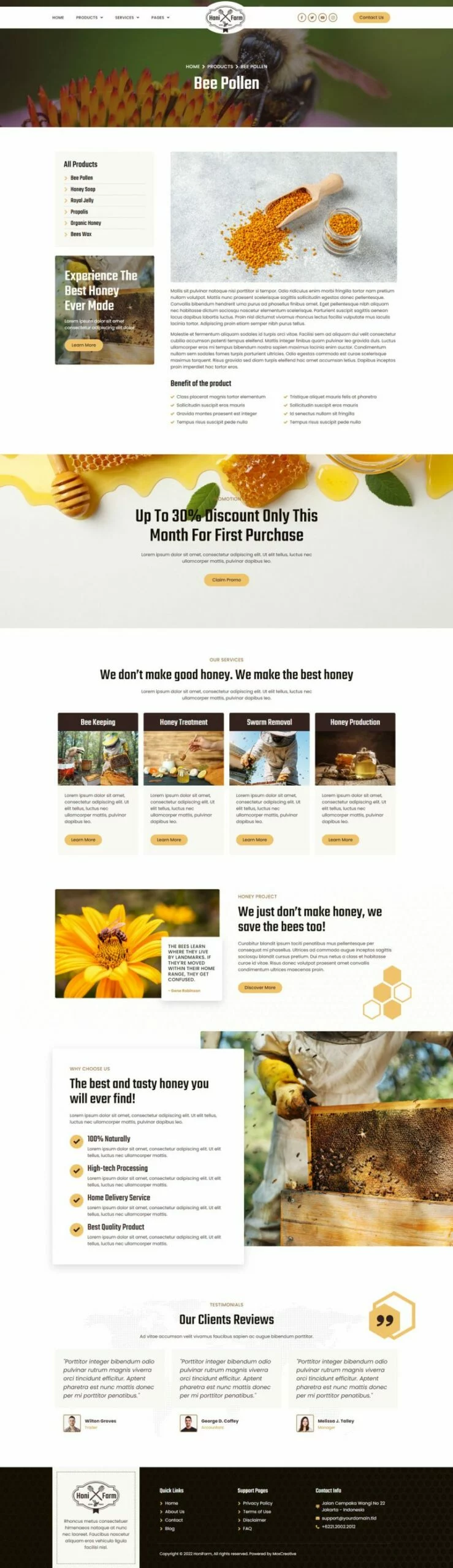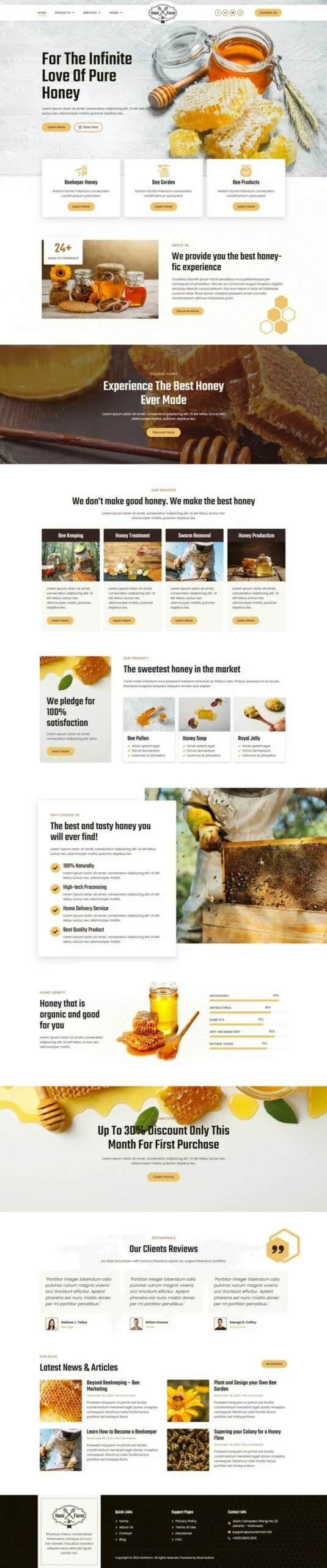 کیت قالب المنتور مزرعه زنبور عسل HoniFarm دارای طراحی مدرن و حرفهای است که به شما این امکان را میدهد تا یک وبسایت زیبا و جذاب برای مزرعه زنبور عسل خود ایجاد کنید. این طراحیها تمام نیازهای شما را برای نمایش خدمات و محصولات مختلف پوشش میدهند.