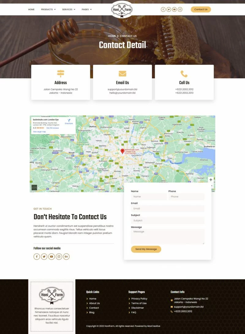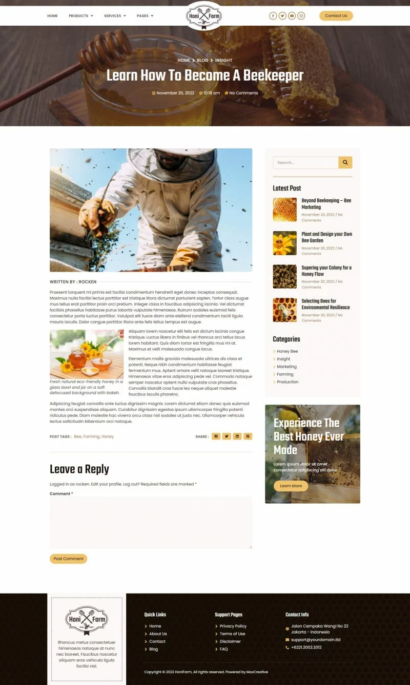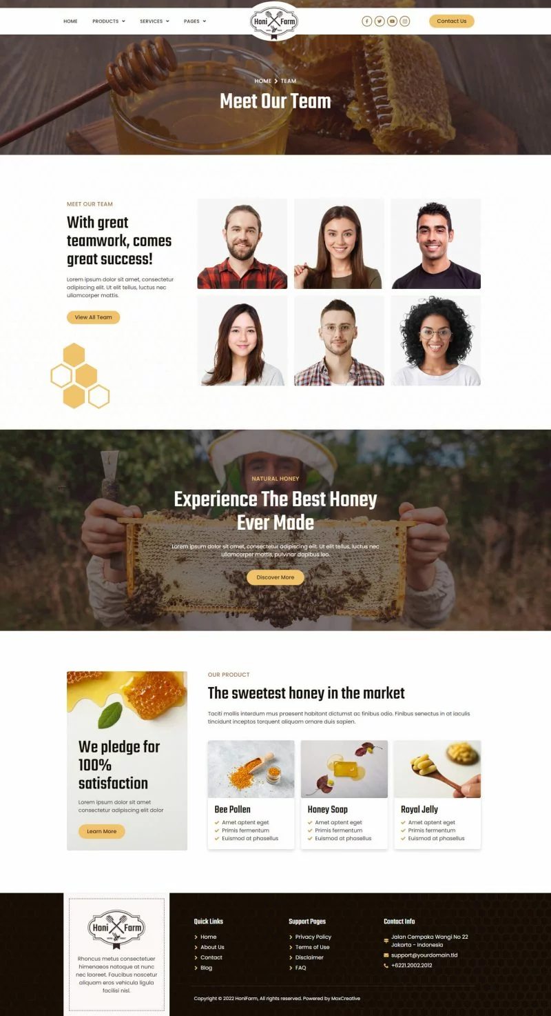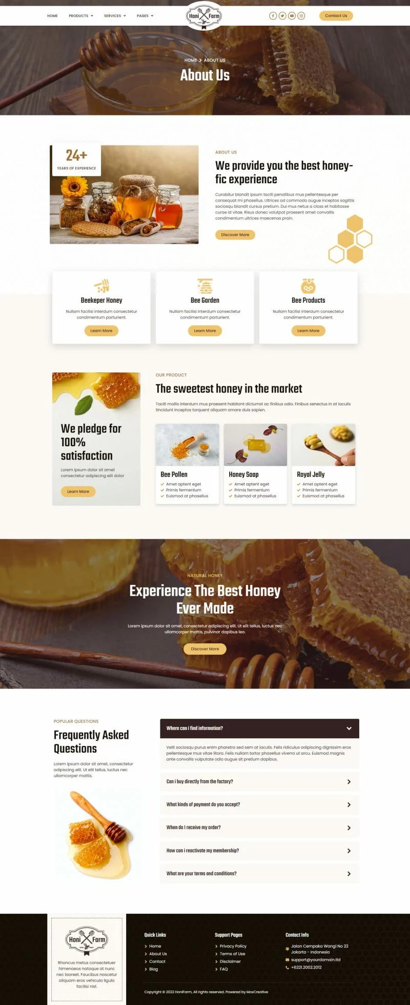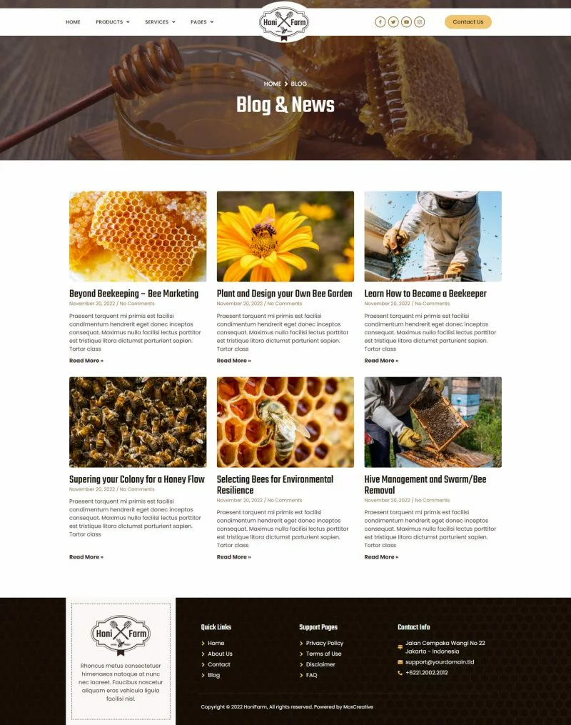 کیت قالب المنتور مزرعه زنبور عسل HoniFarm دارای طراحی مدرن و حرفهای است که به شما این امکان را میدهد تا یک وبسایت زیبا و جذاب برای مزرعه زنبور عسل خود ایجاد کنید. این طراحیها تمام نیازهای شما را برای نمایش خدمات و محصولات مختلف پوشش میدهند.