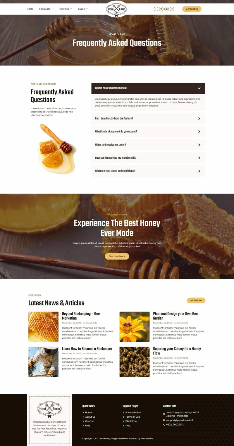 کیت قالب المنتور مزرعه زنبور عسل HoniFarm شامل بیش از 12 قالب پیشساخته با طراحی تمیز و سبک مدرن میباشد. با استفاده از این کیت، میتوانید هر وبسایتی مرتبط با مزرعه عسل مانند شرکت تولید عسل، درمان با عسل، خدمات نگهداری زنبور، حذف دستهجمعی، مزرعه ارگانیک، محصولات طبیعی و غیره را بسازید.