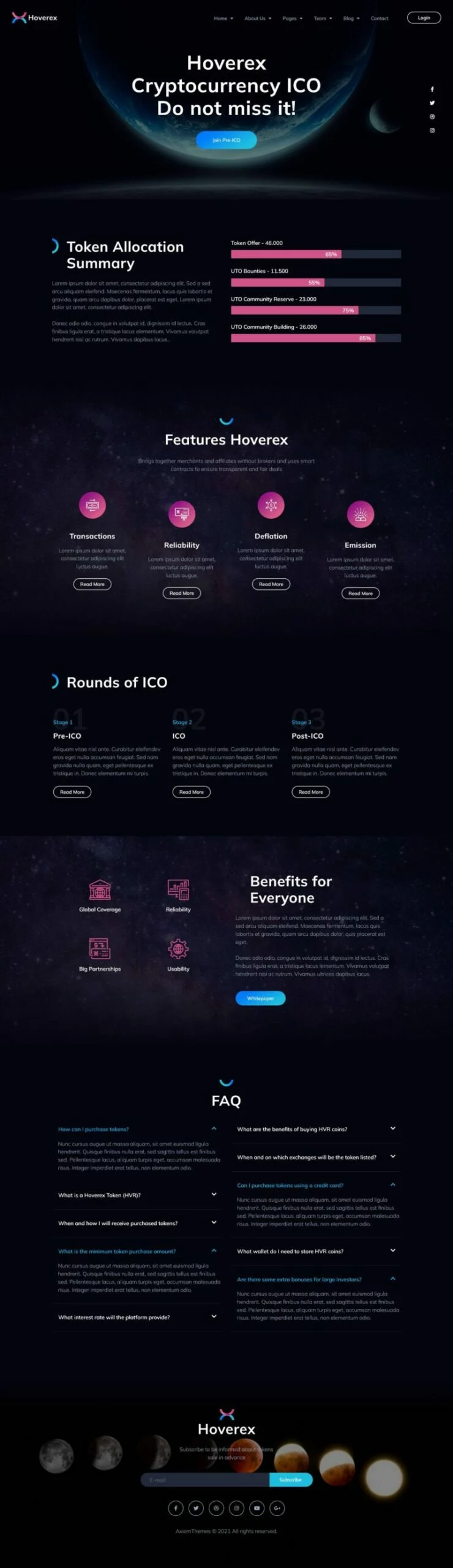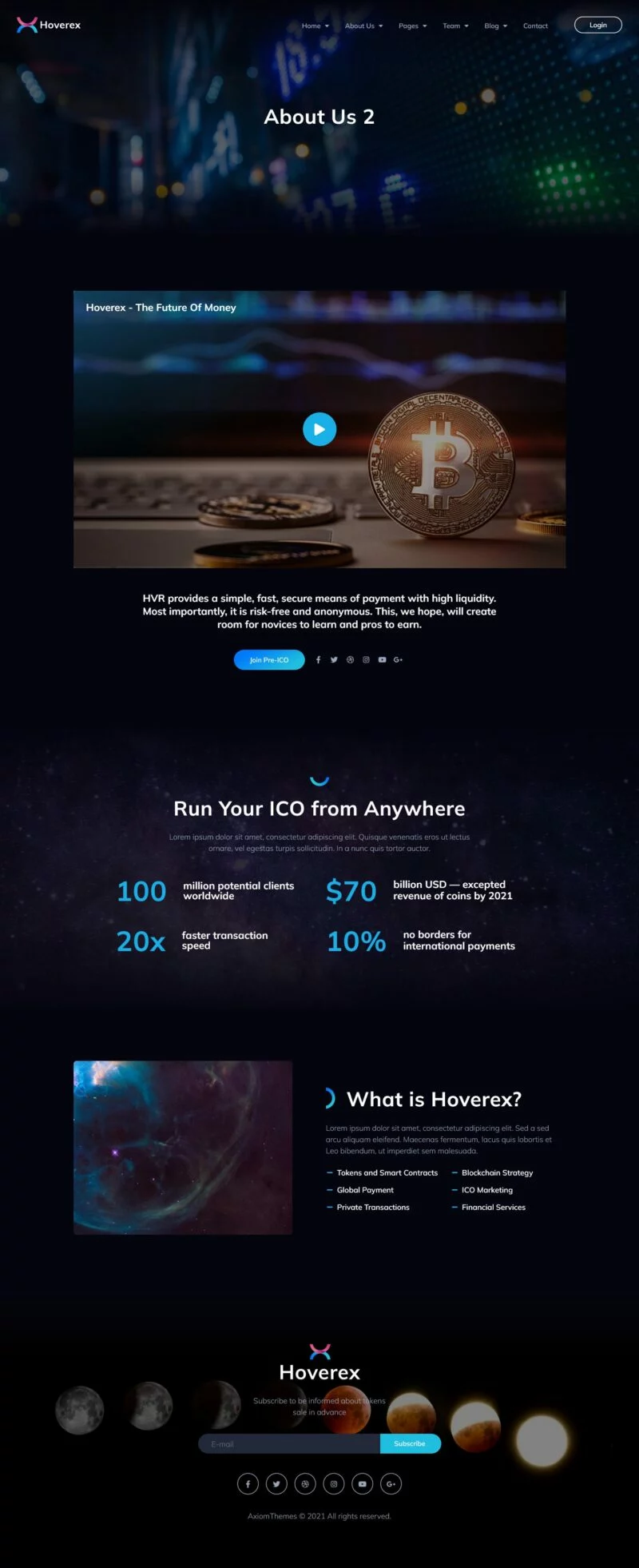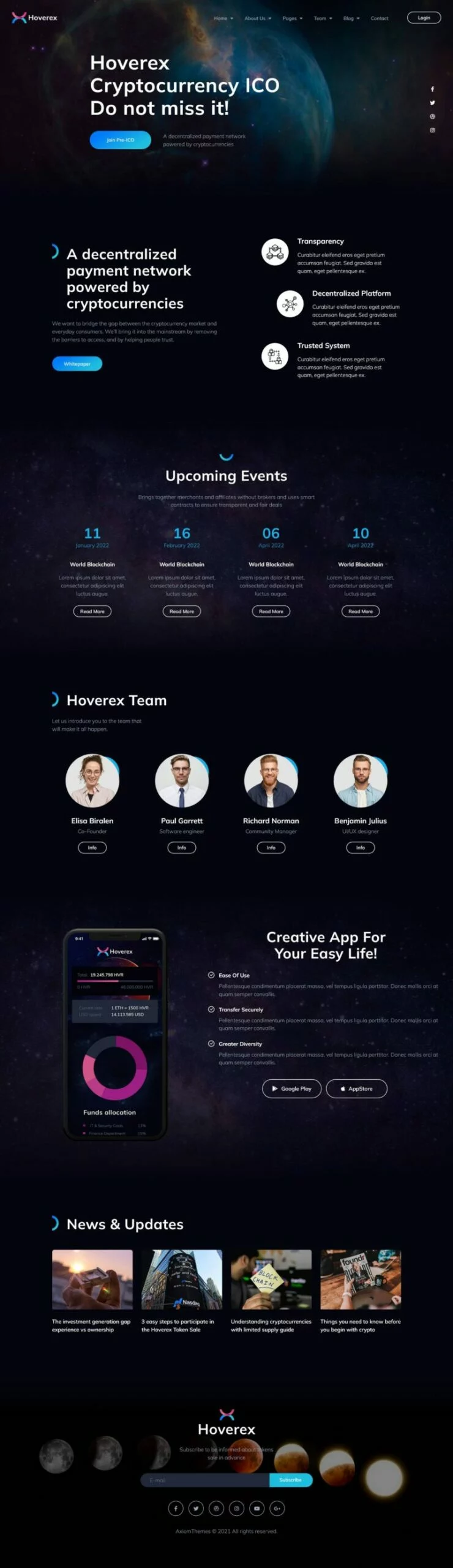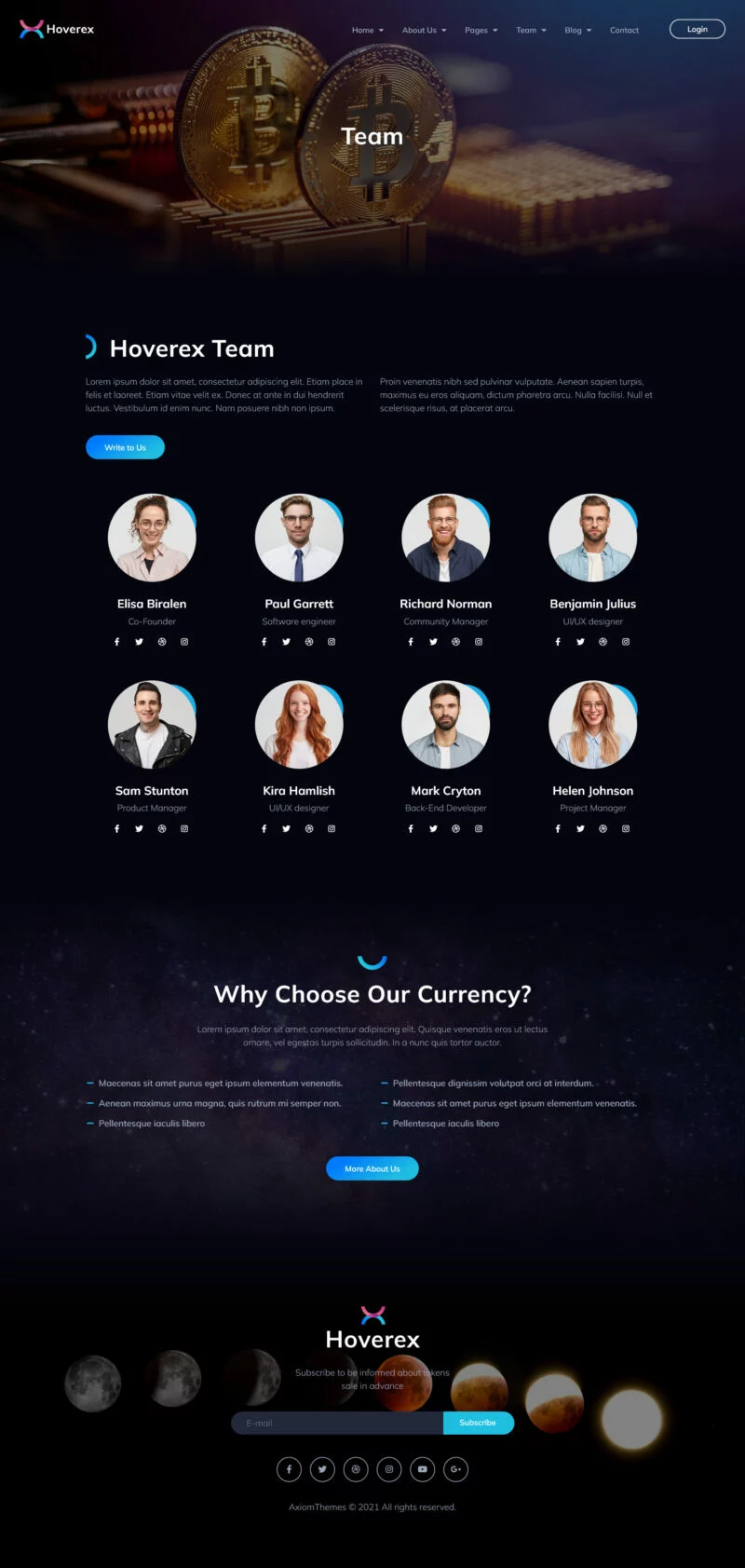 کیت قالب المنتور ارز دیجیتال Hoverex یک مجموعه از قالبهای از پیش طراحی شده برای وبلاگهای ارز دیجیتال و مالی به طور کلی است. شما همچنین میتوانید از آن به عنوان وبسایت مربی ارز دیجیتال یا به سادگی به عنوان وبسایت مشاور مالی و حسابدار استفاده کنید. این کیت برای استفاده با قالب رایگان Hello Elementor بهینهسازی شده است، اما میتوان از آن با بیشتر قالبهایی که از المنتور پشتیبانی میکنند، استفاده کرد.
