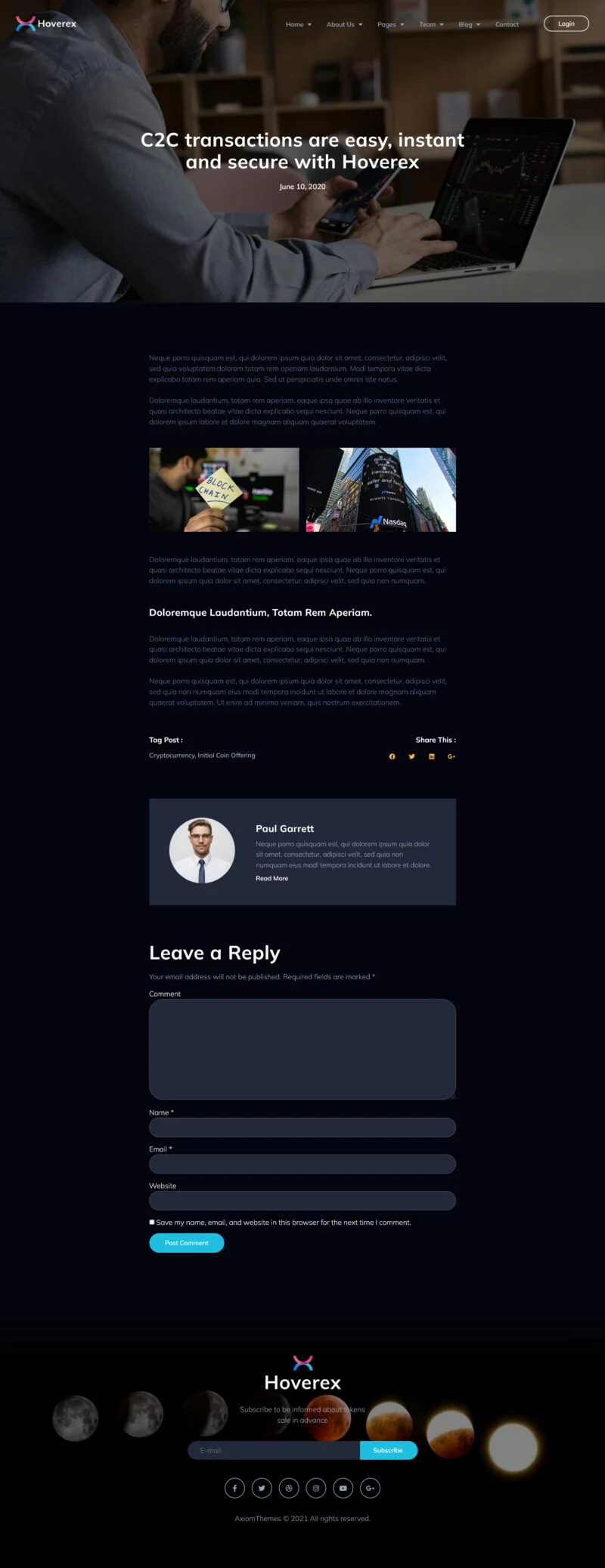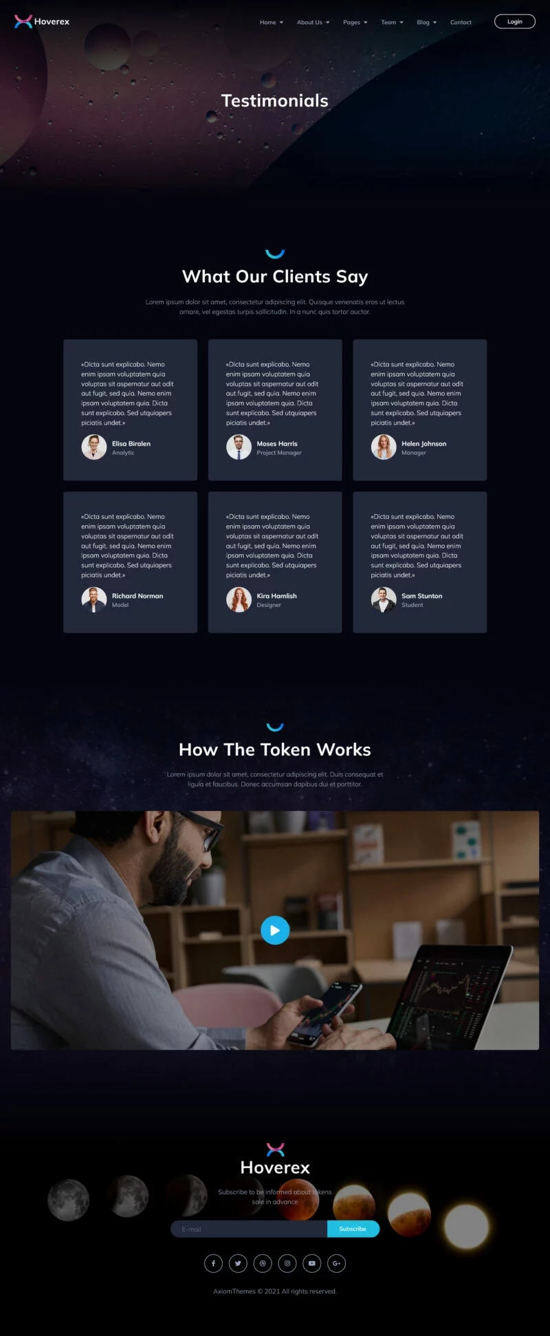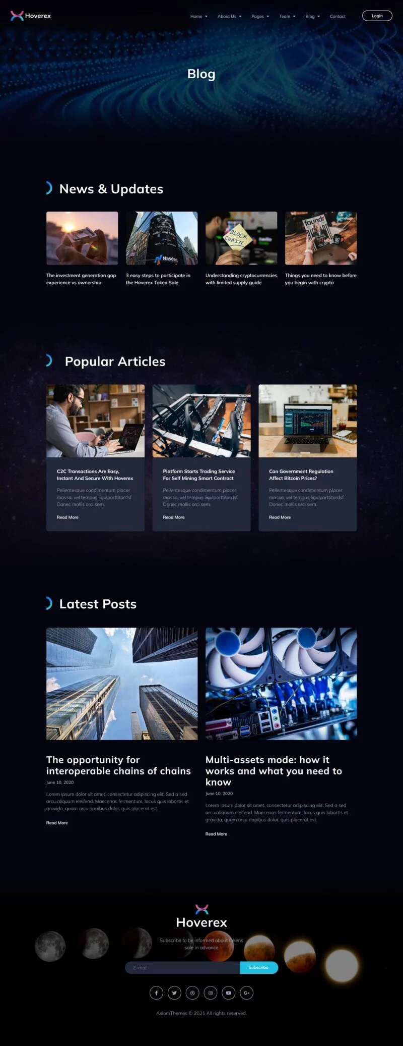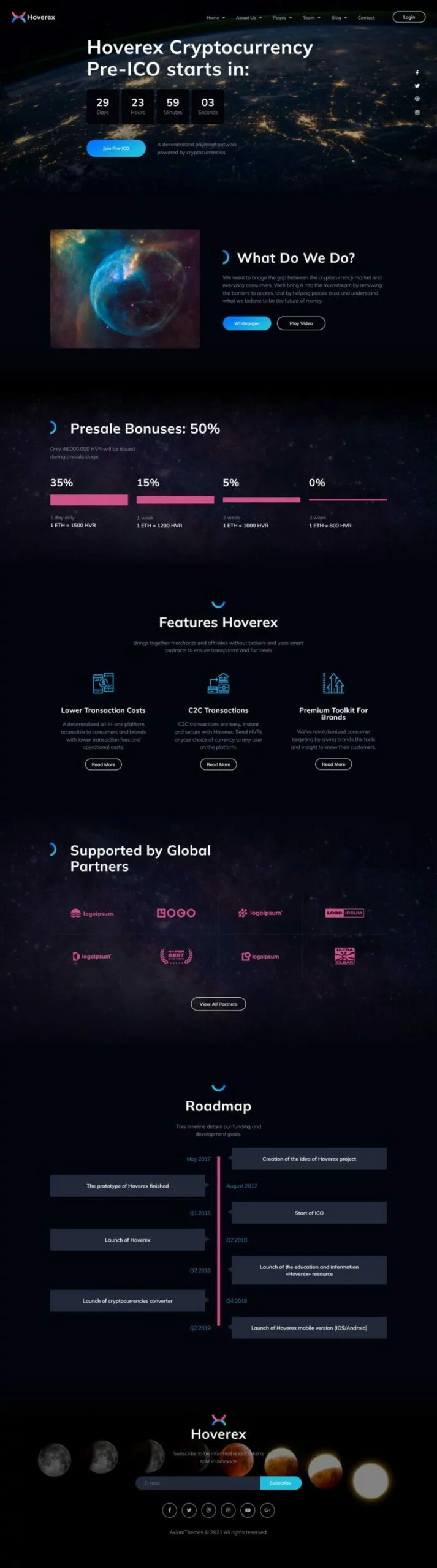 کیت قالب المنتور ارز دیجیتال Hoverex یک مجموعه از قالبهای از پیش طراحی شده برای وبلاگهای ارز دیجیتال و مالی به طور کلی است. شما همچنین میتوانید از آن به عنوان وبسایت مربی ارز دیجیتال یا به سادگی به عنوان وبسایت مشاور مالی و حسابدار استفاده کنید. این کیت برای استفاده با قالب رایگان Hello Elementor بهینهسازی شده است، اما میتوان از آن با بیشتر قالبهایی که از المنتور پشتیبانی میکنند، استفاده کرد.