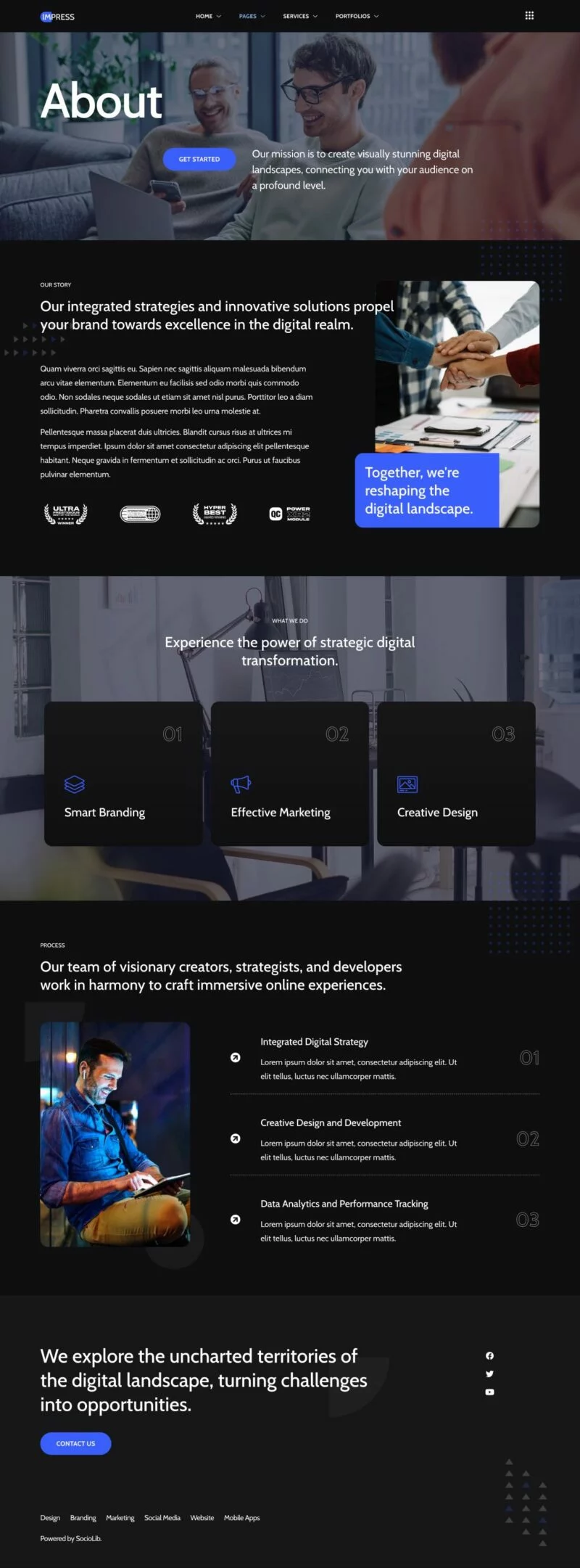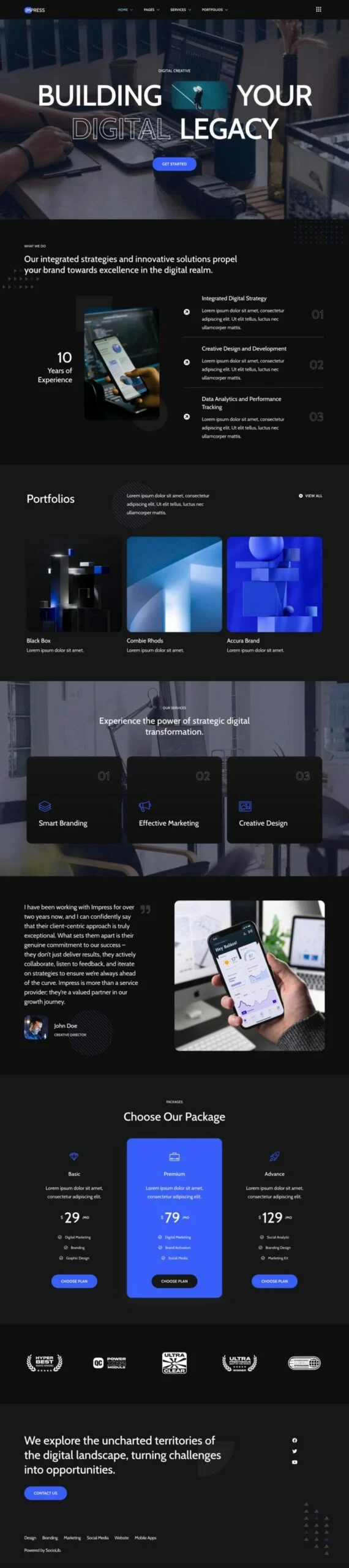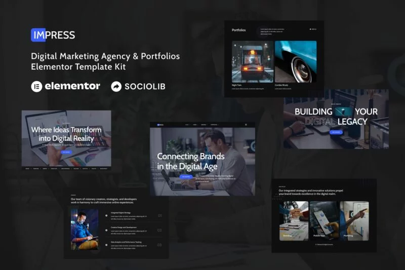 کیت قالب المنتور آژانس بازاریابی دیجیتال Impress، یک کیت برای ایجاد سریع و آسان وبسایتهای آژانس بازاریابی دیجیتال و پورتفولیو با استفاده از افزونه Elementor Page Builder برای وردپرس است. مناسب برای آژانس دیجیتال، آژانس طراحی، آژانس بازاریابی، آژانس رسانههای اجتماعی و غیره. این کیت قالب با طراحی خلاقانه و مدرن تیره، به وبسایت شما جلوهای مدرن میبخشد.