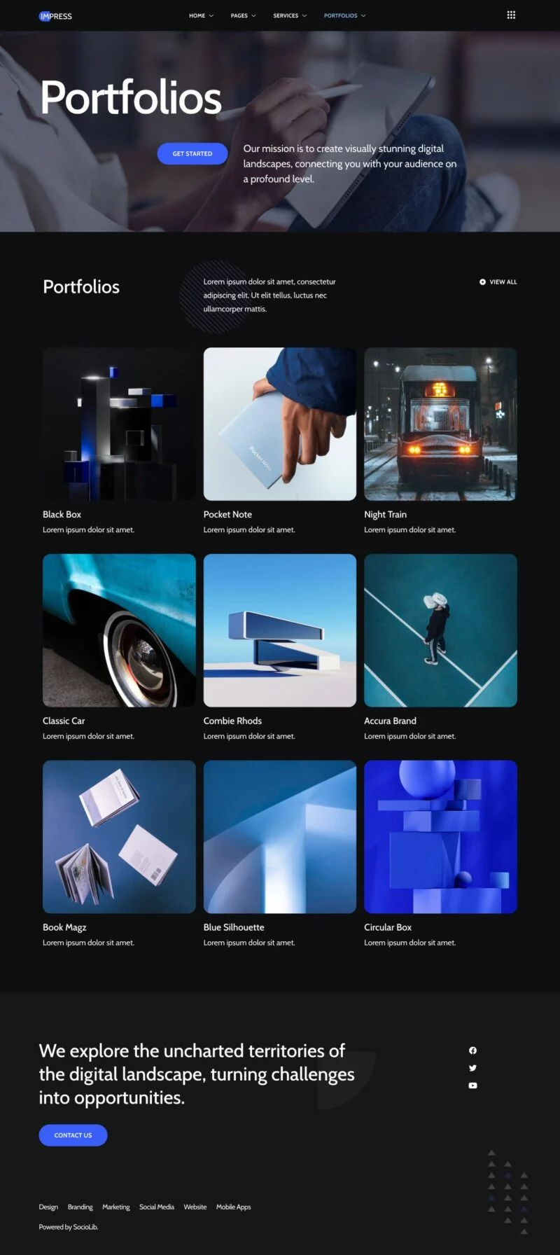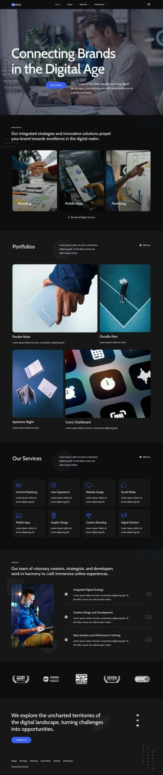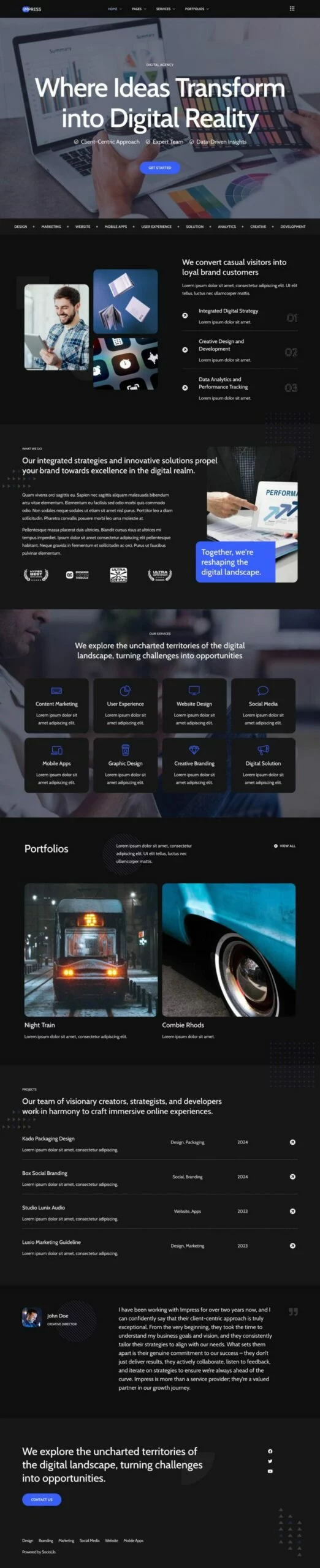 کیت قالب المنتور آژانس بازاریابی دیجیتال Impress، یک کیت برای ایجاد سریع و آسان وبسایتهای آژانس بازاریابی دیجیتال و پورتفولیو با استفاده از افزونه Elementor Page Builder برای وردپرس است. مناسب برای آژانس دیجیتال، آژانس طراحی، آژانس بازاریابی، آژانس رسانههای اجتماعی و غیره. این کیت قالب با طراحی خلاقانه و مدرن تیره، به وبسایت شما جلوهای مدرن میبخشد.