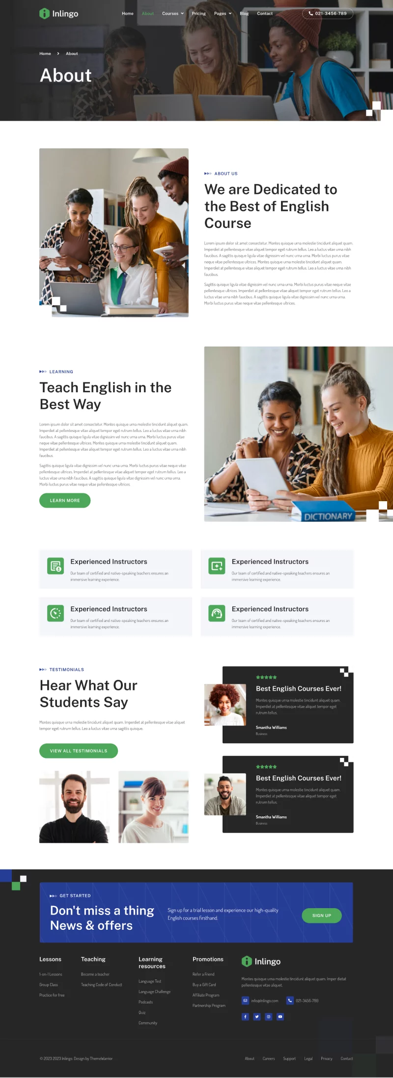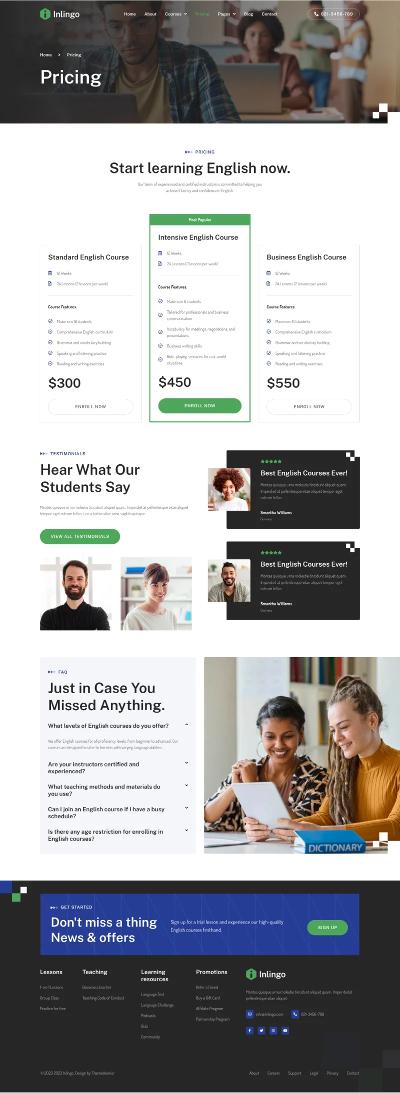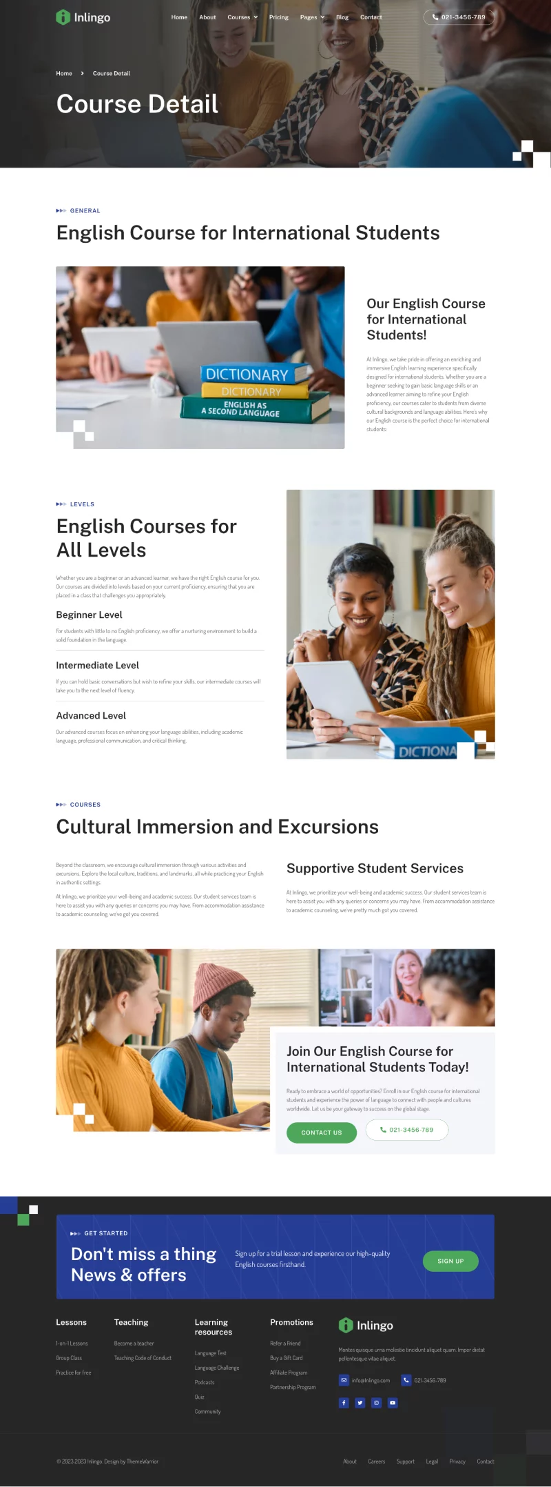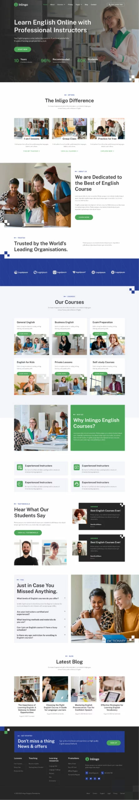 از صفحات فرودی که از لحظه ورود بازدیدکنندگان را جذب میکنند گرفته تا توضیحات دورهها، پروفایلهای مدرسین و منابع آموزشی تعاملی، این کیت همه جوانب حضور آنلاین مدرسه زبان شما را پوشش میدهد. چه دانشآموزان شما مبتدی باشند و چه پیشرفته، کیت قالب المنتور آموزش زبان انگلیسی Inlingo به شما قدرت میدهد تا محیط یادگیری پویا و جذابی ایجاد کنید که موفقیت را تقویت کند.