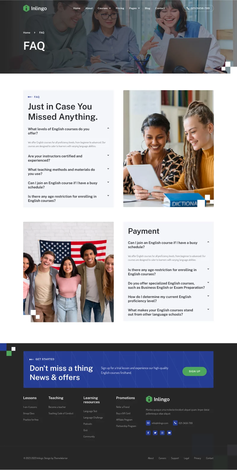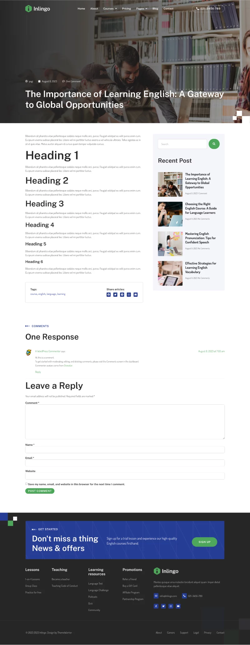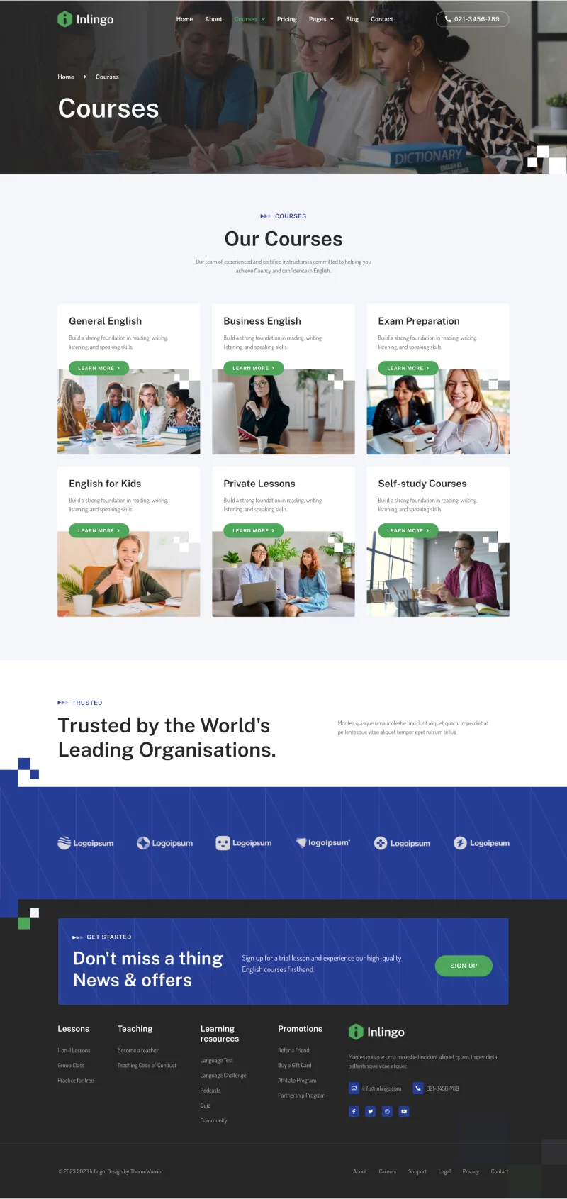 از صفحات فرودی که از لحظه ورود بازدیدکنندگان را جذب میکنند گرفته تا توضیحات دورهها، پروفایلهای مدرسین و منابع آموزشی تعاملی، این کیت همه جوانب حضور آنلاین مدرسه زبان شما را پوشش میدهد. چه دانشآموزان شما مبتدی باشند و چه پیشرفته، کیت قالب المنتور آموزش زبان انگلیسی Inlingo به شما قدرت میدهد تا محیط یادگیری پویا و جذابی ایجاد کنید که موفقیت را تقویت کند.