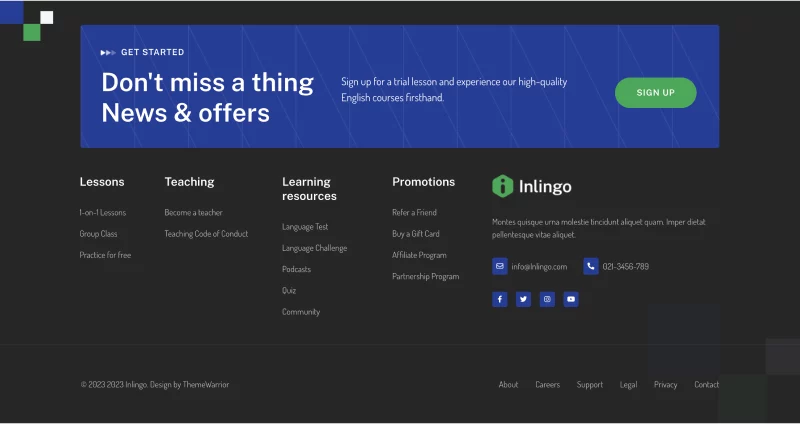 با رابط کاربری دوستانه و گزینههای سفارشیسازی متنوع، کیت قالب المنتور آموزش زبان انگلیسی Inlingo به شما امکان میدهد هر قالب را با هویت برند خود تطبیق دهید و ارزش منحصربهفرد دورههای زبان خود را نمایش دهید. چه در زبان انگلیسی تخصص داشته باشید، چه اسپانیایی، فرانسوی یا هر زبان دیگری، Inlingo ابزارهای لازم را برای برجسته شدن در بازار شلوغ و جذب دانشآموزان از سراسر جهان در اختیار شما قرار میدهد.