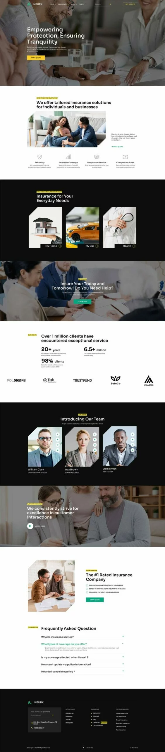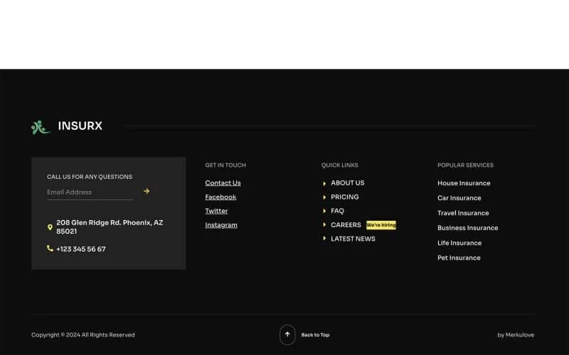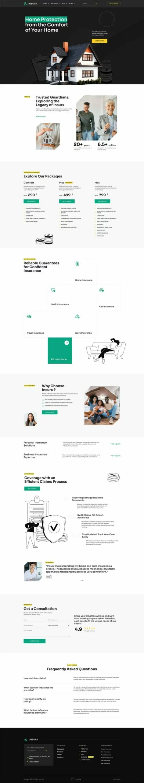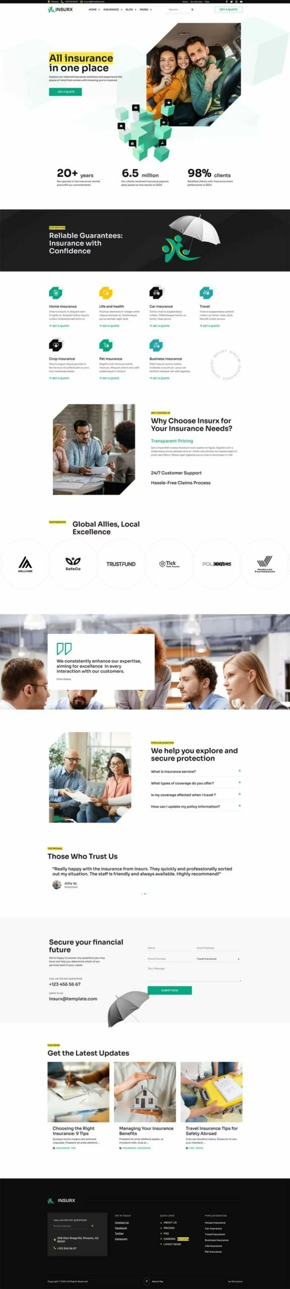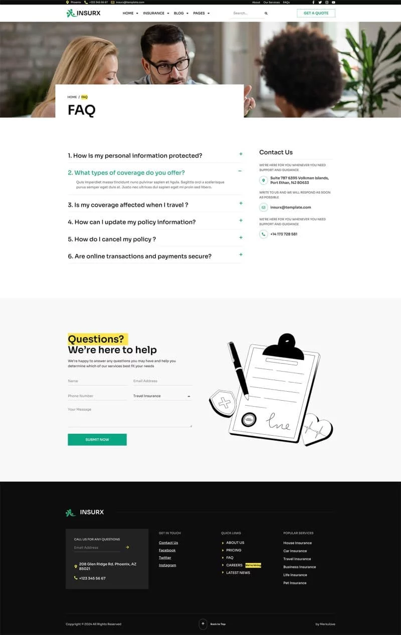 کیت قالب المنتور شرکت بیمه Insurx به طور خاص برای برآوردن نیازهای متمایز شرکتهای بیمه، آژانسها و کسبوکارهای کوچک طراحی شده است. این قالب جامع مجموعهای از خدمات بیمهای متنوع را پوشش میدهد، مانند بیمه سلامت، بیمه خودرو، بیمه اتومبیل، بیمه خانه، بیمه عمر، بیمه سفر و بیمه حیوانات خانگی.