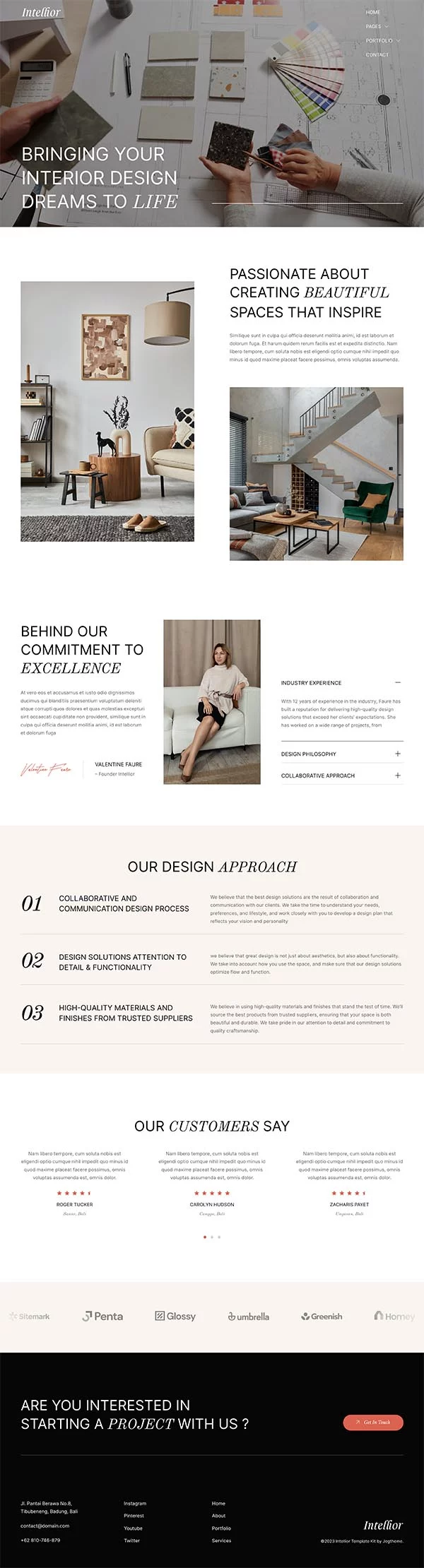 کیت قالب المنتور طراح داخلی و معمار Intellior یک کیت قالب المنتور مدرن و تمیز است که برای افرادی طراحی شده است که میخواهند یک وبسایت حرفهای بر پایه وردپرس برای پرتفوی طراحی داخلی یا معماری ایجاد کنند. این قالب دارای طراحی حرفهای با یک چیدمان 100% واکنشگرا است، آماده برای رتینا و بسیار آسان برای سفارشیسازی به دلیل استفاده از المنتور است، بنابراین شما نیازی به یک خط کدنویسی ندارید!