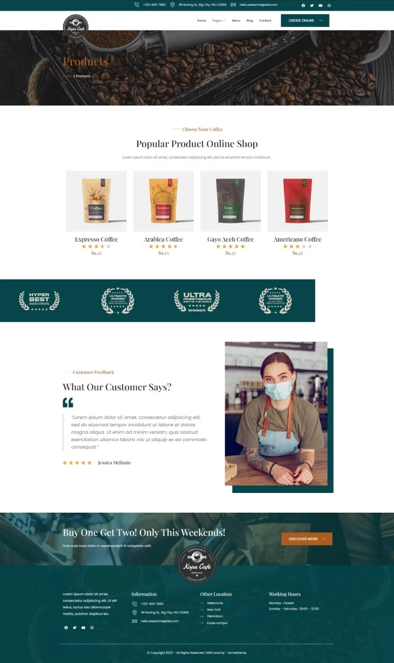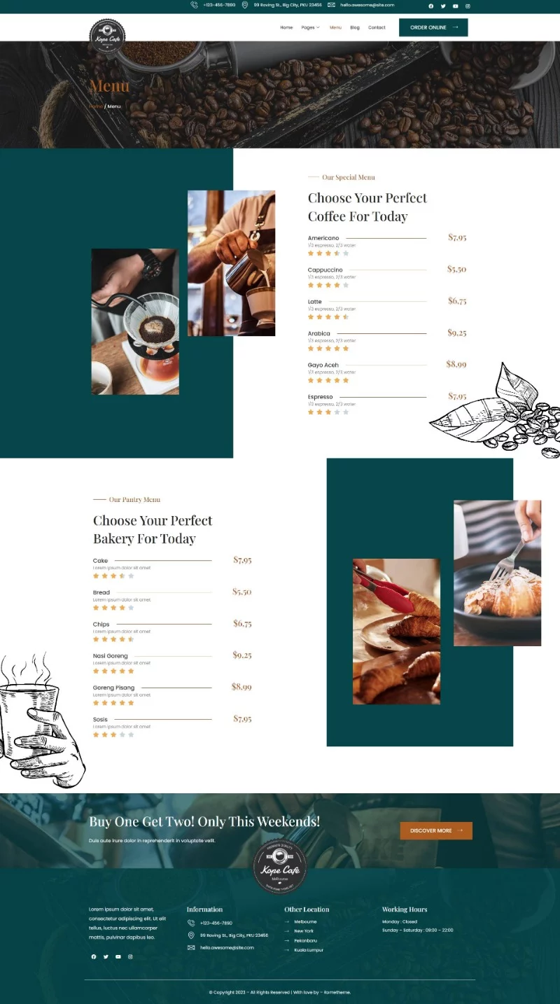 کیت قالب المنتور کافی شاپ و کافه Kope با طراحی تمیز، کاملاً واکنشگرا و قابل سفارشیسازی عرضه میشود و شامل بیش از 12 قالب از پیش ساخته شده است که به شما کمک میکند وبسایت حرفهای خود را بدون نیاز به کدنویسی ایجاد کنید.