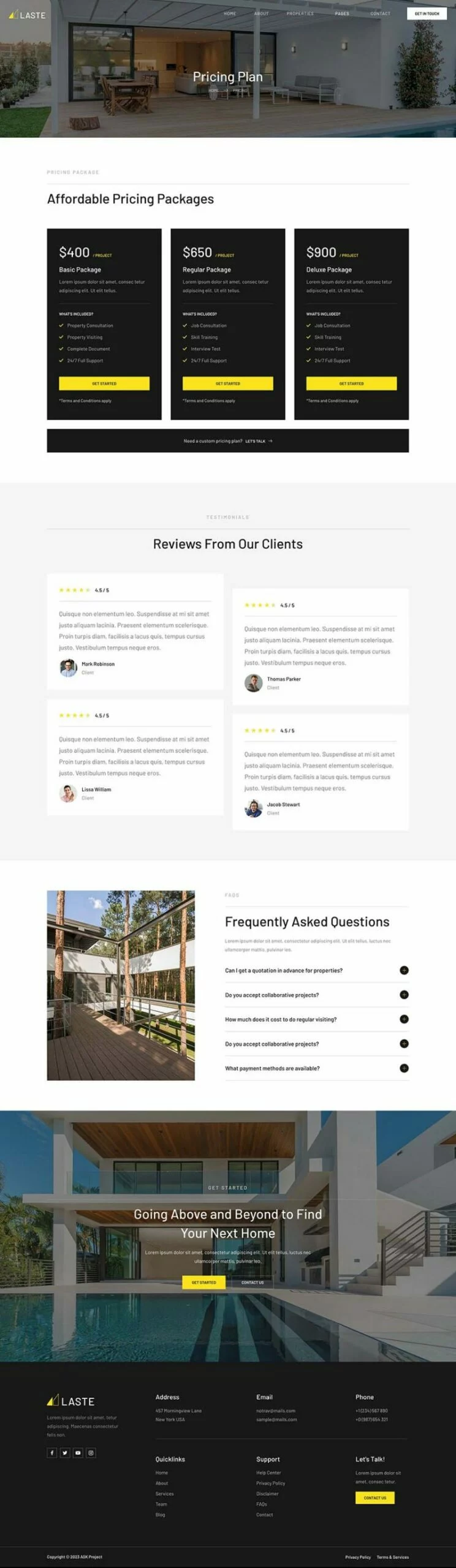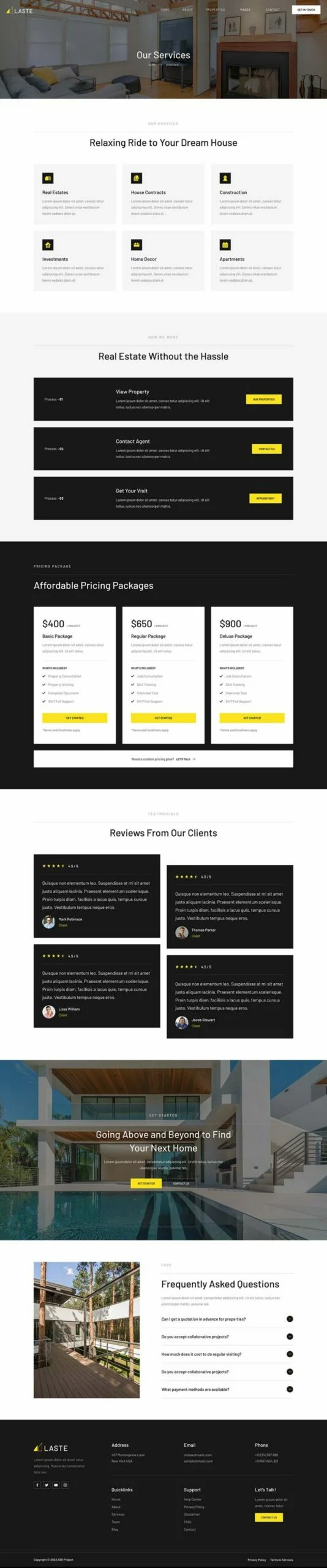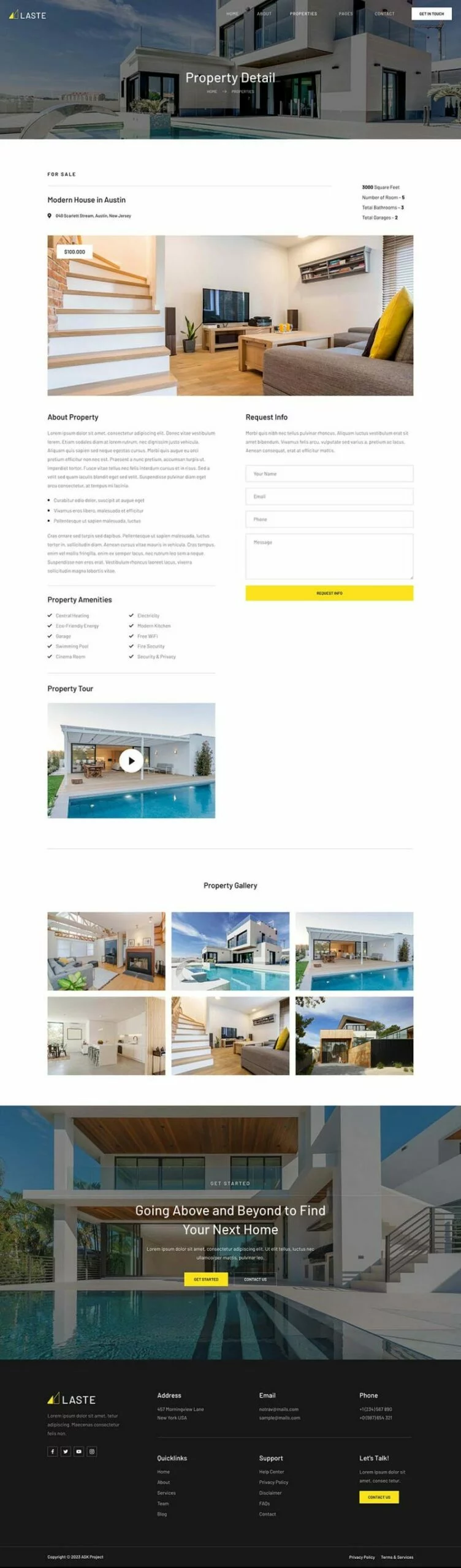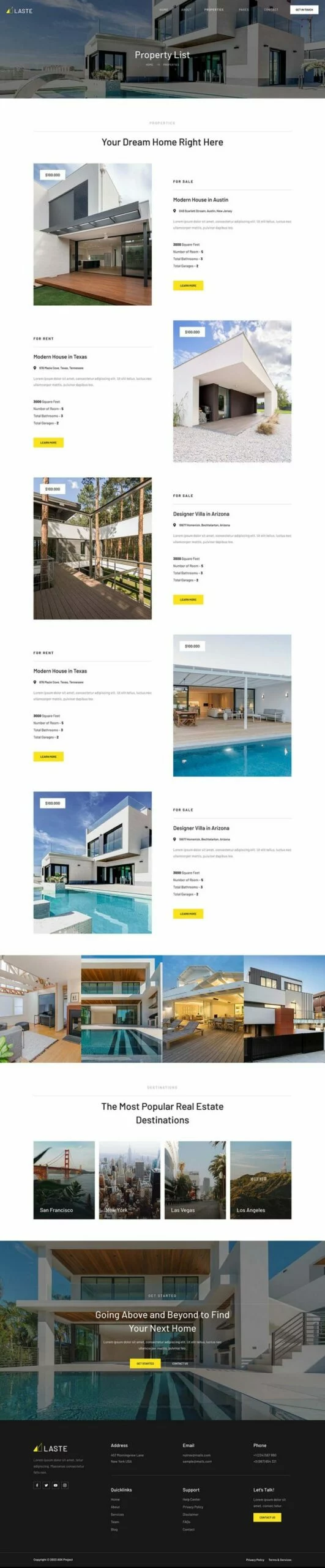کیت قالب المنتور املاک و مستغلات Laste بهطور ویژه برای آژانسهای املاک، مشاوران املاک، سازندگان خانه، شرکتهای ساختمانی، پیمانکاران املاک، نمایشگاههای معماری و غیره طراحی شده است. Laste دارای طراحی ساده، مدرن و تمیز با یک چیدمان 100٪ واکنشگرا است که بسیار آسان برای سفارشیسازی است و میتواند توسط هر کسی بدون نیاز به دانش کدنویسی استفاده شود.