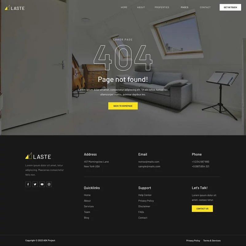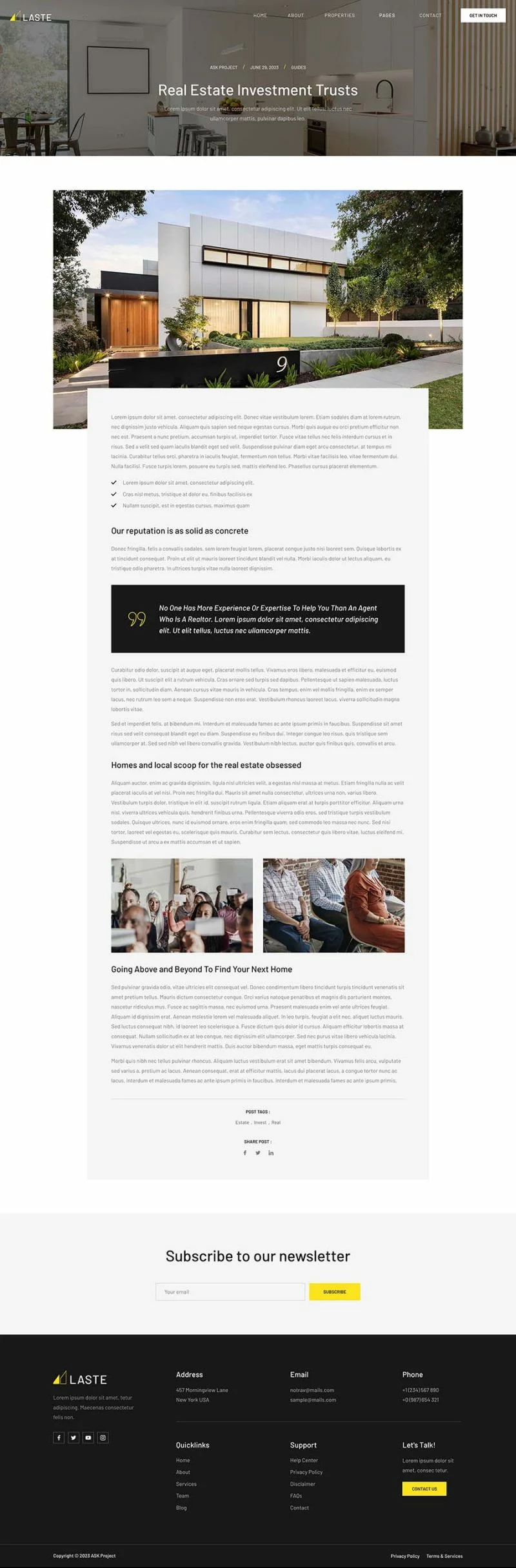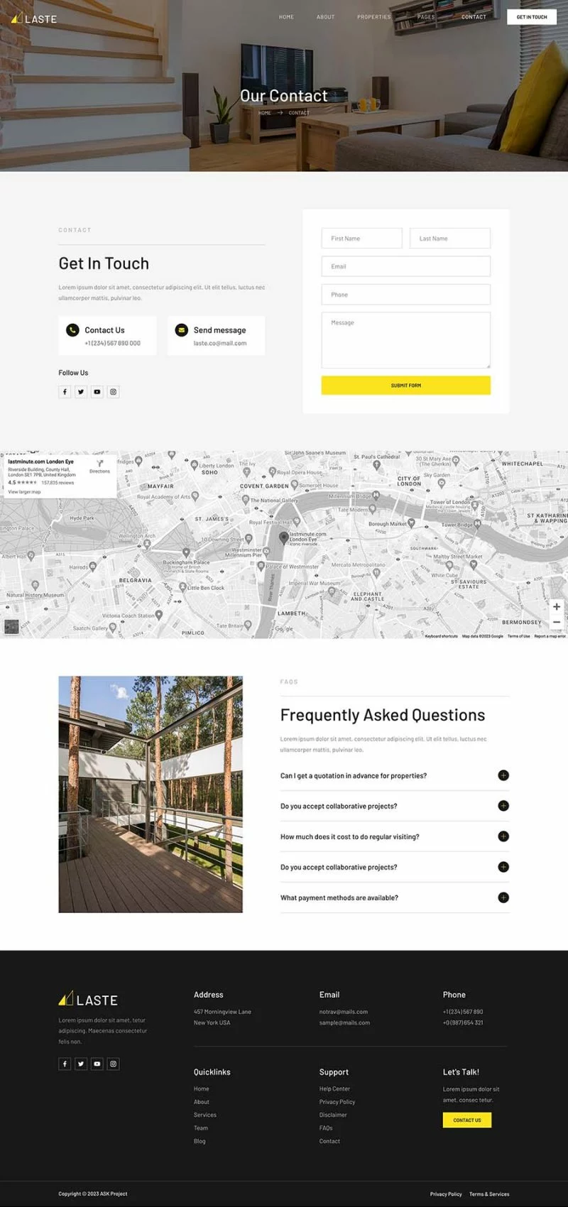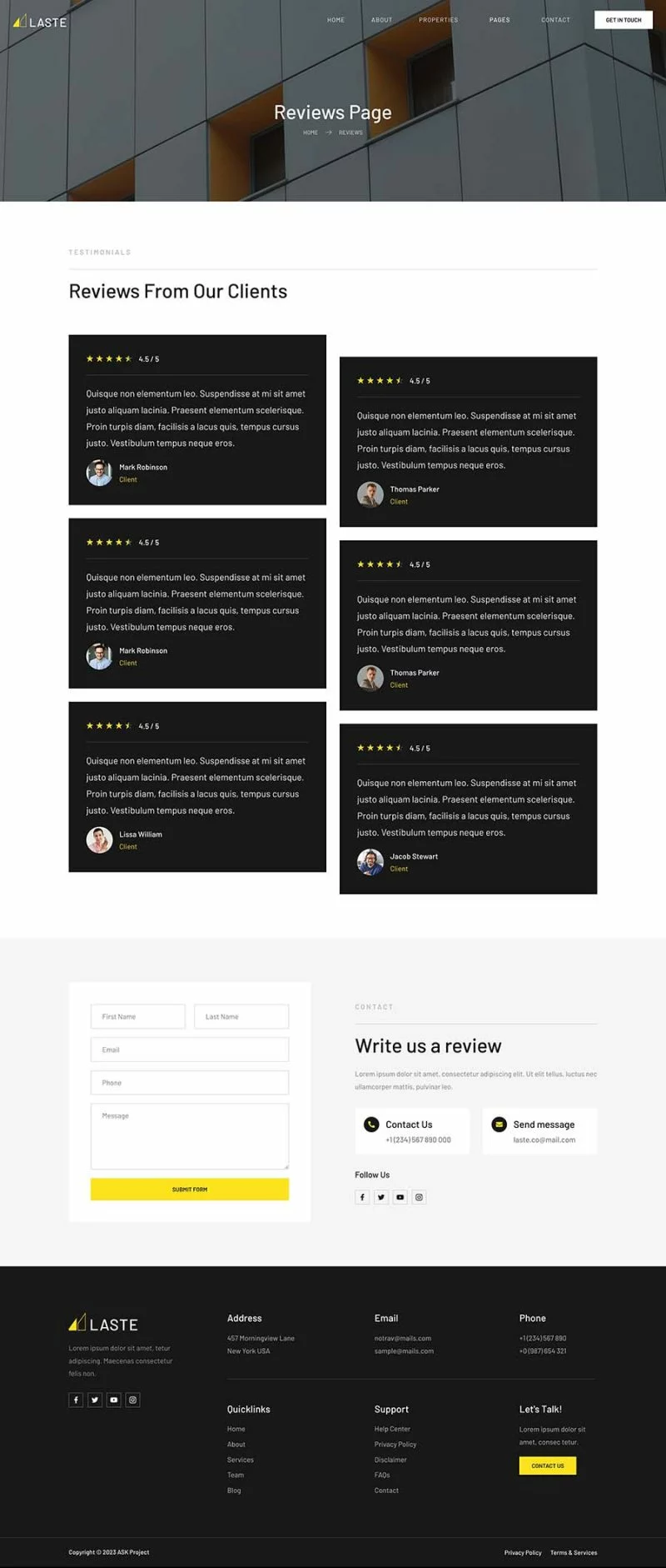 کیت قالب المنتور املاک و مستغلات Laste بهطور ویژه برای آژانسهای املاک، مشاوران املاک، سازندگان خانه، شرکتهای ساختمانی، پیمانکاران املاک، نمایشگاههای معماری و غیره طراحی شده است. Laste دارای طراحی ساده، مدرن و تمیز با یک چیدمان 100٪ واکنشگرا است که بسیار آسان برای سفارشیسازی است و میتواند توسط هر کسی بدون نیاز به دانش کدنویسی استفاده شود.