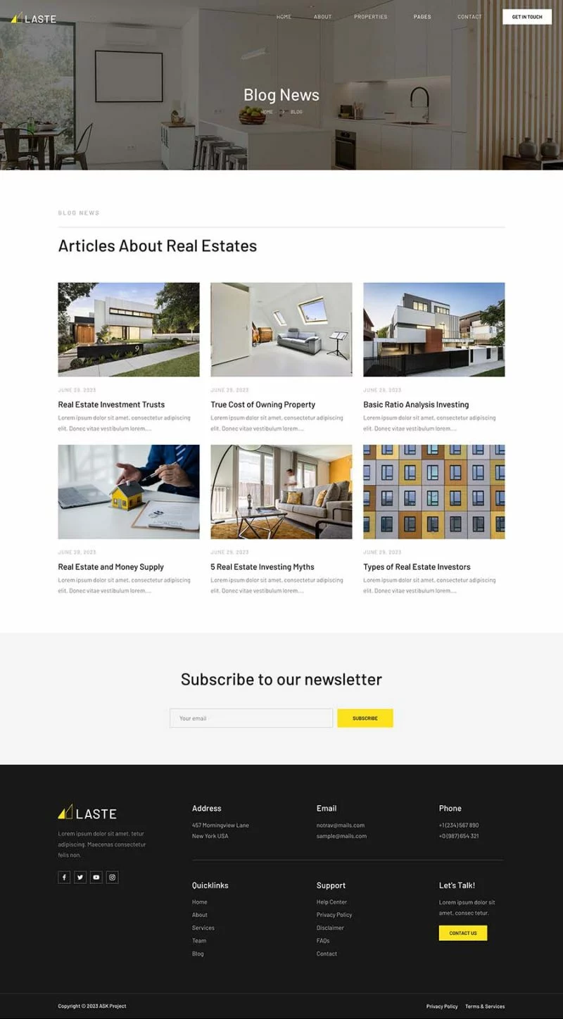 کیت قالب Laste به شما این امکان را میدهد که وبسایتهای حرفهای و جذاب برای املاک و مستغلات ایجاد کنید. طراحی منحصربهفرد و تمیز این قالبها، همراه با قابلیت سفارشیسازی کامل و بخشهای متعدد، به شما این امکان را میدهد که به راحتی وبسایت خود را مطابق با نیازهای خود تنظیم کنید. از مشاوران املاک گرفته تا نمایشگاههای معماری، این کیت قالب تمامی نیازهای شما را پوشش میدهد و تضمین میکند که وبسایتی با کیفیت و جذاب برای مشتریان خود داشته باشید.