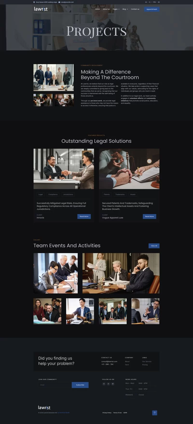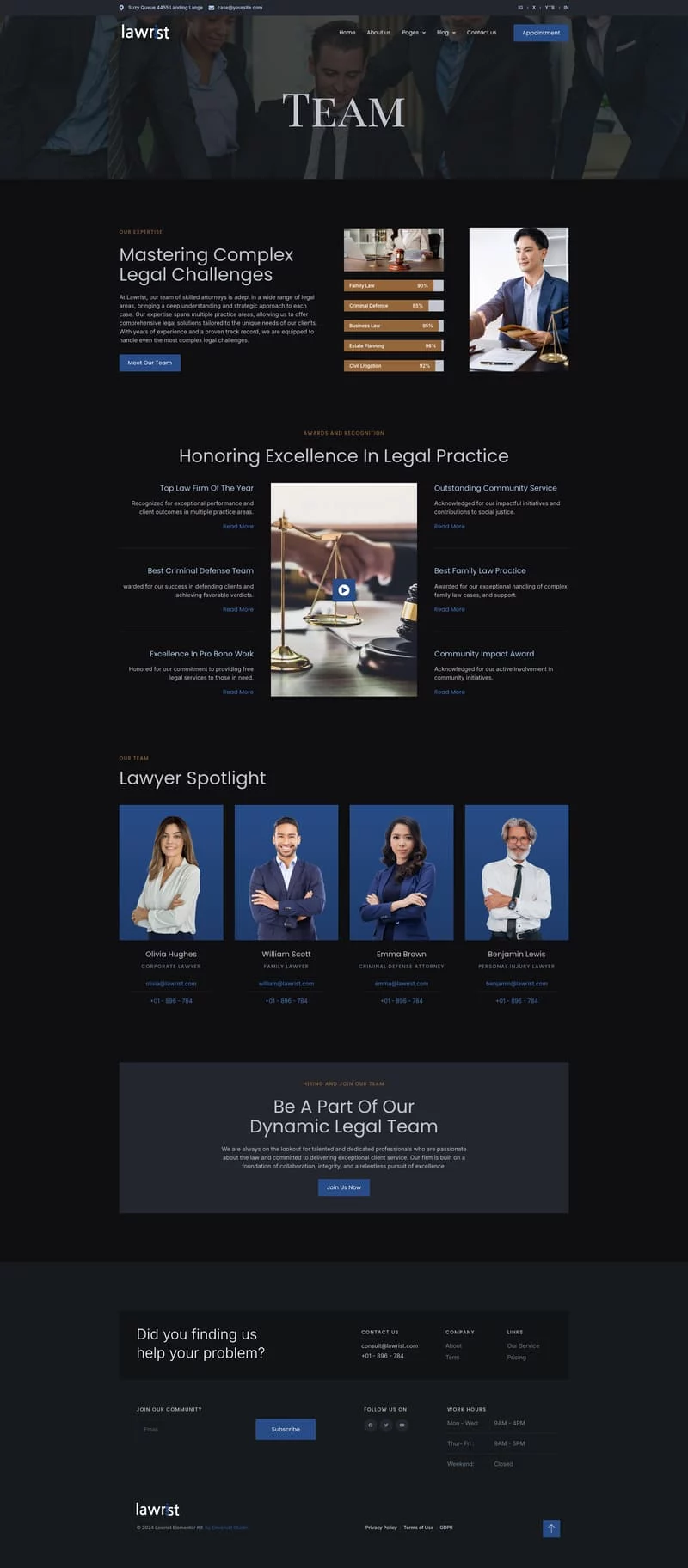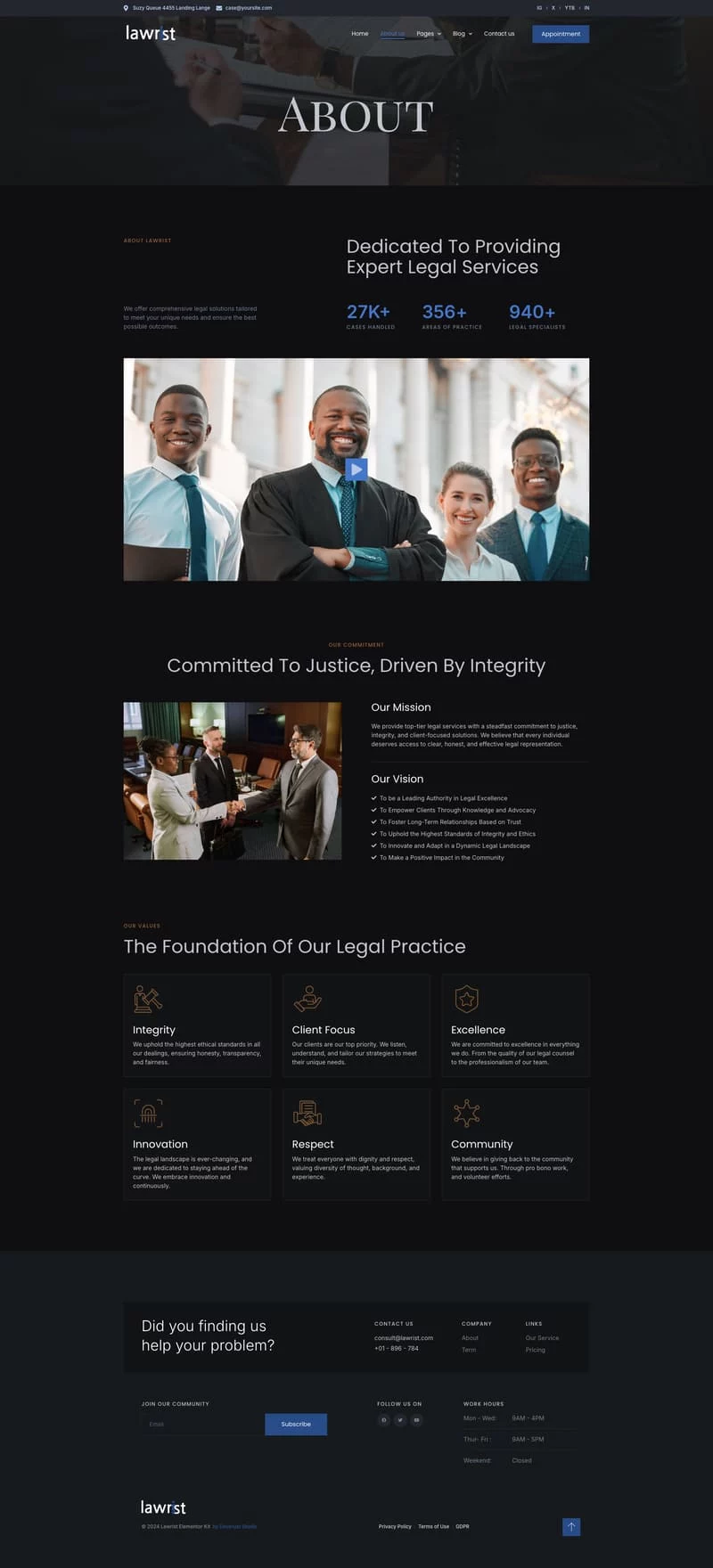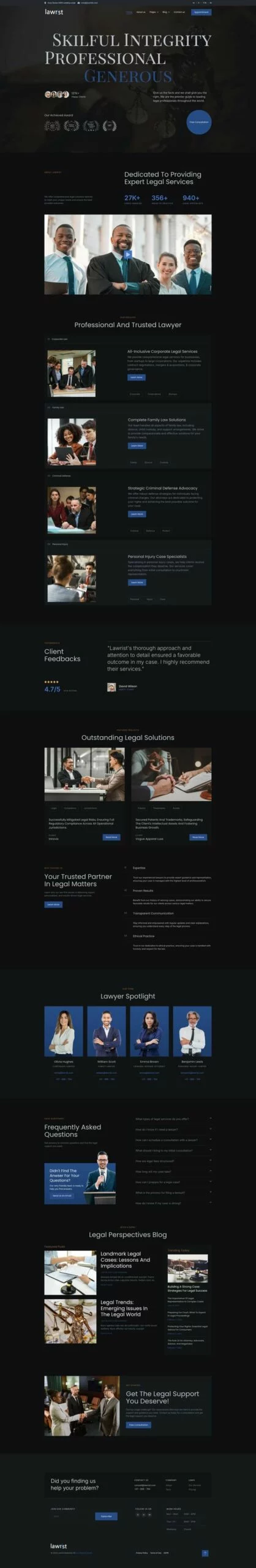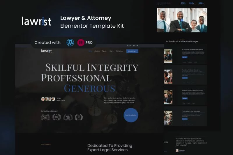 چه یک وکیل باتجربه باشید و چه به تازگی فعالیت خود را آغاز کرده باشید، Lawrist با طراحی خاص و تمیز خود به شما کمک میکند تا یک تصویر حرفهای از برند حقوقی خود بسازید. همچنین، این کیت قالب به شما این امکان را میدهد که از طیف وسیعی از رنگها و فونتهای آماده استفاده کرده و ظاهر وبسایت خود را با هویت برندتان تطبیق دهید. قالب بهطور کامل ریسپانسیو است و در همه دستگاهها از موبایل تا دسکتاپ بهخوبی نمایش داده میشود.