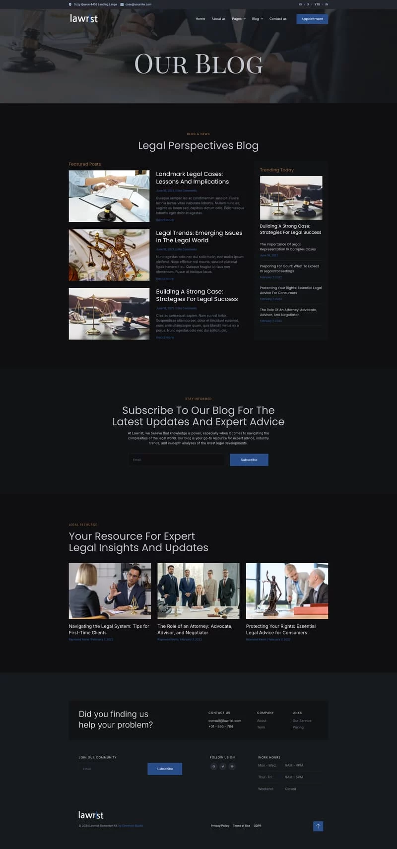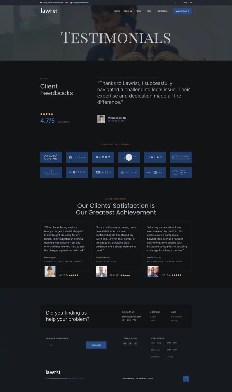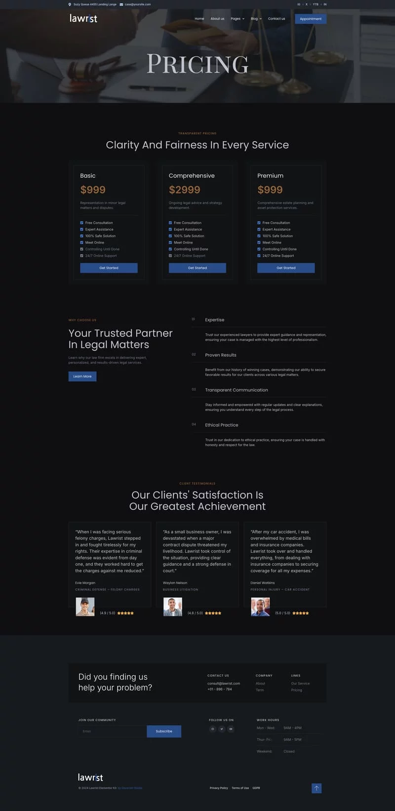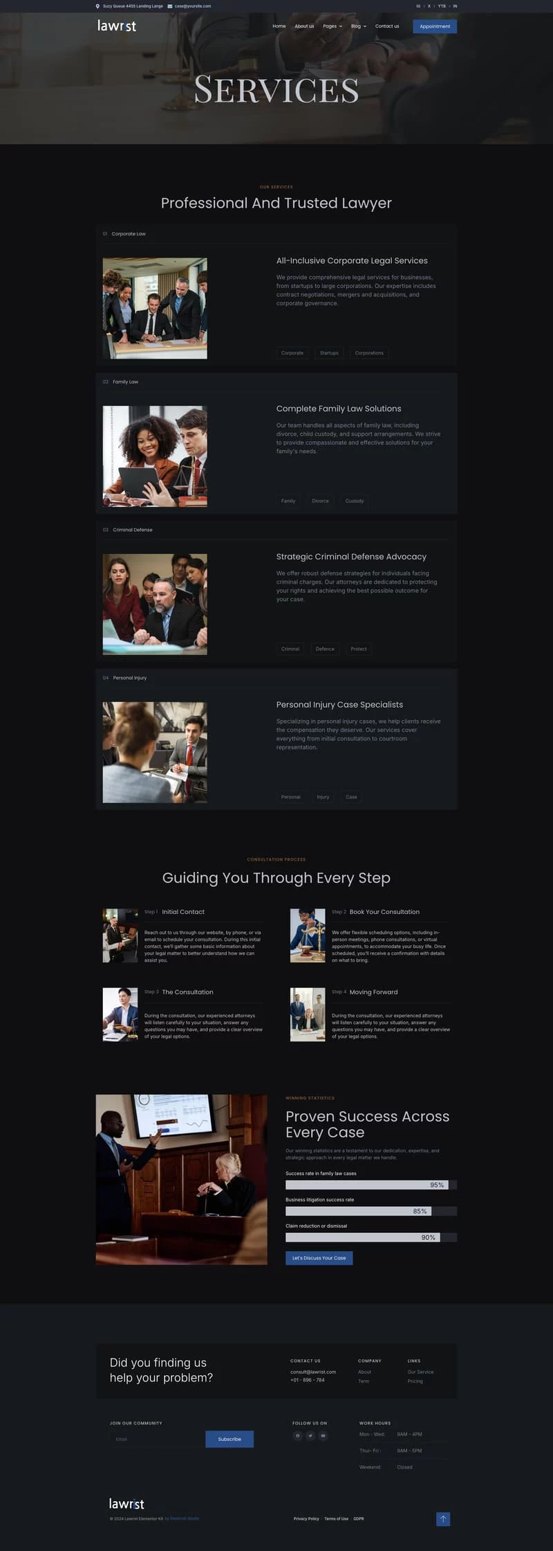 چه یک وکیل باتجربه باشید و چه به تازگی فعالیت خود را آغاز کرده باشید، Lawrist با طراحی خاص و تمیز خود به شما کمک میکند تا یک تصویر حرفهای از برند حقوقی خود بسازید. همچنین، این کیت قالب به شما این امکان را میدهد که از طیف وسیعی از رنگها و فونتهای آماده استفاده کرده و ظاهر وبسایت خود را با هویت برندتان تطبیق دهید. قالب بهطور کامل ریسپانسیو است و در همه دستگاهها از موبایل تا دسکتاپ بهخوبی نمایش داده میشود.