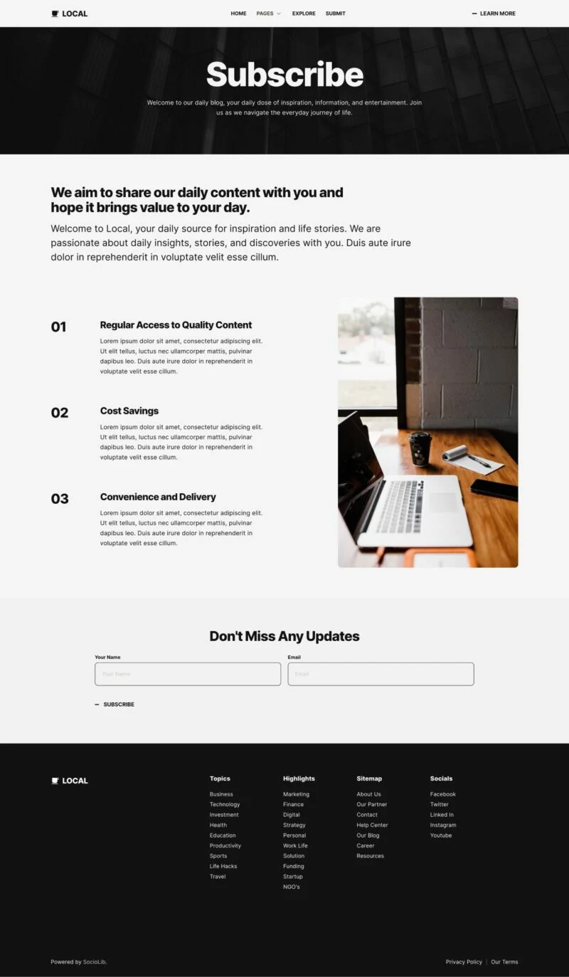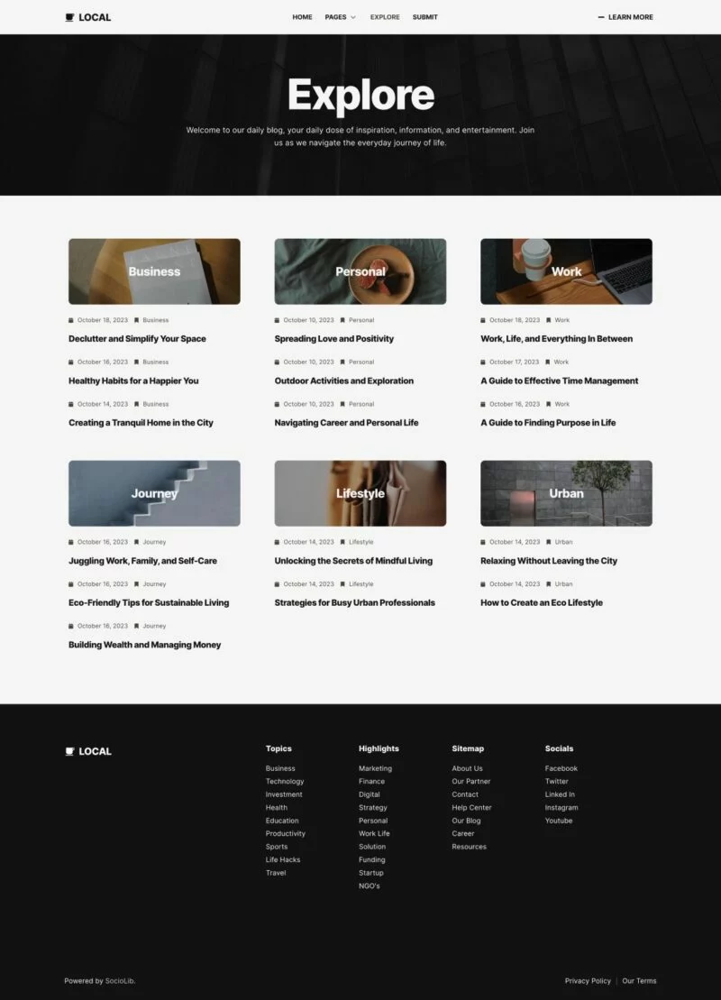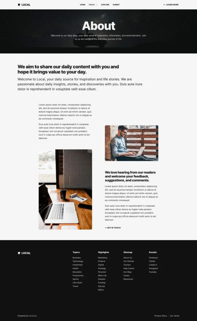 کیت قالب المنتور وبلاگ و مجله مدرن Local برای ایجاد سریع و آسان وبلاگ مدرن با استفاده از افزونه Elementor Page Builder برای وردپرس طراحی شده است. مناسب برای بلاگرها، ژورنالها، اخبار، پورتالها، داستانها، مجلات و غیره. با استفاده از این کیت قالب وبسایت خود را با سبک طراحی خلاقانه و مدرن به روز کنید تا احساس مدرنیته به وبلاگ شما بیافزاید.