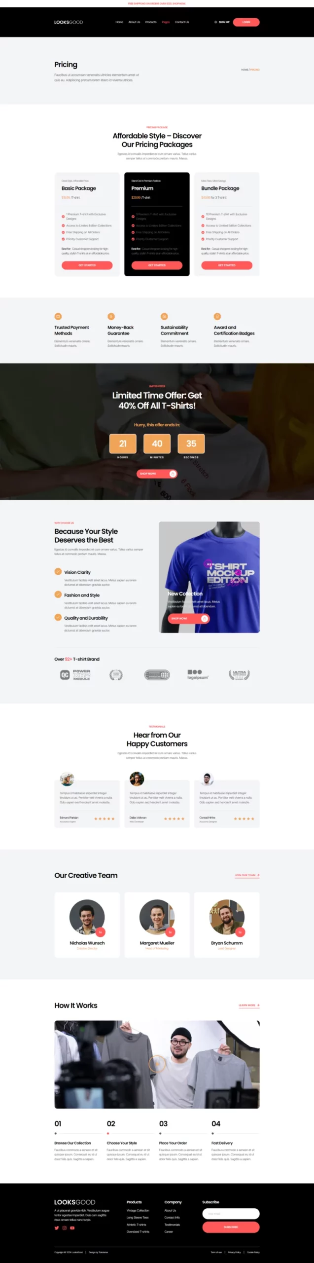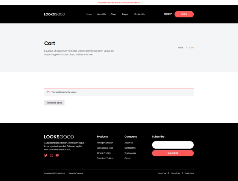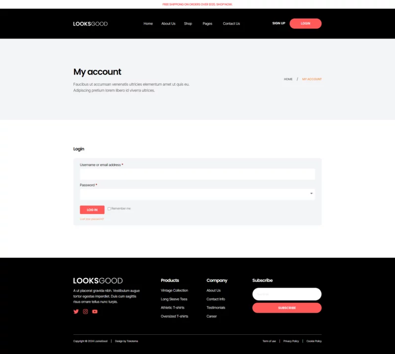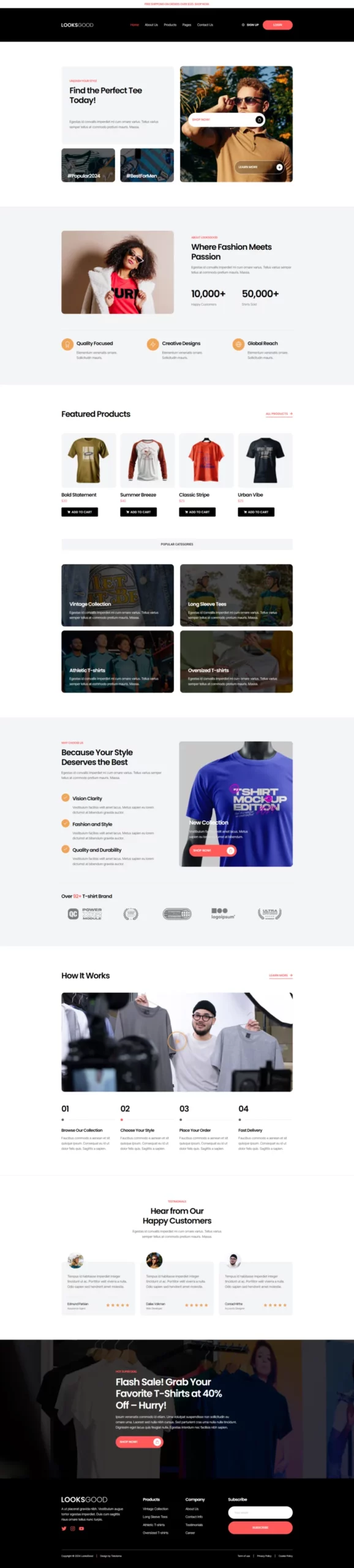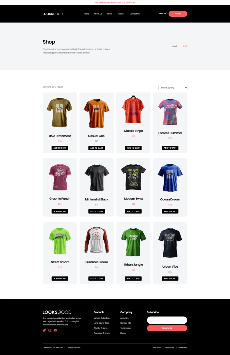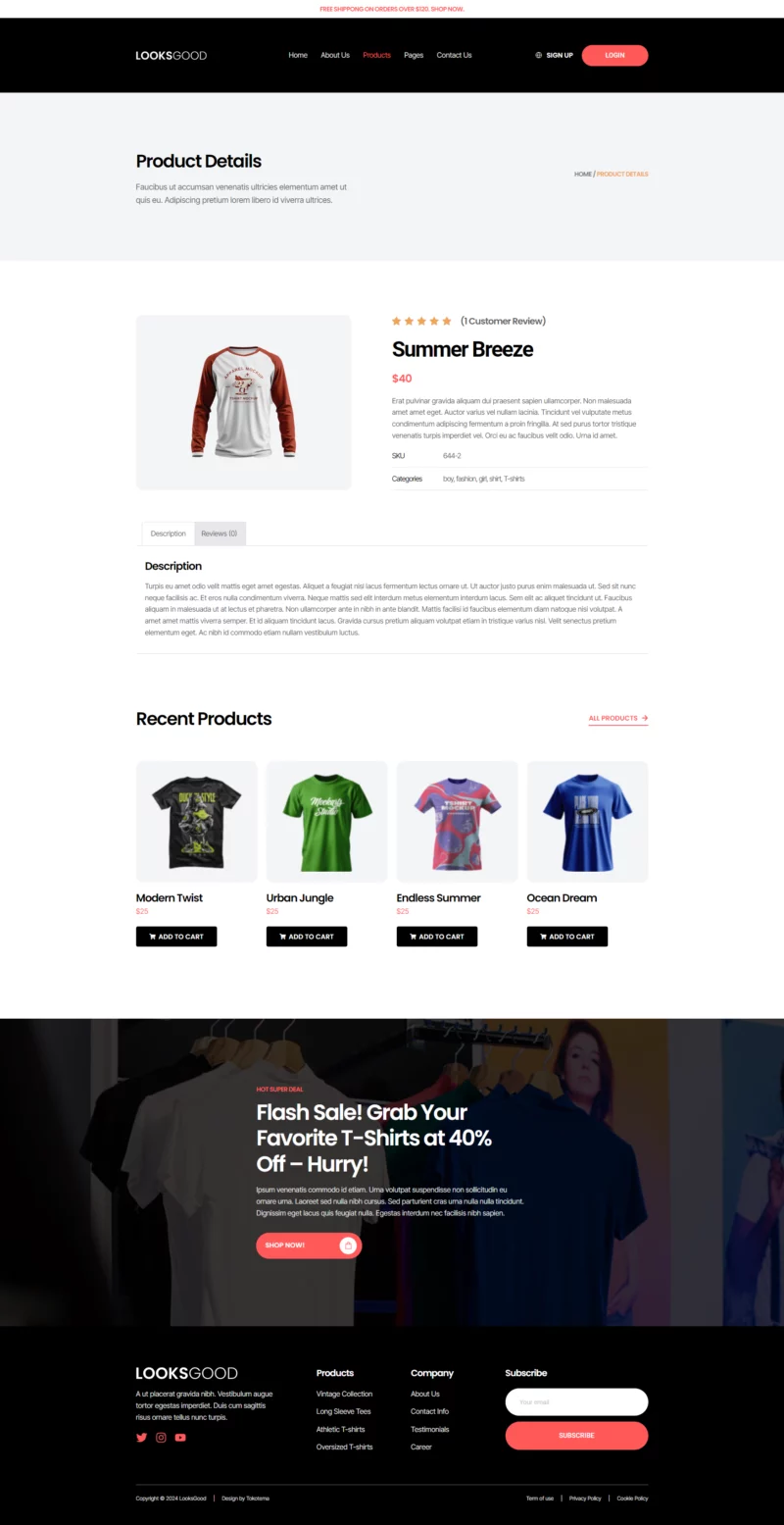 با ظاهری ساده، شیک و حرفهای، LooksGood به شما امکان میدهد تا با استفاده از عناصر طراحی مدرن، کسبوکار تیشرت خود را به شکل چشمگیری به نمایش بگذارید. این طراحی نه تنها جذاب است، بلکه به خوبی با نیازهای یک فروشگاه مد و پوشاک همخوانی دارد.