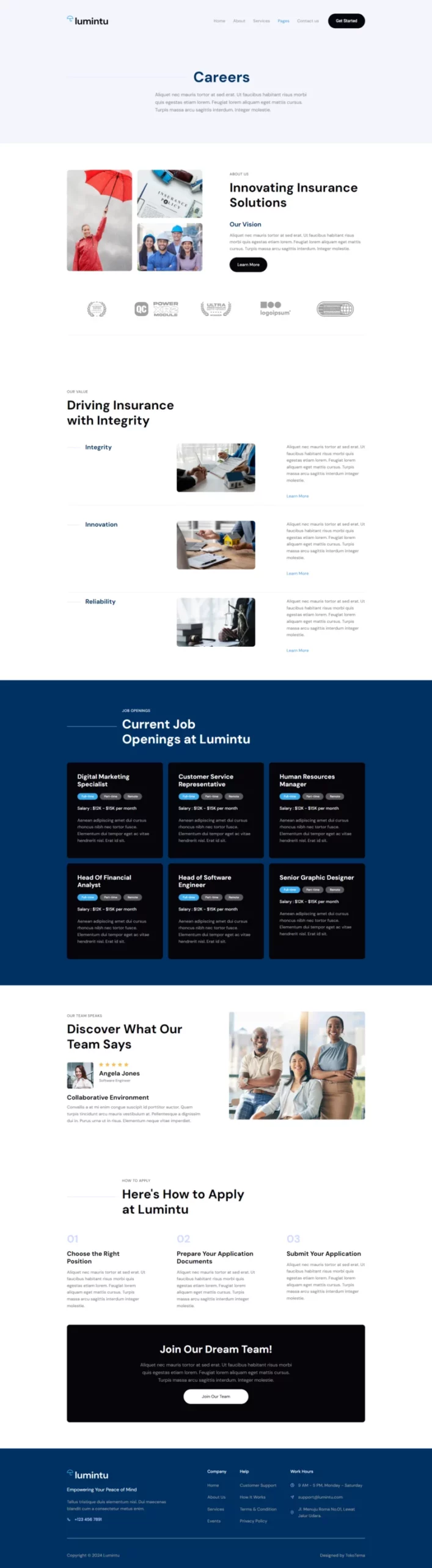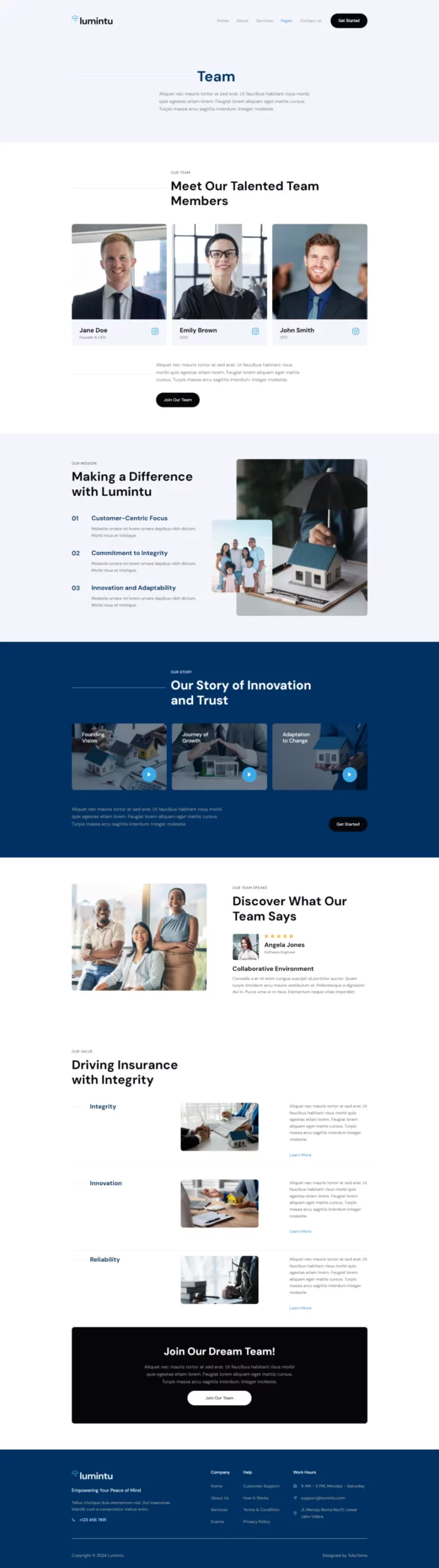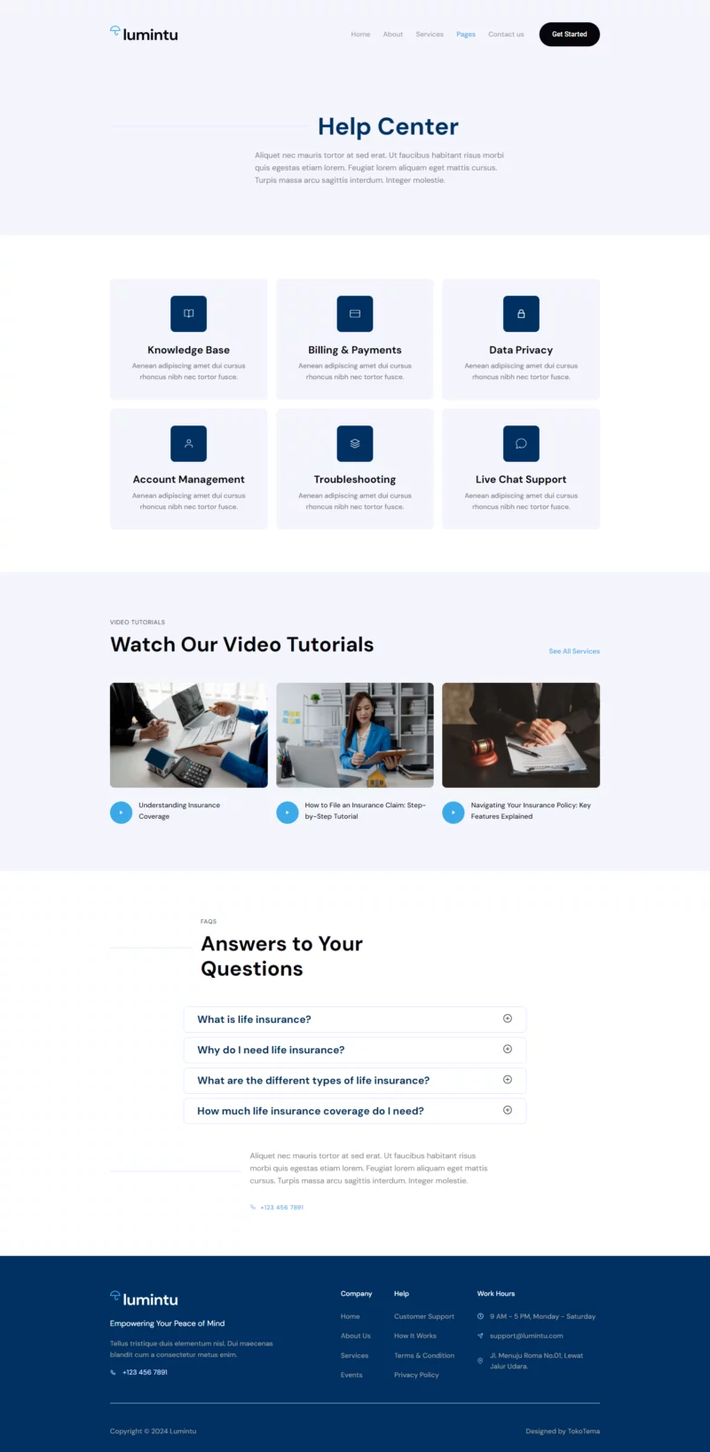 در صفحه «درباره ما»، داستان و ارزشهای آژانس خود را با مخاطبان به اشتراک بگذارید و اعتماد و اعتبار کسب کنید. در صفحه «خدمات»، طیف وسیعی از خدمات بیمهای را معرفی کنید و با ارائه اطلاعات دقیقتر در صفحه «جزئیات خدمات»، درک کاملی از خدمات ارائه شده به مشتریان بدهید. صفحه «فرصتهای شغلی» به شما کمک میکند تا تعهد خود به جذب استعدادهای جدید را نشان دهید. همچنین، میتوانید ساختار قیمتگذاری خود را بهطور واضح در صفحه «قیمتها» نشان دهید تا به مشتریان در اتخاذ تصمیمات آگاهانه کمک کنید. اعضای تیم خود را در صفحه «تیم» معرفی کنید تا بُعد شخصی به کسب و کارتان اضافه کنید. صفحات «تماس با ما» و «مرکز کمک» امکان ارتباط مستقیم و ارائه پشتیبانی را فراهم میکنند. همچنین، با طراحی یک صفحه 404 کاربرپسند، ناوبری سایت بهبود مییابد.