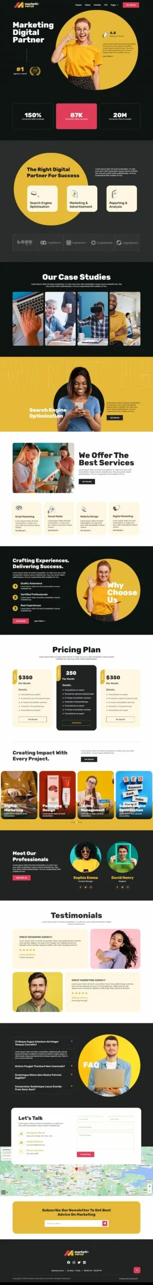 کیت قالب المنتور خدمات بازاریابی دیجیتال Marketiverse برای وبسایتهای بازاریابی دیجیتال طراحی شده است و با استفاده از المنتور، ایجاد وبسایتهای حرفهای و جذاب را بدون نیاز به کدنویسی ممکن میسازد. این قالبها به شما امکان میدهند تا با بخشهای مختلف محتوایی و طراحی مدرن، وبسایتی سریع و سازگار با سئو داشته باشید.