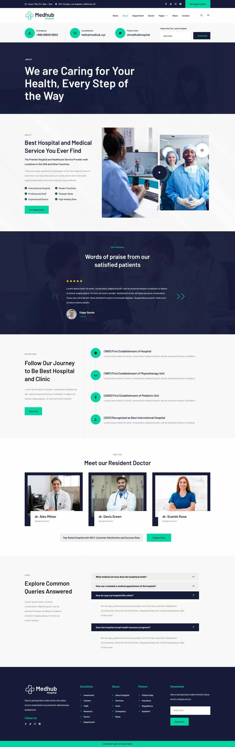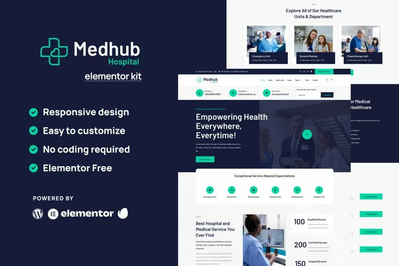 کیت قالب المنتور پزشکی MedHub دارای طراحی ساده و پاک با چیدمان مدرن است. برای استفاده با نسخه رایگان المنتور طراحی شده و آماده برای وارد کردن و استفاده مجدد برای وبسایتهای پزشکی، بیمارستان، دکتر، کلینیک، دندانپزشک یا هر سرویس مرتبط دیگر است. این قالب با بیشتر تمها سازگار است و بهینه شده برای استفاده با تم رایگان Hello Elementor میباشد.