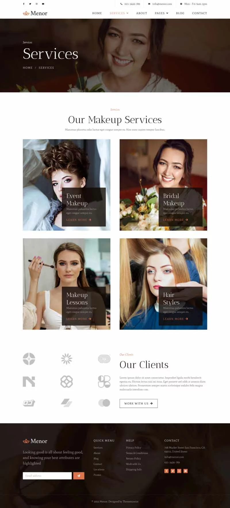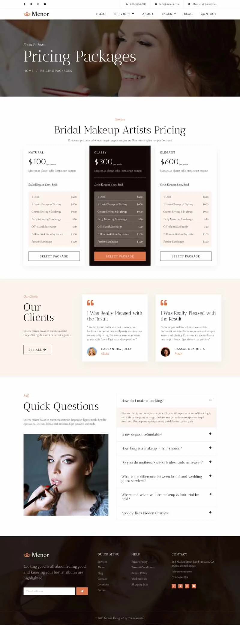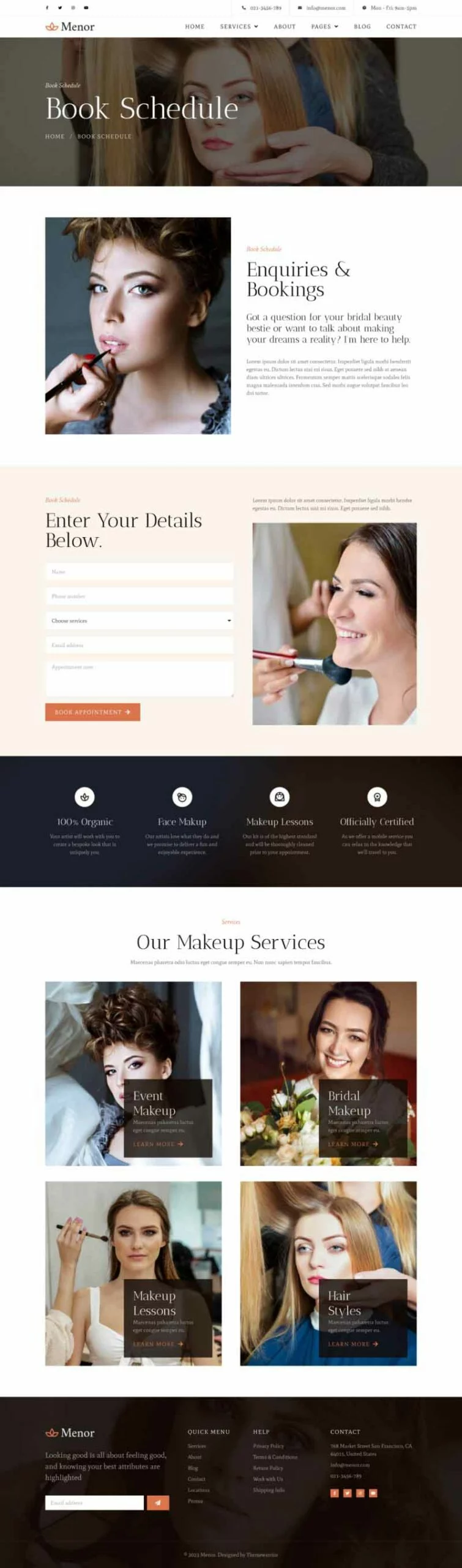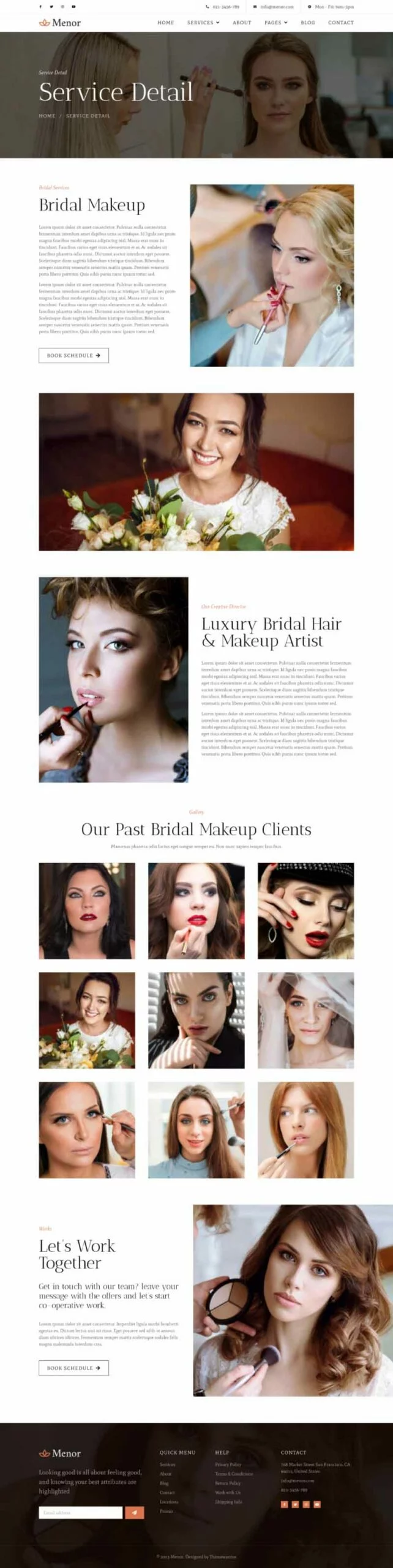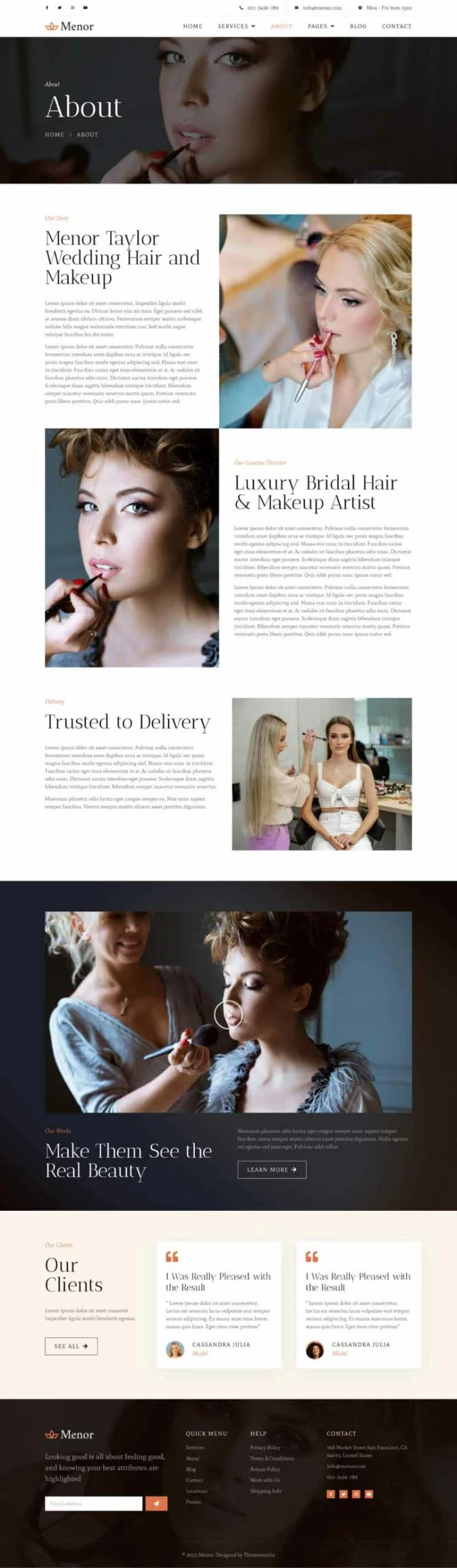 کیت قالب المنتور آرایشگر و استایلیست مو Menor به شما امکان میدهد تا یک وبسایت حرفهای و کاربرپسند برای خدمات آرایش و استایل خود ایجاد کنید. این کیت شامل مجموعهای از قالبهای زیبا و مدرن است که به شما کمک میکند تا تخصص و خدمات خود را به بهترین نحو ممکن به نمایش بگذارید. با استفاده از افزونه المنتور، بدون نیاز به دانش کدنویسی میتوانید وبسایت خود را شخصیسازی کنید و تجربهای جذاب و منحصر به فرد برای بازدیدکنندگان خود ایجاد کنید.