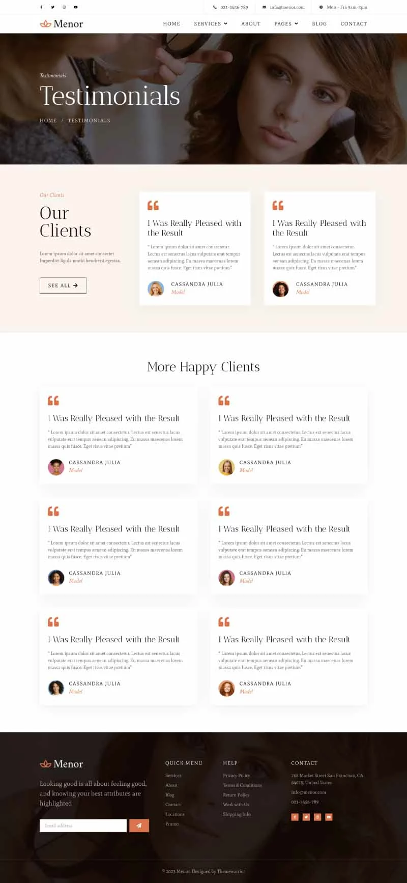 کیت قالب المنتور آرایشگر و استایلیست مو Menor برای ایجاد وبسایتها در وردپرس با استفاده از افزونه صفحهساز المنتور طراحی شده است. قالبهای این کیت به طور خاص برای آرایشگران و استایلیستهای مو طراحی شدهاند، تا وبسایت شما بازتابی از تخصص و حرفهای بودن شما باشد.