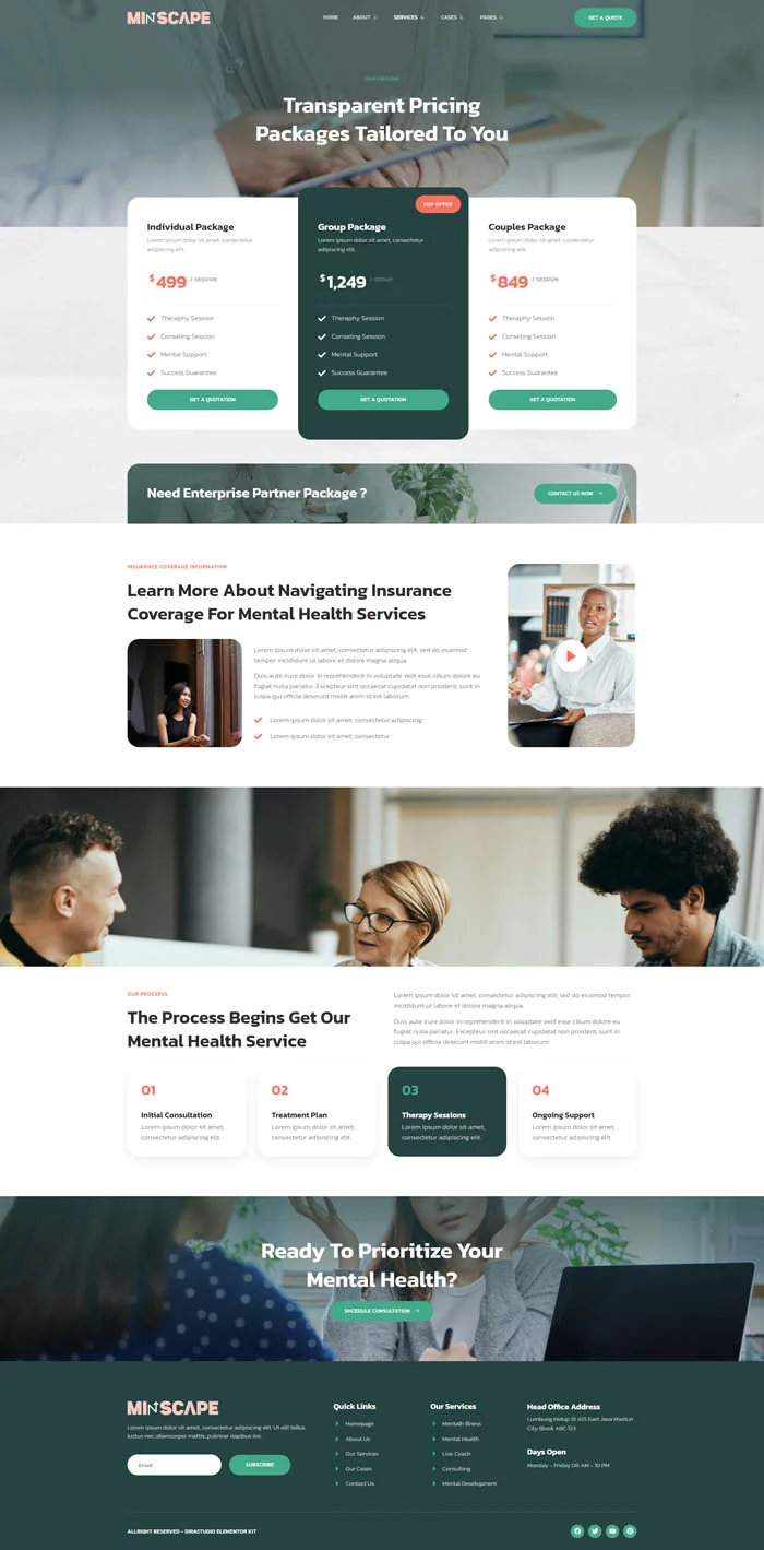 بازدیدکنندگان خود را با یک طراحی معاصر که حرفهای بودن را به نمایش میگذارد، تحت تأثیر قرار دهید. کیت قالب المنتور مشاوره سلامت روان Mindscape یک طراحی تمیز و شیک ارائه میدهد که تجربه کاربری دلپذیری را تضمین میکند.