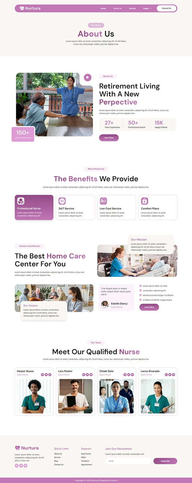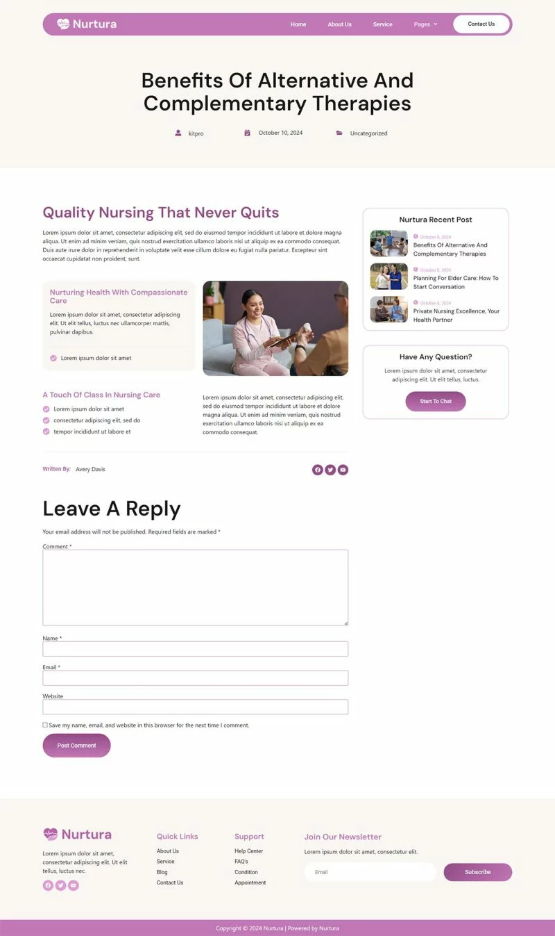 Nurtura یک قالب آماده المنتور حرفهای است که به شما این امکان را میدهد تا به سرعت و به سادگی وبسایتهای مربوط به کسبوکار خود را با استفاده از افزونه المنتور برای وردپرس ایجاد کنید. این کیت یک تم وردپرس نیست، بلکه شامل محتوای صفحات برای سازنده صفحات المنتور است. کیت قالب المنتور مراقبت از سالمندان Nurtura بهطور خاص برای استفاده با قالب رایگان Hello Elementor بهینهسازی شده است، اما میتوان آن را با اکثر تمهایی که از المنتور پشتیبانی میکنند نیز استفاده کرد.