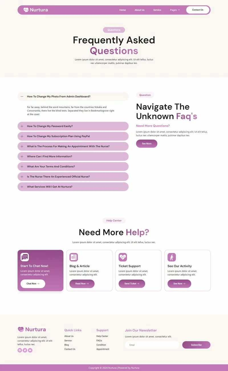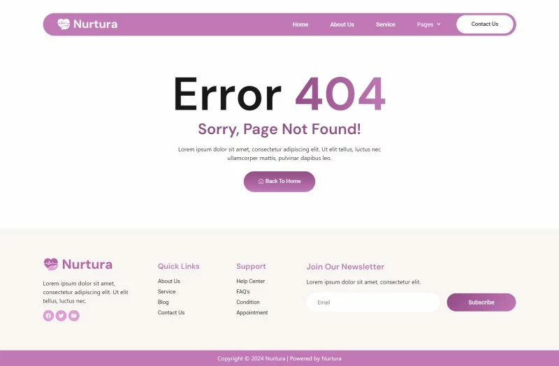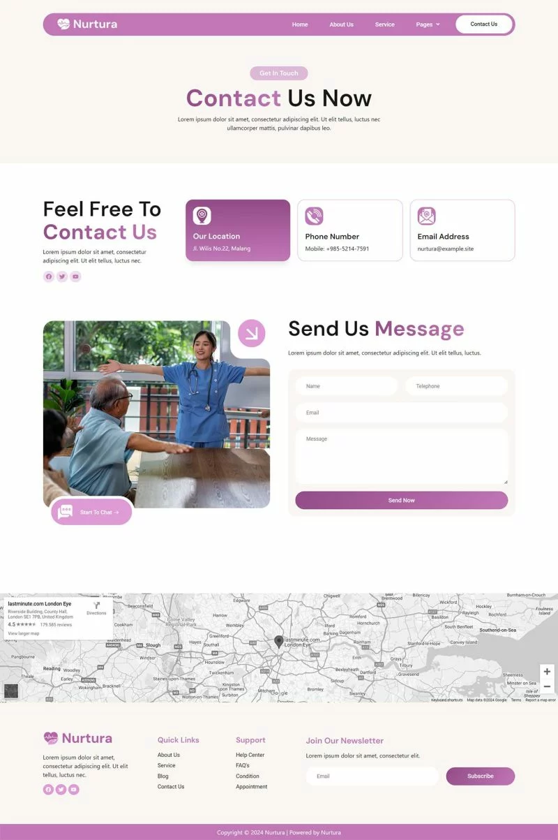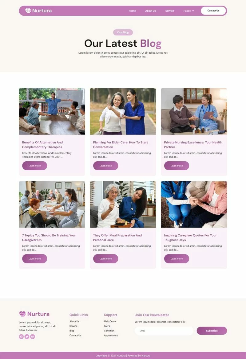 کیت قالب Nurtura با طراحی زیبا و مدرن خود، فضایی مناسب برای معرفی خدمات مراقبت از سالمندان فراهم میکند. طراحیهای بصری جذاب و قابلیتهای کاربری این کیت به شما کمک میکند تا یک وبسایت کاربرپسند و جذاب بسازید.