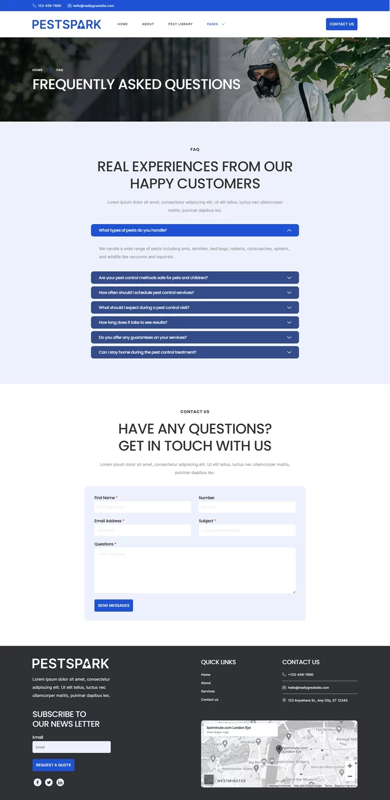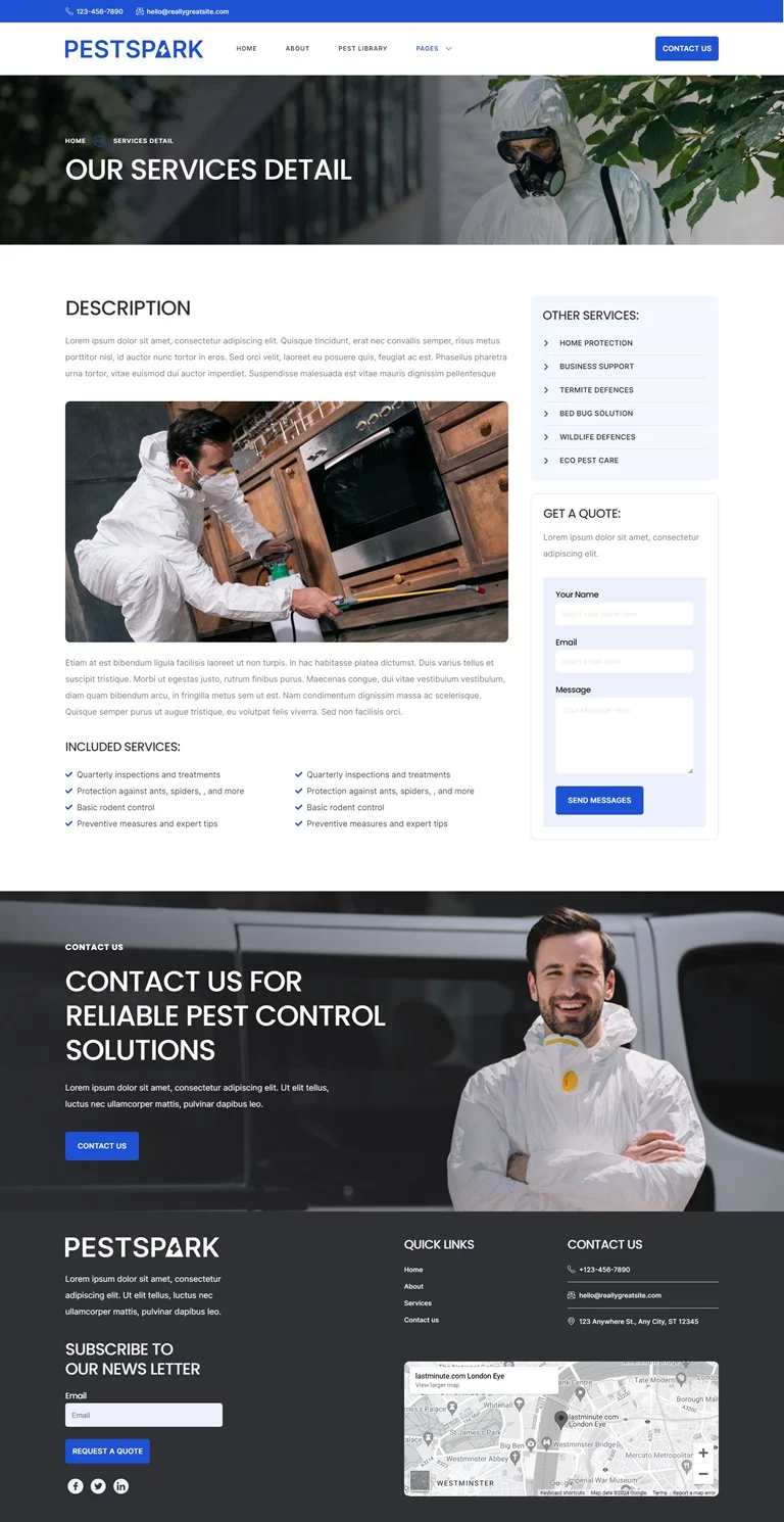 توجه: کیت قالب المنتور خدمات کنترل آفات Pestspark یک قالب وردپرس نیست. این یک کیت قالب جامع است که تمام محتوای صفحات مورد نیاز برای افزونه صفحهساز المنتور را فراهم میکند و به کاربران انعطافپذیری در طراحی بدون محدودیت را میدهد. این کیت برای استفاده با قالب رایگان Hello Elementor بهینهسازی شده است، اما با بیشتر قالبهایی که از المنتور پشتیبانی میکنند بهخوبی سازگار است.
