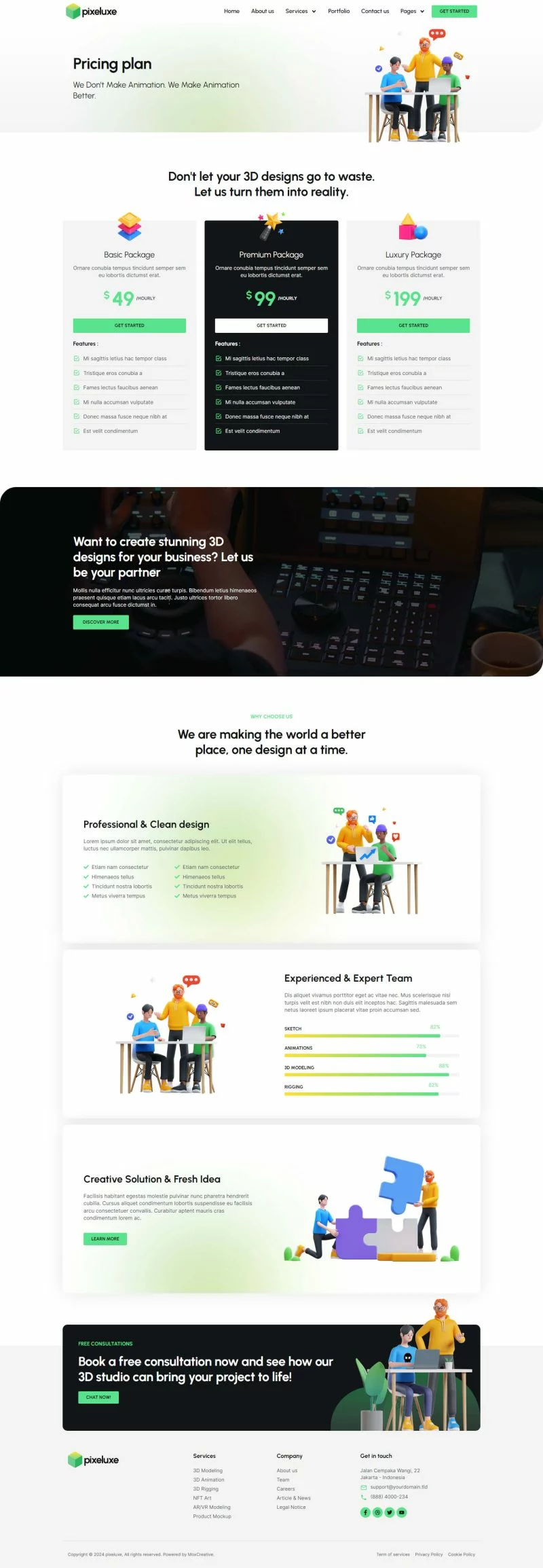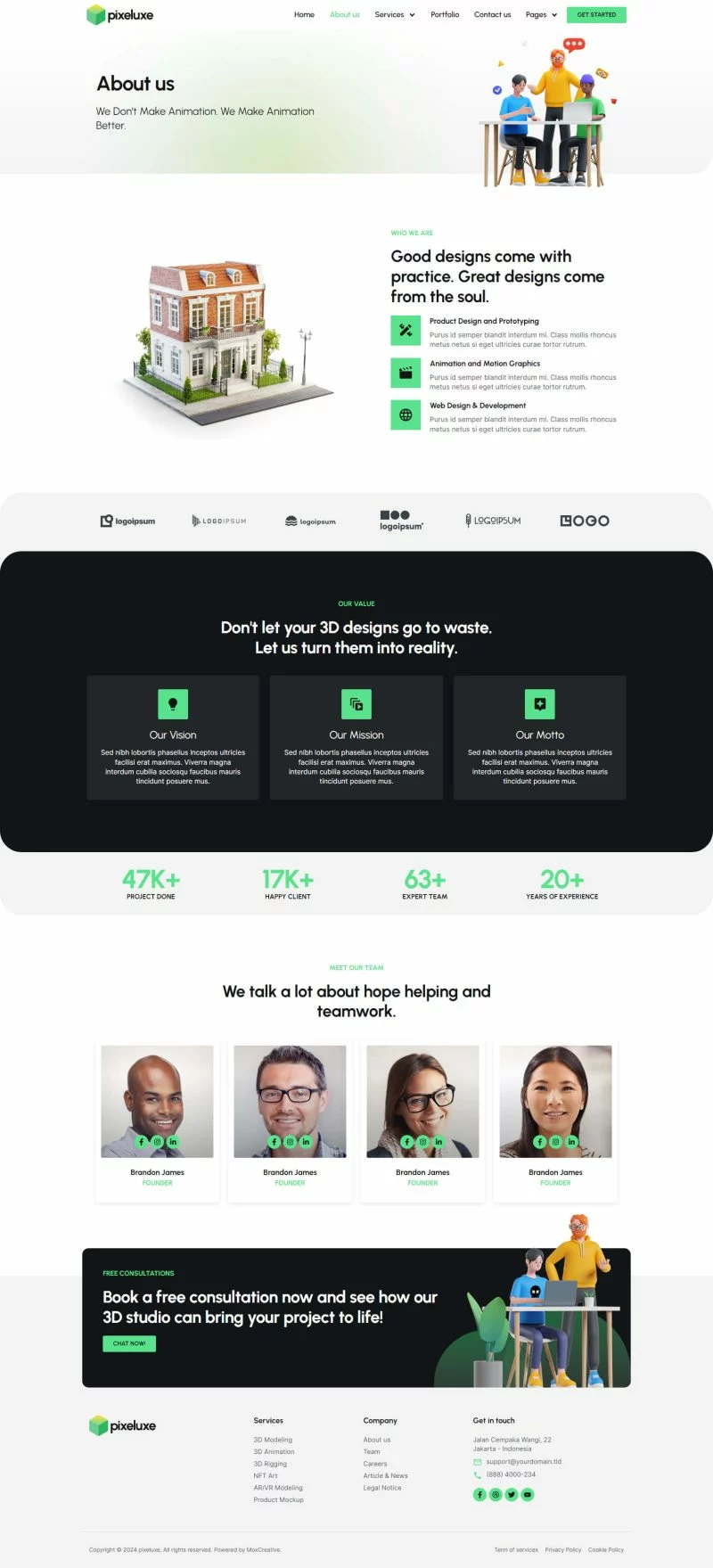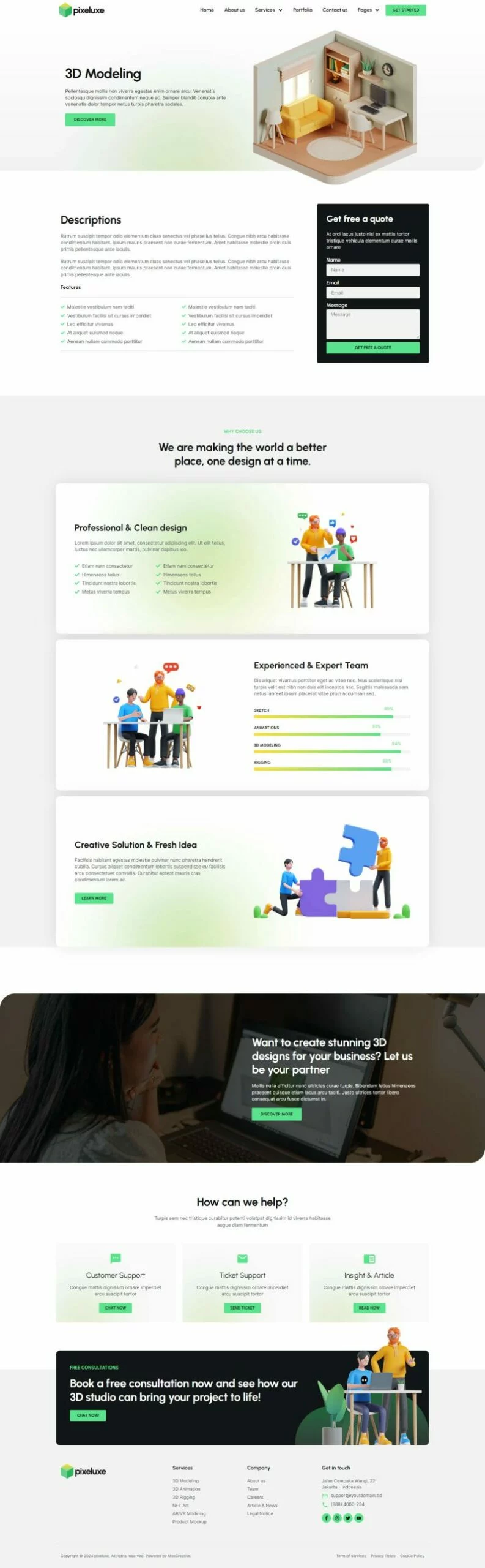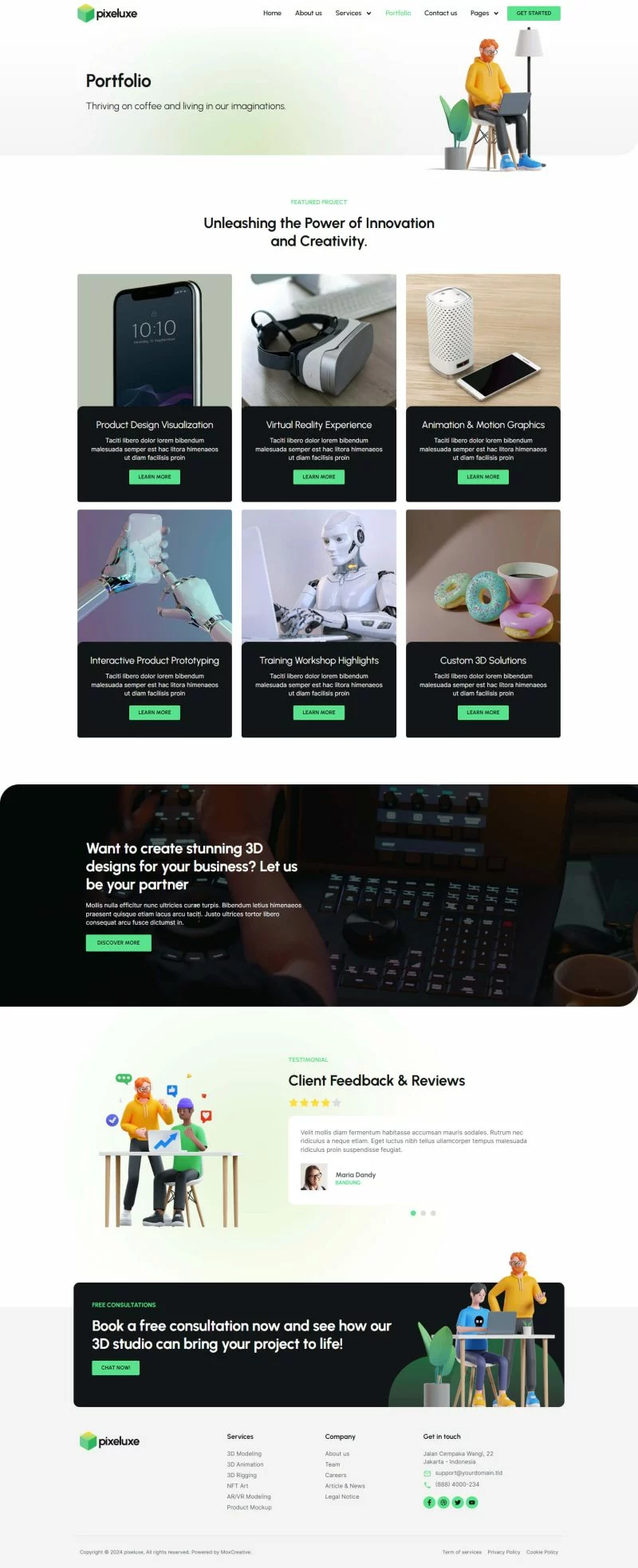 کیت قالب المنتور استودیو طراحی سه بعدی Pixeluxe شامل بیش از 12 قالب از پیش ساخته شده با طراحی جذاب و سبک مدرن میباشد. شما میتوانید از این کیت قالب خلاقانه برای هر نوع کسبوکار یا خدماتی مانند استودیو طراحی، طراحی داخلی، استودیو انیمیشن سهبعدی، انیمیشن ویدئویی، مدلسازی سهبعدی، خدمات فیلم سهبعدی، استودیو داراییهای بازی سهبعدی و بسیاری دیگر استفاده کنید.