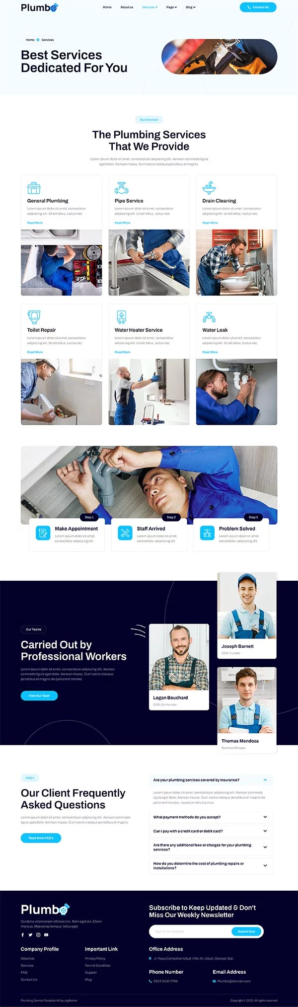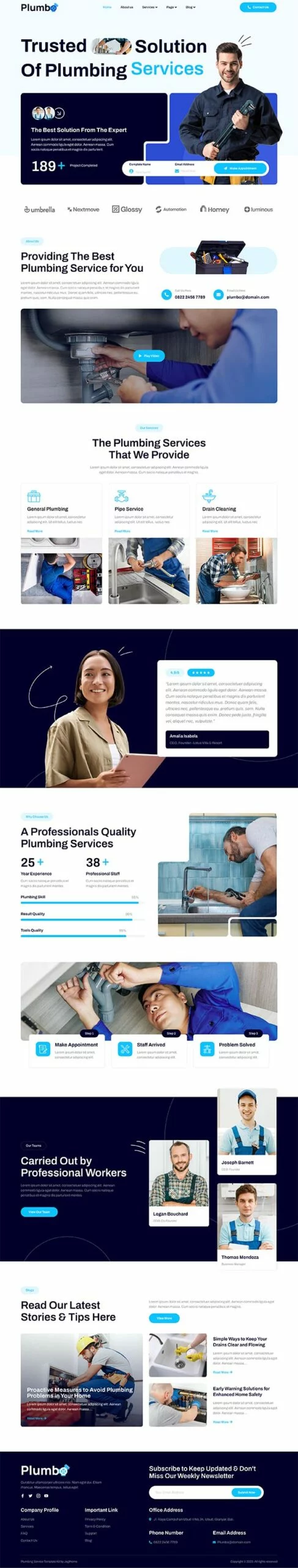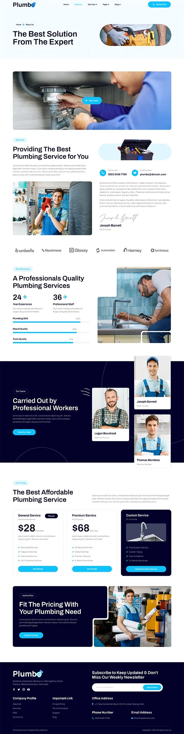 کیت قالب المنتور خدمات لوله کشی Plumbo دارای طرح 100% پاسخگو و بسیار آسان برای سفارشیسازی است زیرا از المنتور استفاده میکند، بنابراین میتوانید بدون نوشتن حتی یک خط کد، هر جنبهای از وبسایت خود را شخصیسازی کنید.