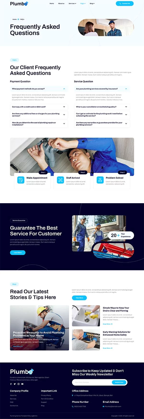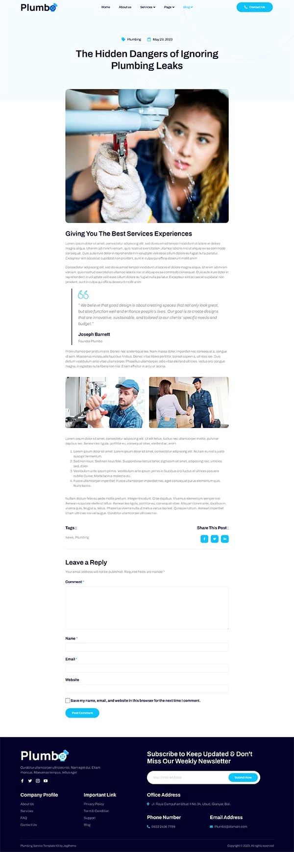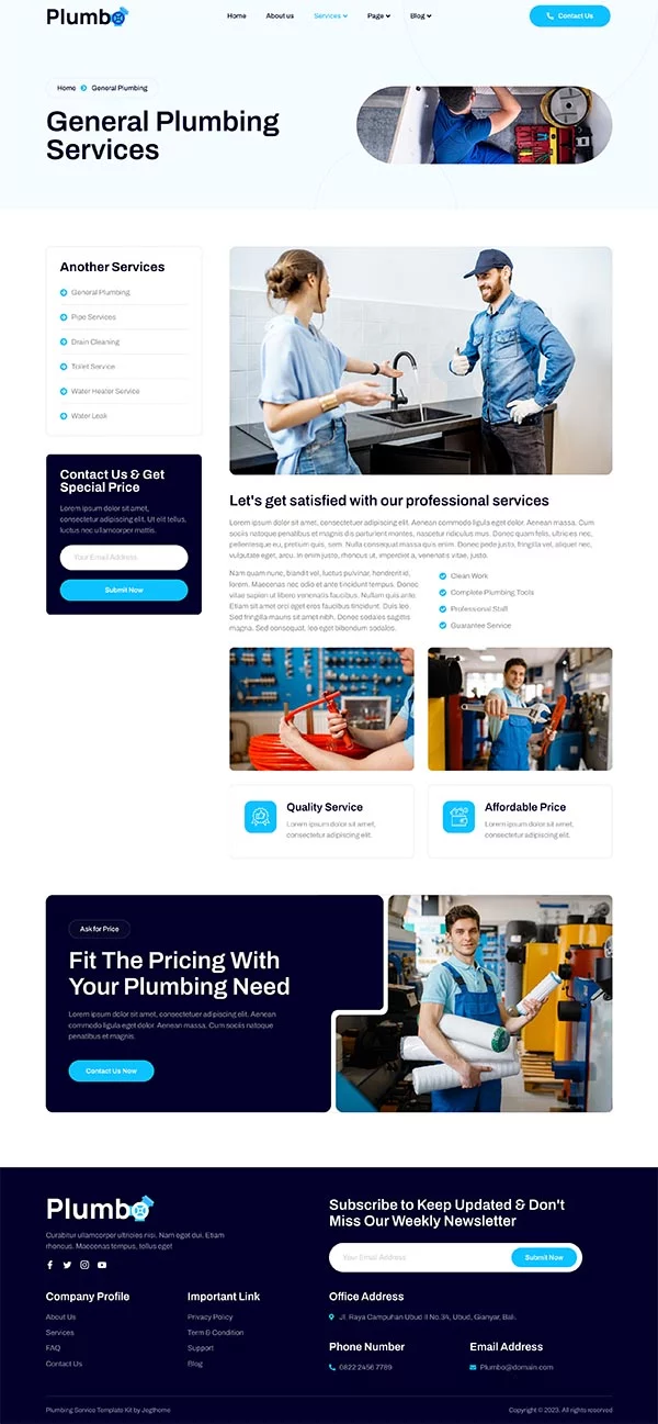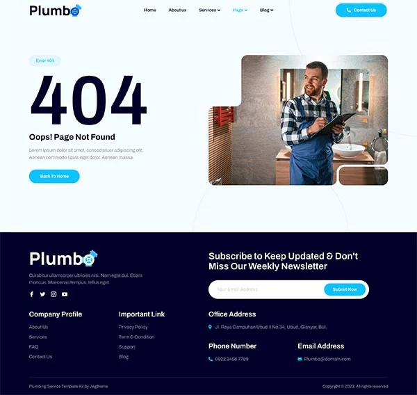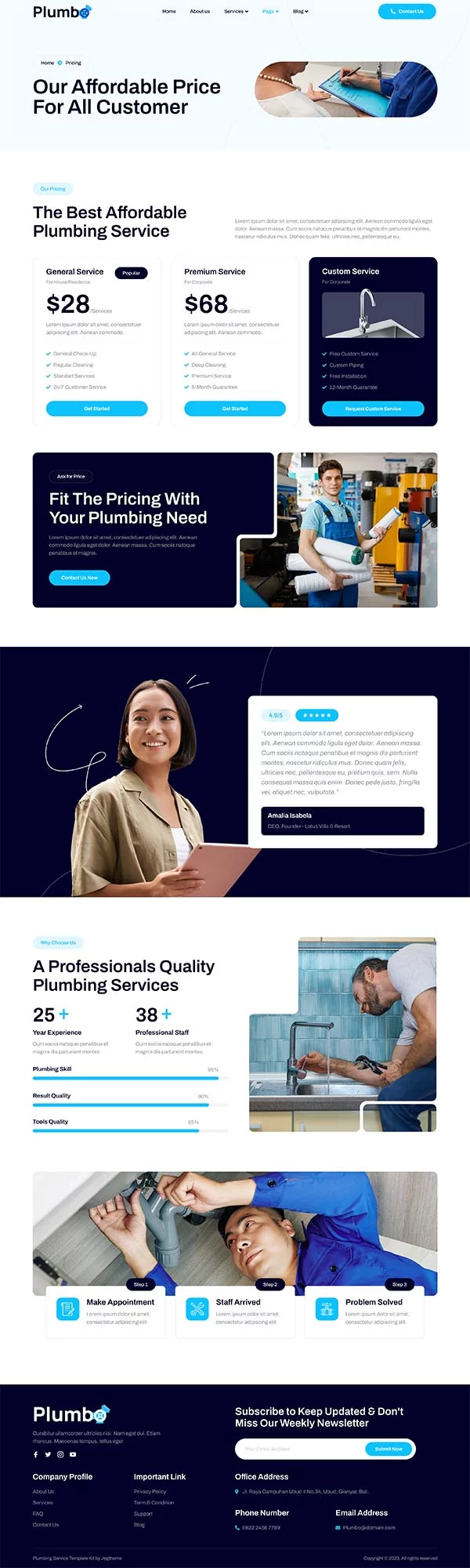 کیت قالب المنتور خدمات لوله کشی Plumbo دارای طرح 100% پاسخگو و بسیار آسان برای سفارشیسازی است زیرا از المنتور استفاده میکند، بنابراین میتوانید بدون نوشتن حتی یک خط کد، هر جنبهای از وبسایت خود را شخصیسازی کنید.