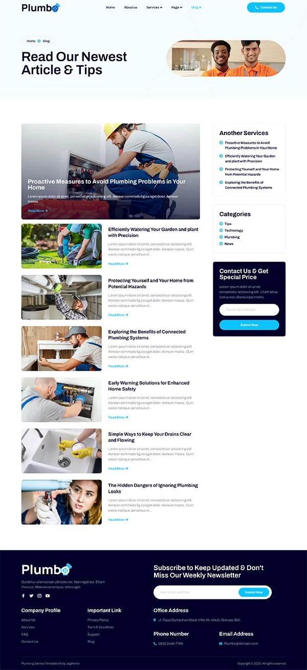 کیت قالب المنتور خدمات لوله کشی Plumbo به شما امکان میدهد تا به سادگی یک وبسایت حرفهای برای خدمات لولهکشی و تعمیرات خانگی ایجاد کنید. با استفاده از این کیت، میتوانید بدون نیاز به کدنویسی، تمام جزئیات وبسایت خود را شخصیسازی کنید. قالبهای پیشساخته شامل صفحات خانه، درباره ما، خدمات، قیمتگذاری، سوالات متداول، بلاگ و تماس با ما هستند. این کیت با اکثر مرورگرها سازگار بوده و طرحهای پاسخگو و آماده رتینا دارد، بنابراین وبسایت شما در همه دستگاهها به خوبی نمایش داده میشود. با Plumbo میتوانید تخصص خود را به بهترین شکل به نمایش بگذارید و مشتریان جدیدی جذب کنید.