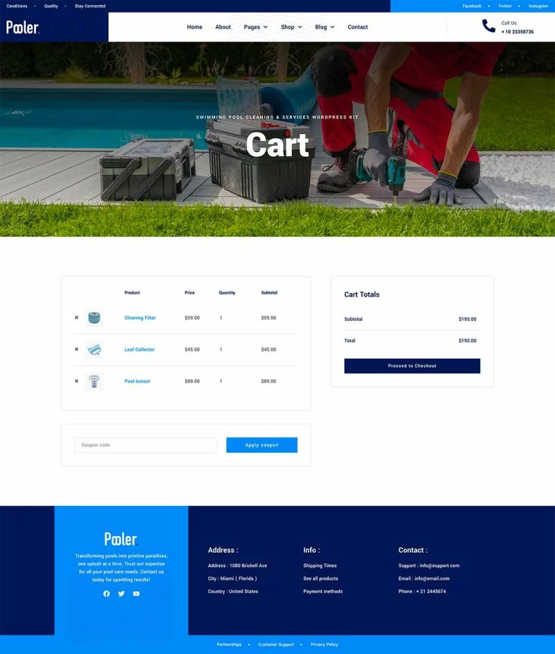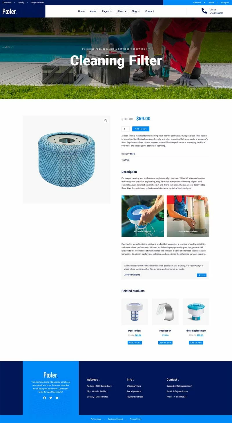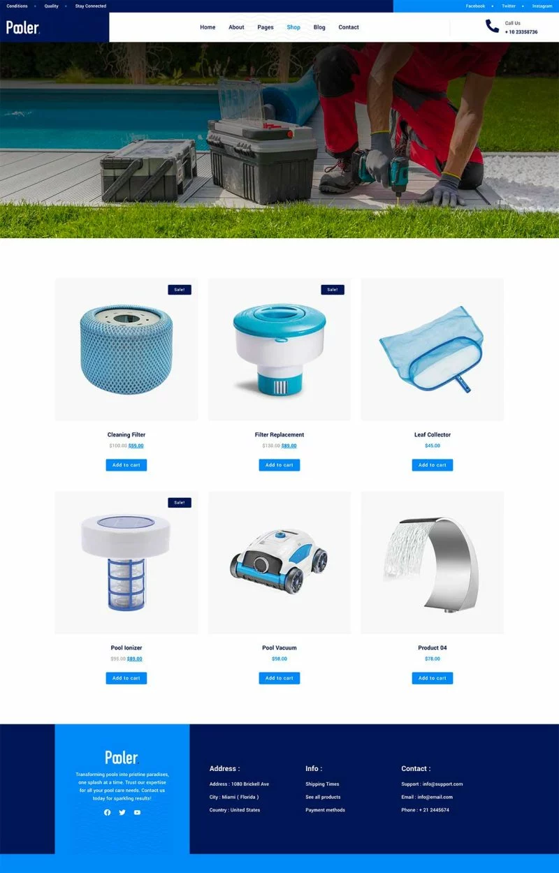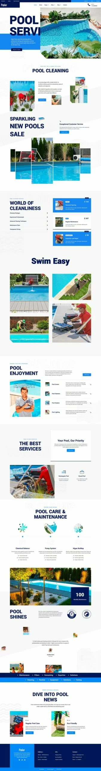 کیت قالب المنتور خدمات تمیزکاری استخر Pooler با طراحی مدرن و قابلیتهای سفارشیسازی پیشرفته، این قالب به شما کمک میکند تا بدون نیاز به دانش کدنویسی، یک وبسایت با عملکرد بالا و ظاهری جذاب ایجاد کنید. از قالبهای متنوع آن میتوان برای ایجاد صفحات مختلف استفاده کرد و با استفاده از Elementor Pro میتوان امکانات بیشتری را به وبسایت اضافه کرد.