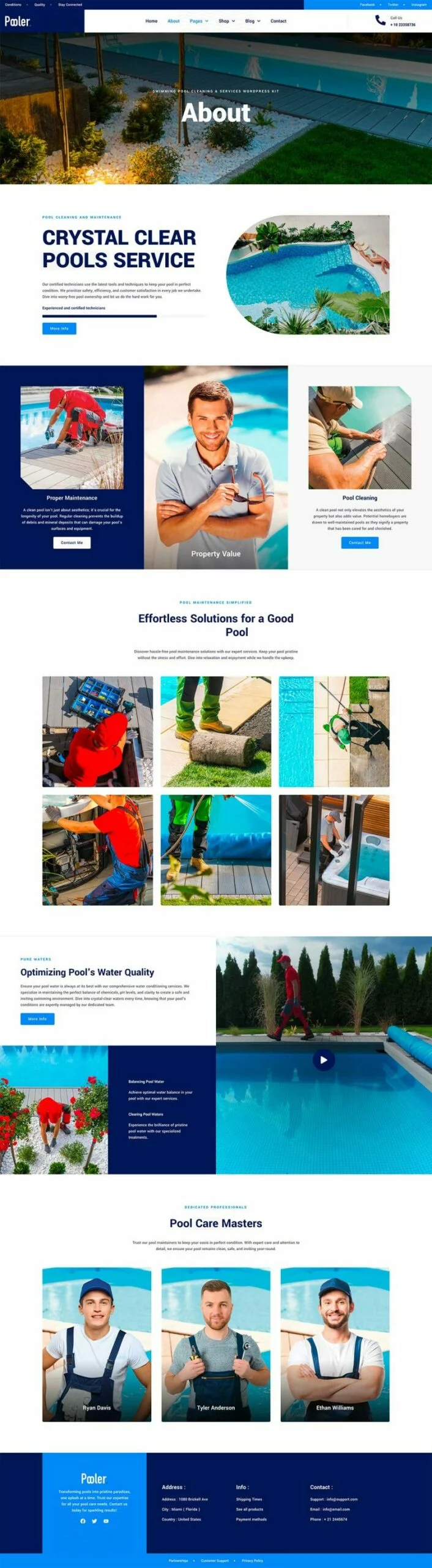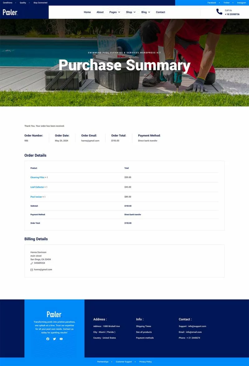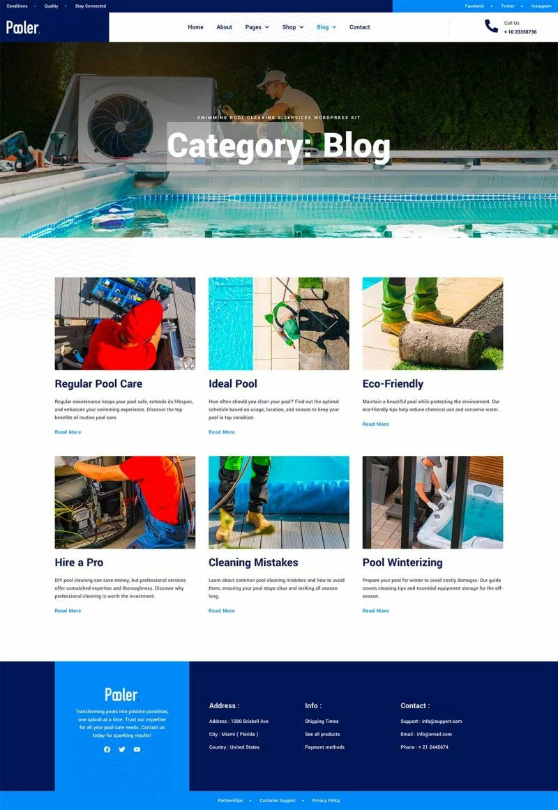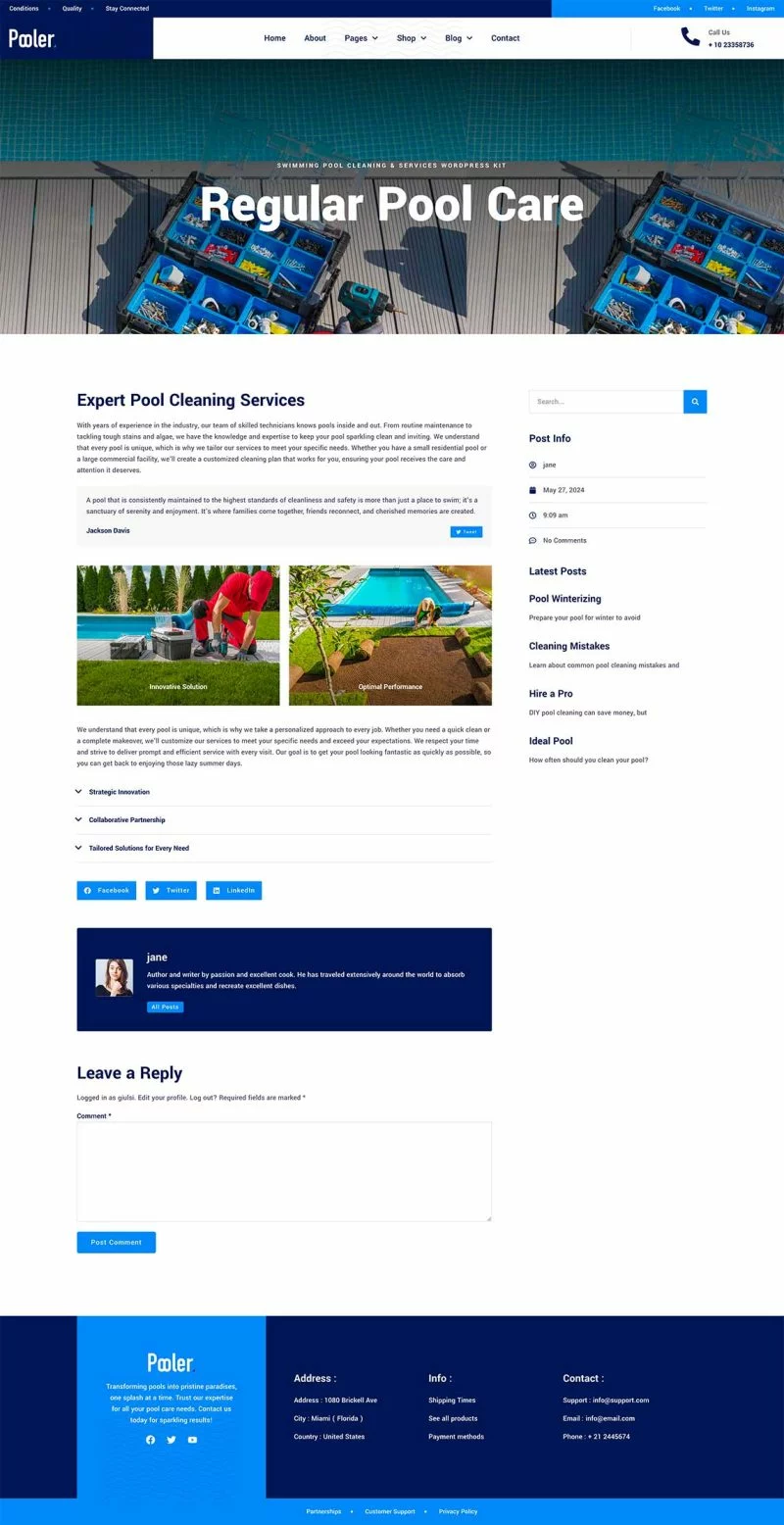 کیت قالب المنتور خدمات تمیزکاری استخر Pooler با طراحی مدرن و قابلیتهای سفارشیسازی پیشرفته، این قالب به شما کمک میکند تا بدون نیاز به دانش کدنویسی، یک وبسایت با عملکرد بالا و ظاهری جذاب ایجاد کنید. از قالبهای متنوع آن میتوان برای ایجاد صفحات مختلف استفاده کرد و با استفاده از Elementor Pro میتوان امکانات بیشتری را به وبسایت اضافه کرد.