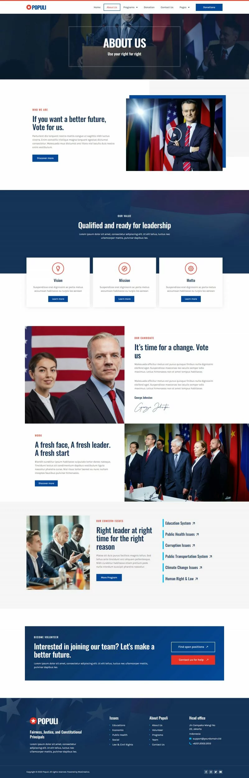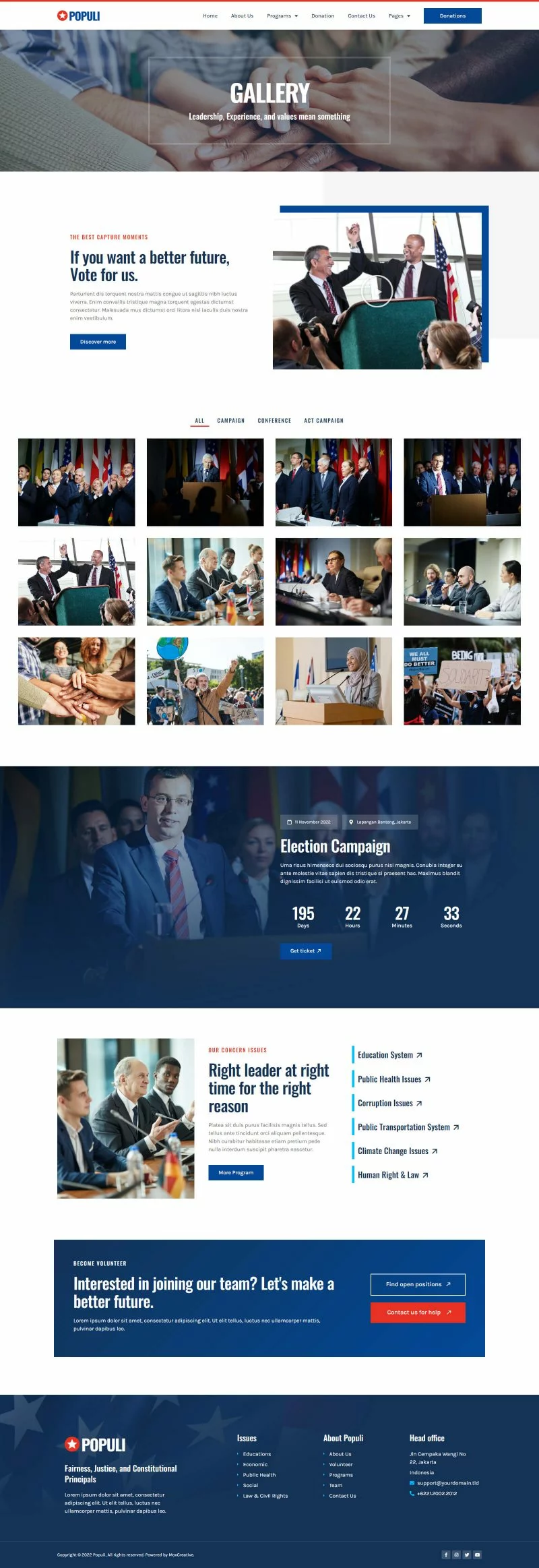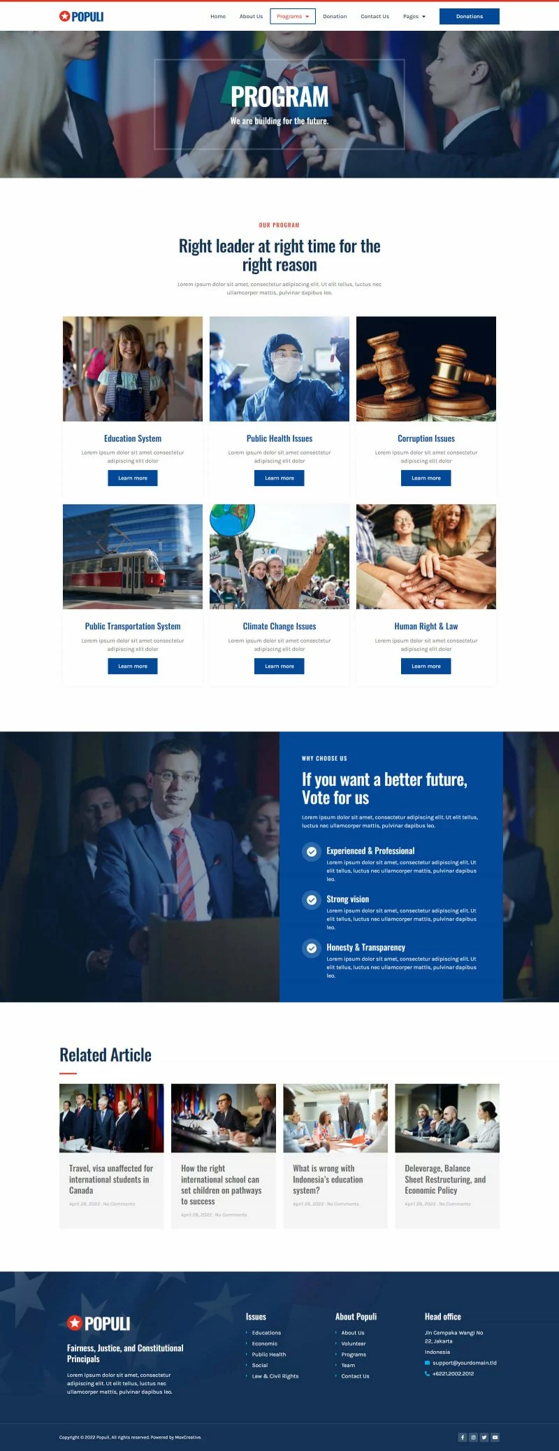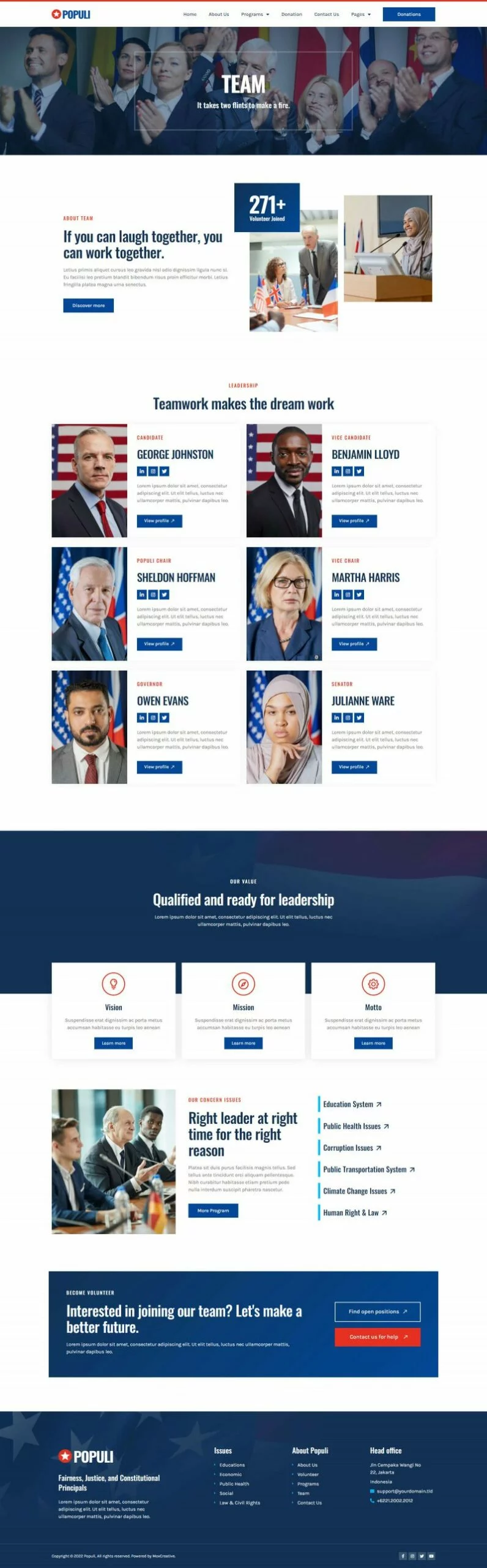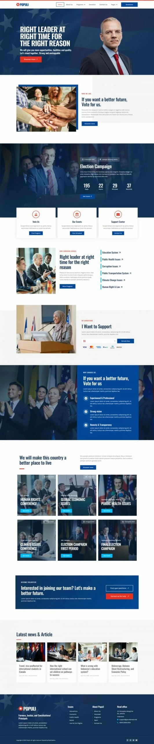“کیت قالب المنتور سیاسی Populi”،یک کیت برای وبسایتهای سیاستمداران است. این کیت قالب به شما کمک میکند تا هر وبسایتی مرتبط با سیاستمداران مانند کمپینهای سیاسی، سناتورها، کارمندان عمومی و مقامات دولتی ایجاد کنید. این کیت دارای بیش از 12 قالب پیشساخته با طراحی تمیز و سبک مدرن است.