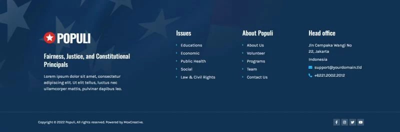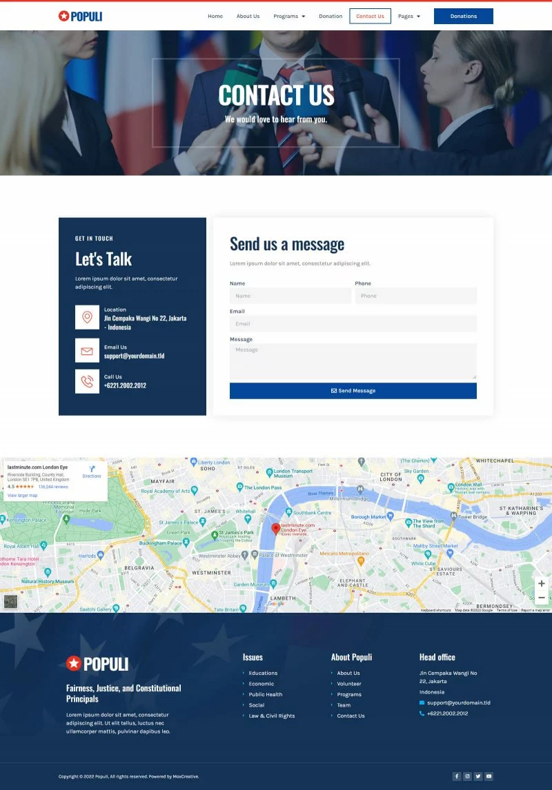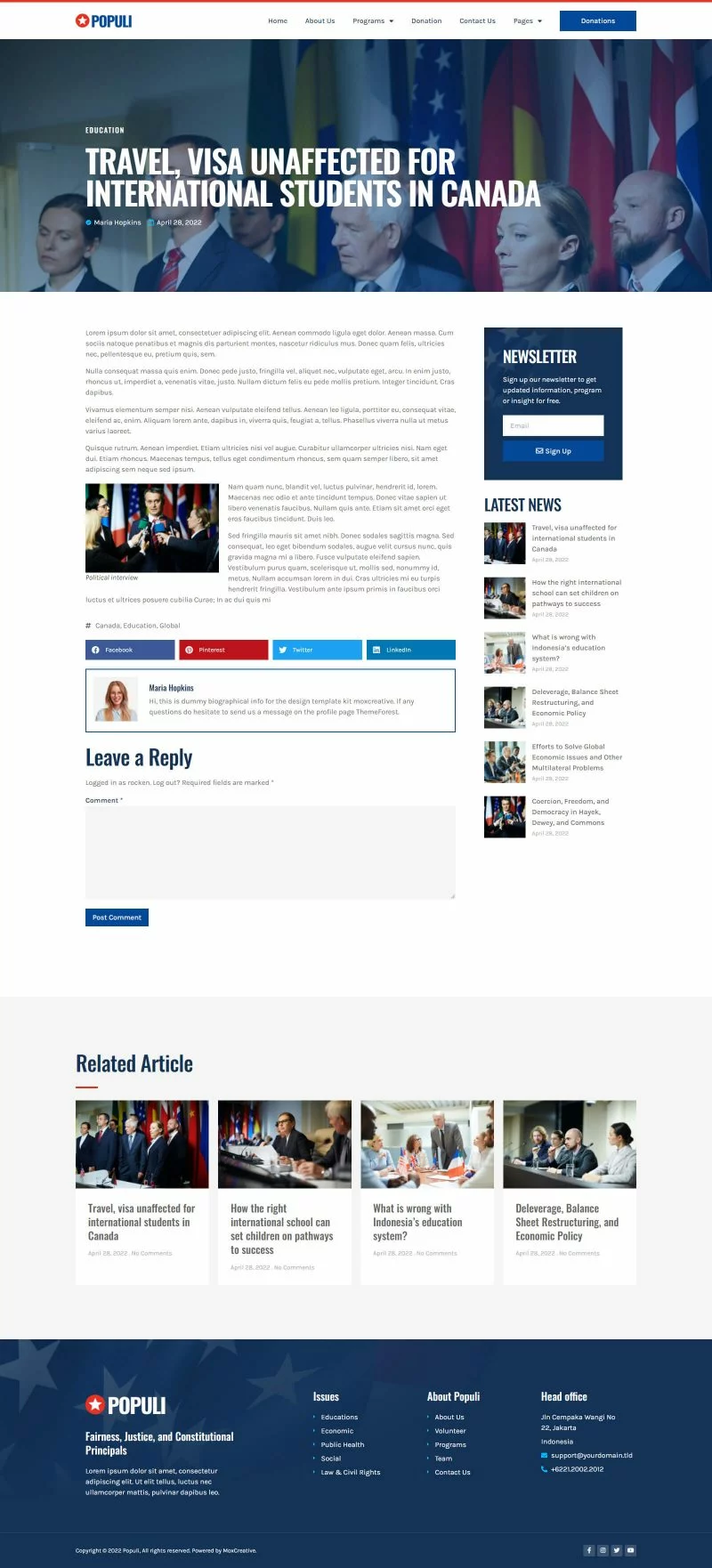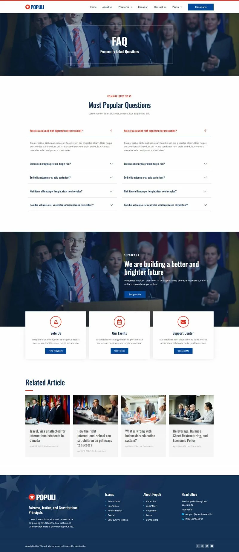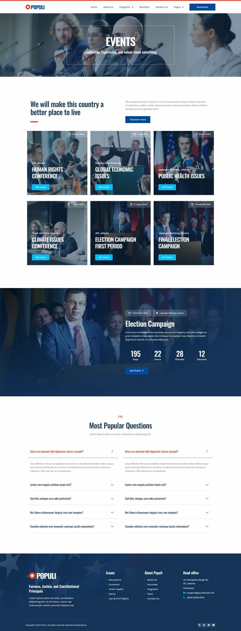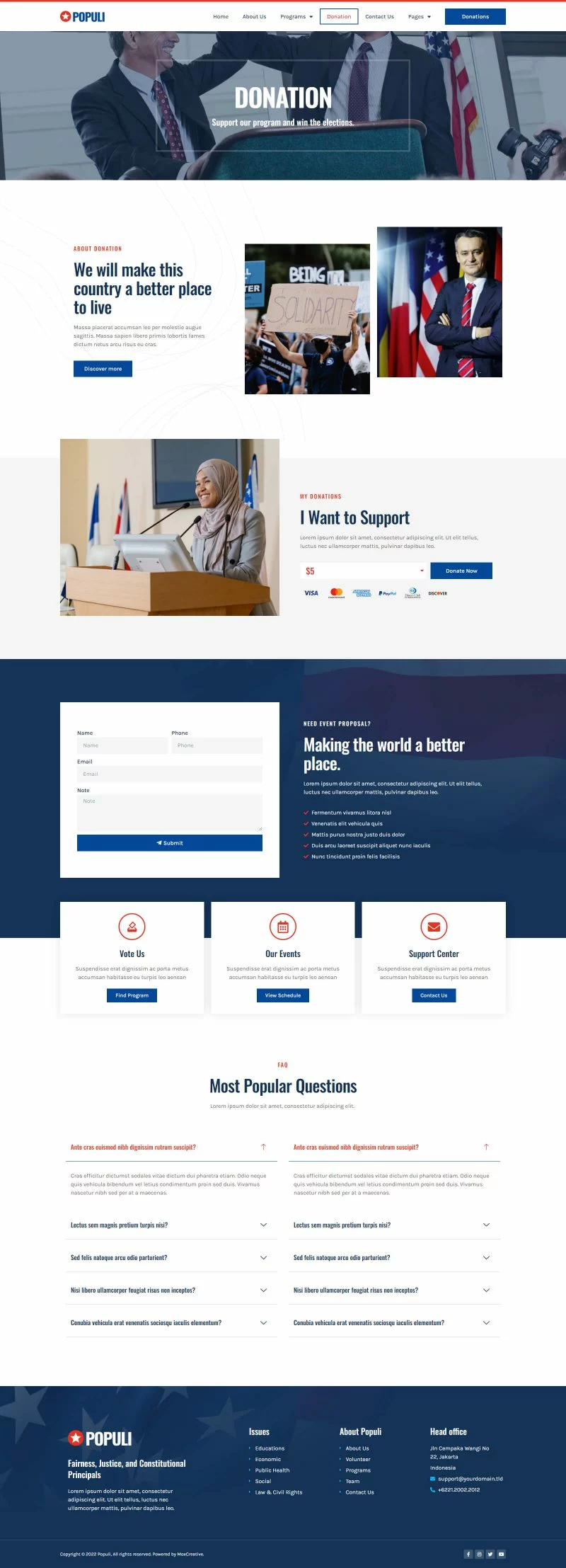 “کیت قالب المنتور سیاسی Populi”،یک کیت برای وبسایتهای سیاستمداران است. این کیت قالب به شما کمک میکند تا هر وبسایتی مرتبط با سیاستمداران مانند کمپینهای سیاسی، سناتورها، کارمندان عمومی و مقامات دولتی ایجاد کنید. این کیت دارای بیش از 12 قالب پیشساخته با طراحی تمیز و سبک مدرن است.
