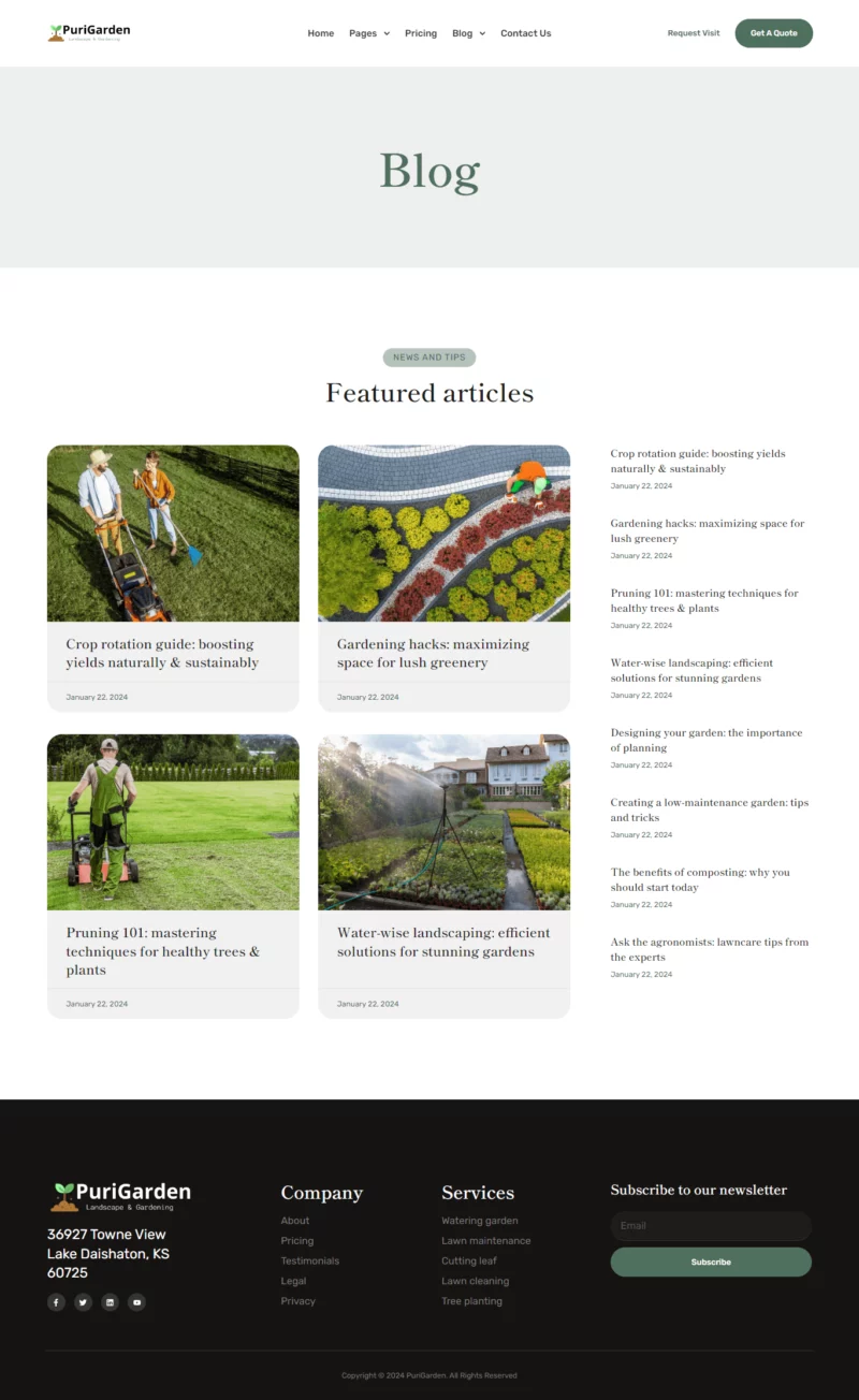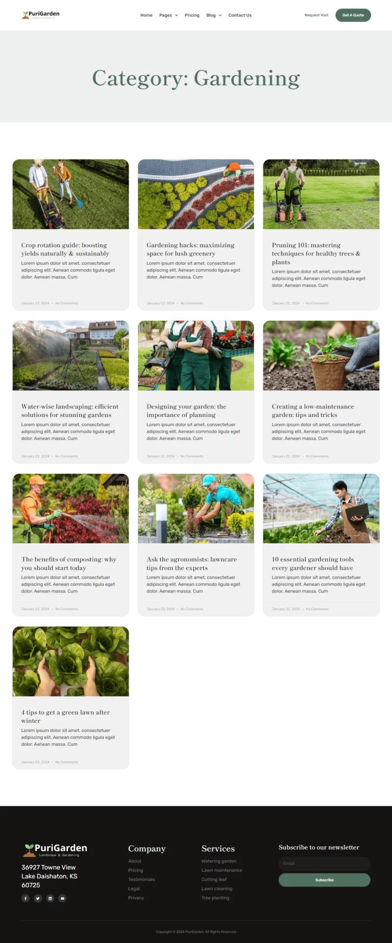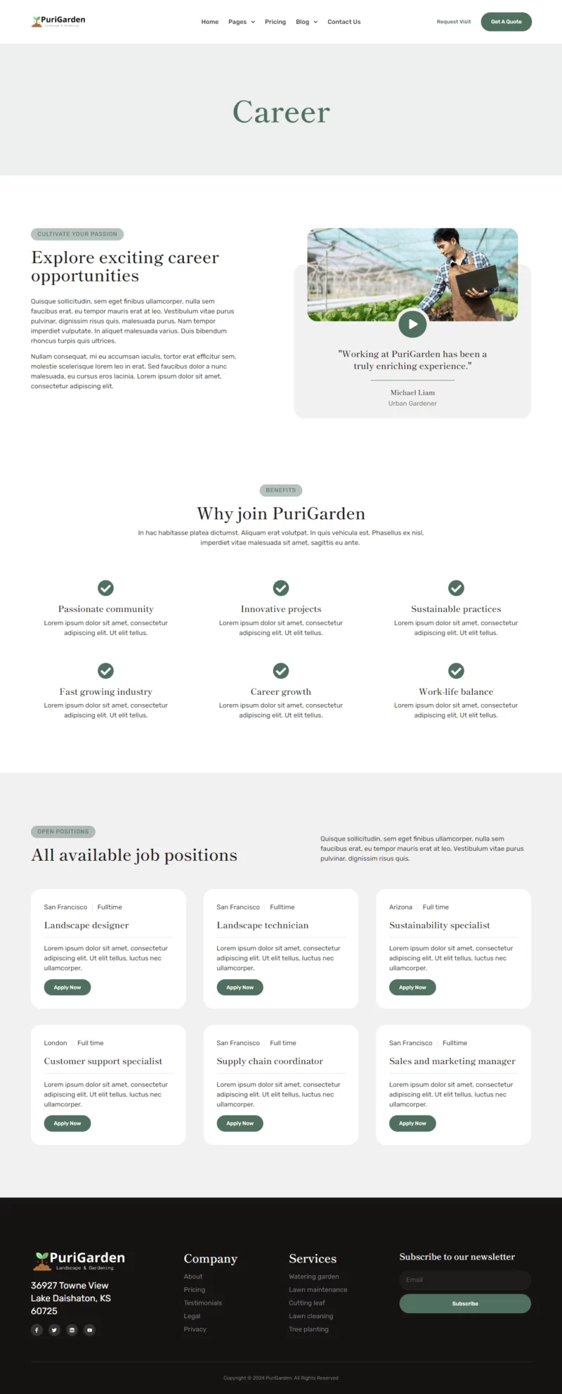 کیت قالب المنتور باغبانی و طراحی فضای سبز PuriGarden برای کسبوکارها و افرادی که میخواهند کارها و خدمات خود را به صورت حرفهای نمایش دهند، بسیار مناسب است. این قالب دارای طراحی زیبا و منحصربهفرد با چیدمان 100% واکنشگرا و آماده برای نمایش در دستگاههای با کیفیت بالا (رتینا) است و به سادگی قابل سفارشیسازی است. این کیت شامل بیش از 10 قالب از پیشساختهشده با طراحی ساده، مدرن و شیک است که بدون نیاز به کدنویسی، تنها با کشیدن و رها کردن قابل استفاده هستند.