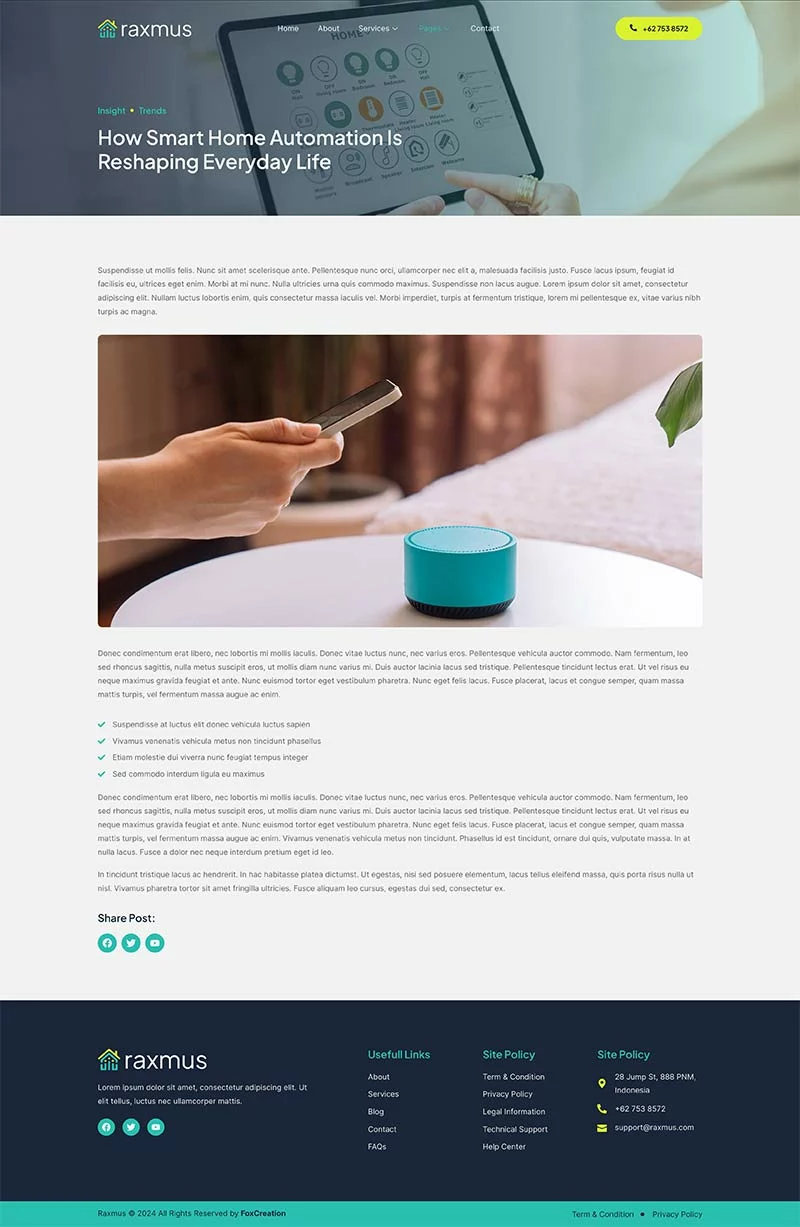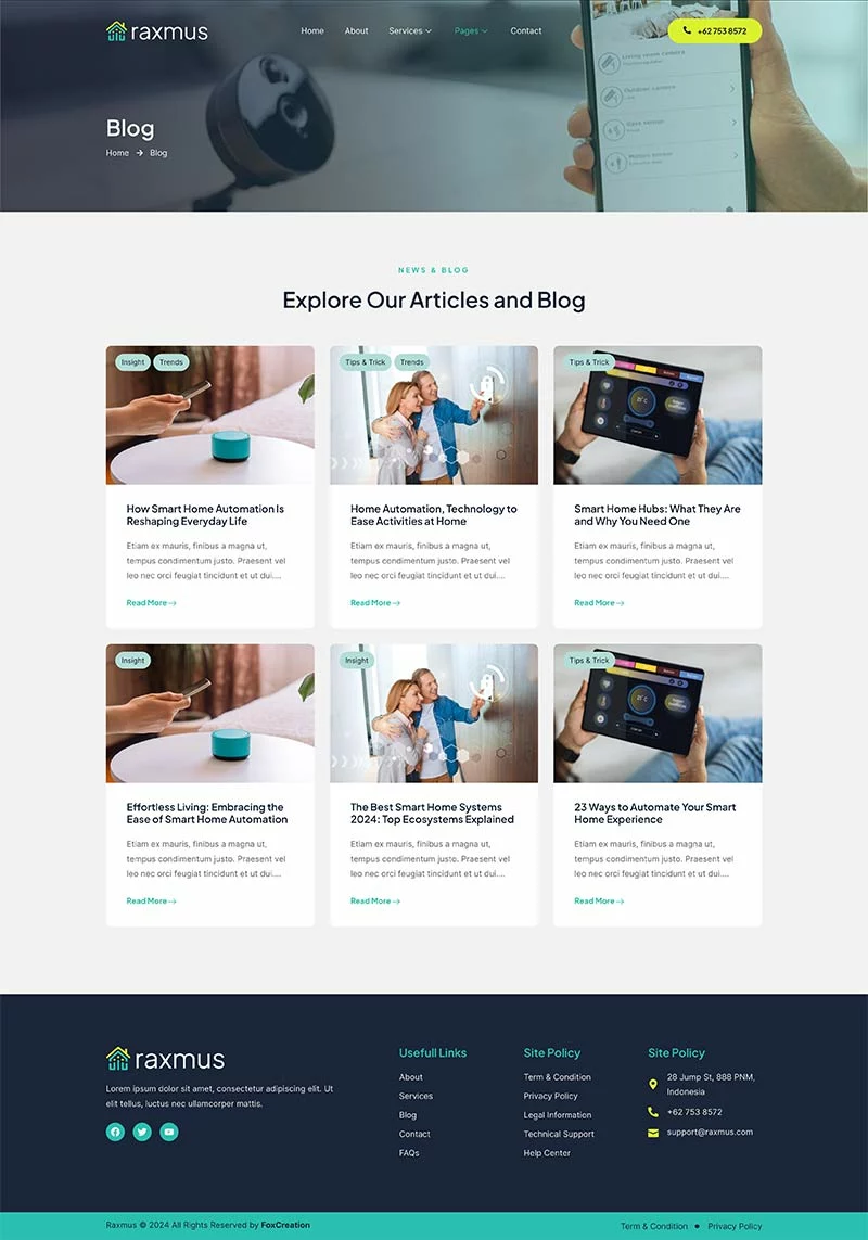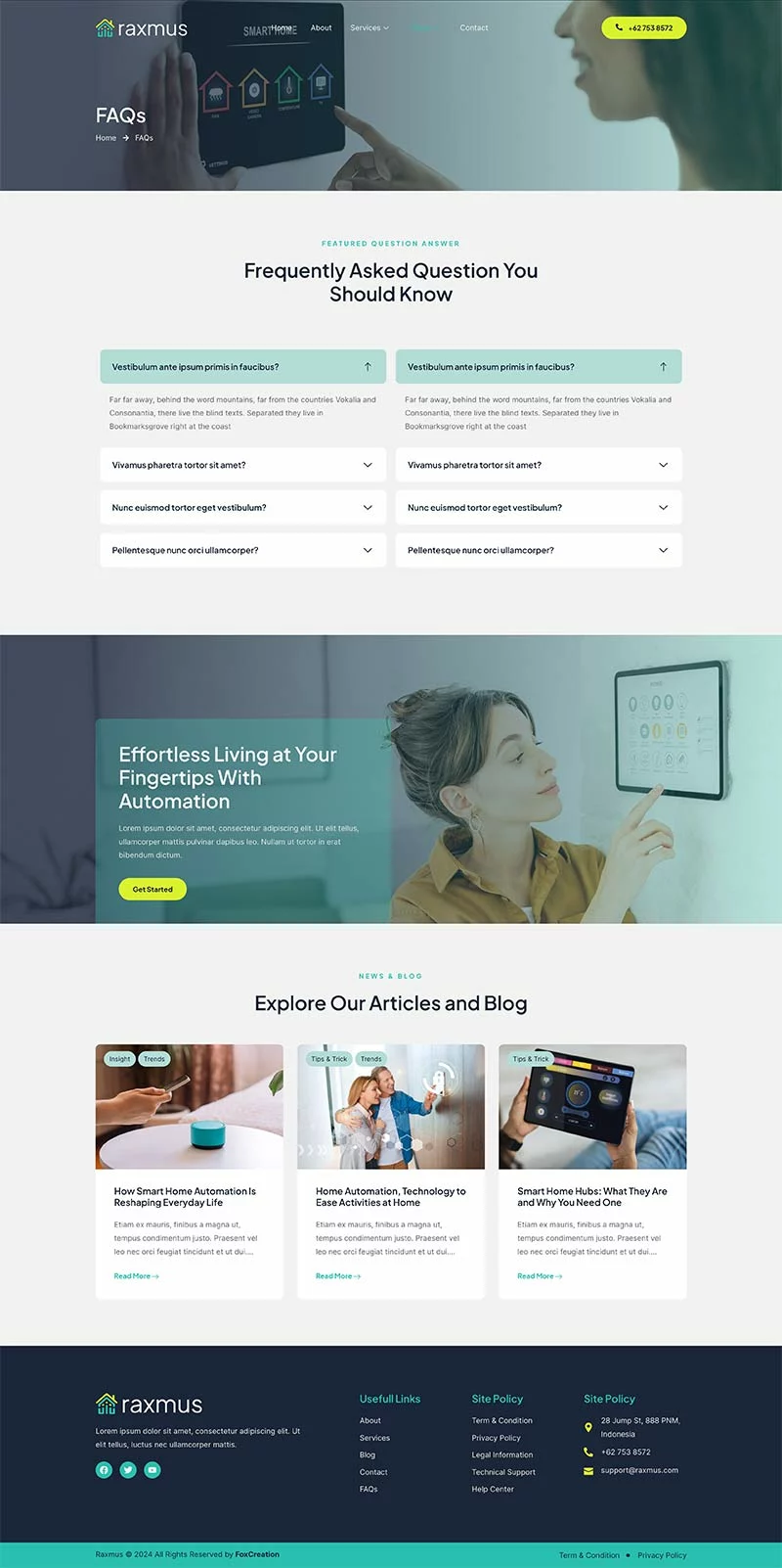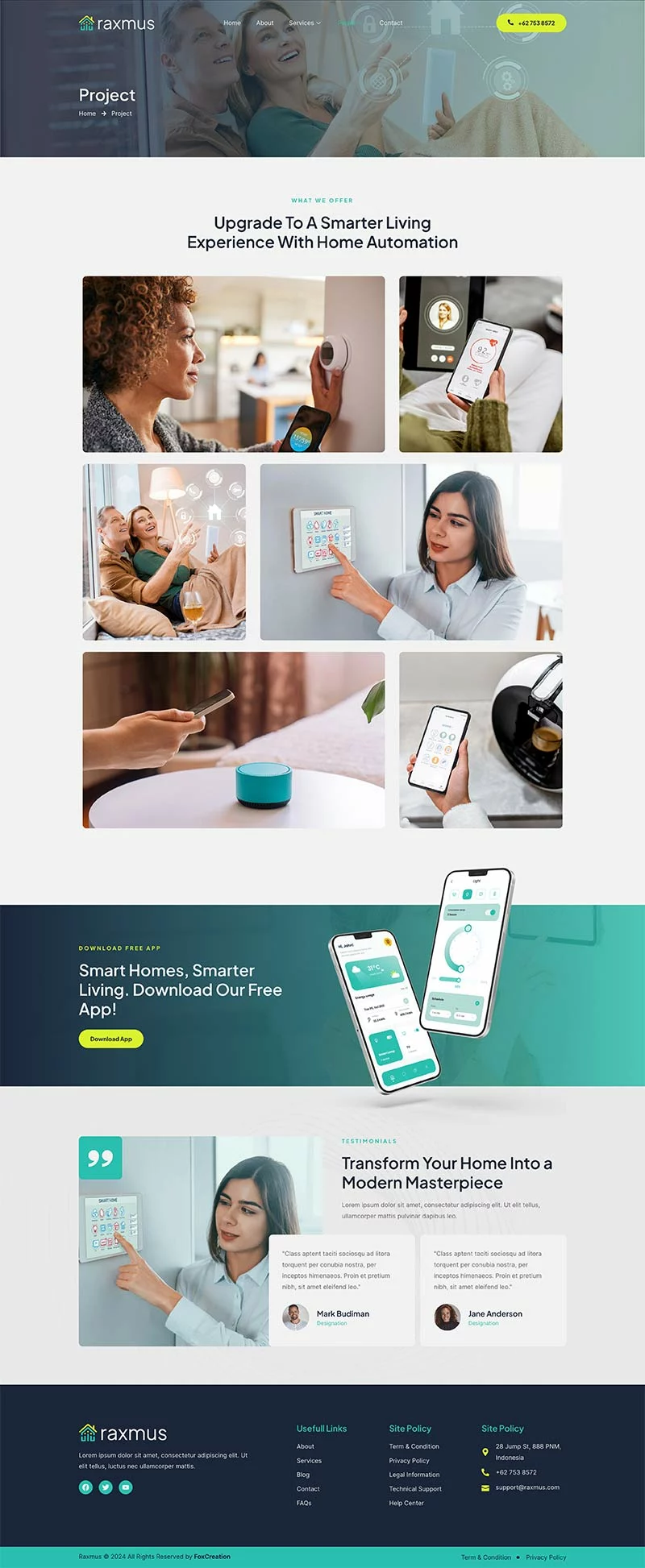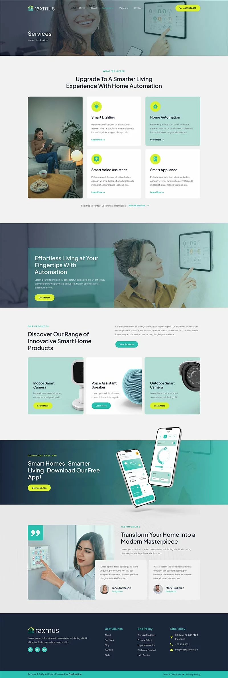 کیت قالب المنتور اتوماسیون خانه هوشمند Raxmus برای کسبوکارهایی که خدمات اتوماسیون خانه هوشمند، دستگاههای خانه هوشمند، راهحلهای امنیتی خانگی و سایر مشاغل مرتبط با فناوری را ارائه میدهند، مناسب است. شما میتوانید به راحتی تخصص خود در زمینه اتوماسیون خانه هوشمند و مزایای آن را به نمایش بگذارید.