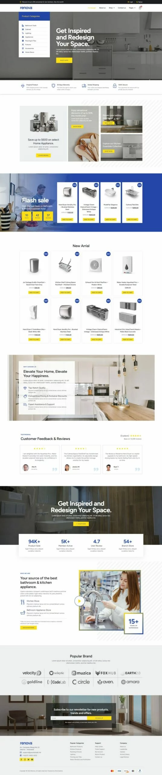 کیت قالب Renova یک ابزار قدرتمند برای ساخت وبسایتهای فروشگاهی مرتبط با لوازم آشپزخانه، حمام و بازسازی است. با طراحی حرفهای و مدرن، این کیت به شما امکان میدهد تا وبسایتی کاربرپسند و جذاب بسازید که محصولات و خدمات شما را به بهترین شکل به نمایش بگذارد. این قالبها به راحتی قابل سفارشیسازی هستند و شما میتوانید به سرعت ظاهر وبسایت خود را تغییر دهید. با پشتیبانی کامل از نمای موبایل، وبسایت شما در تمامی دستگاهها به خوبی نمایش داده میشود و تجربه کاربری بهتری را برای بازدیدکنندگان فراهم میکند. افزونههای همراه این کیت، امکانات و قابلیتهای بیشتری را برای وبسایت شما فراهم میکنند و تجربه کاربری بهتری را به ارمغان میآورند.